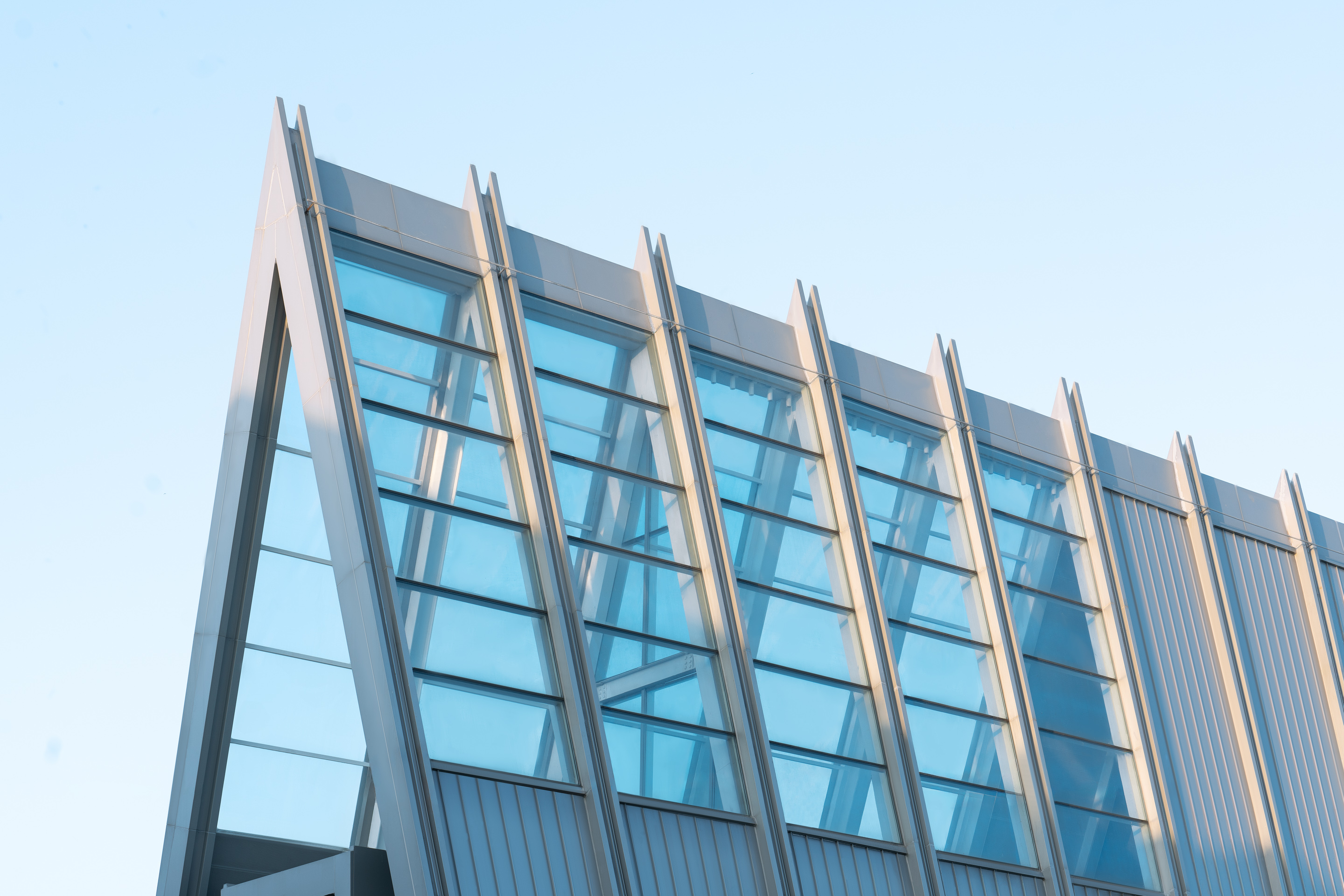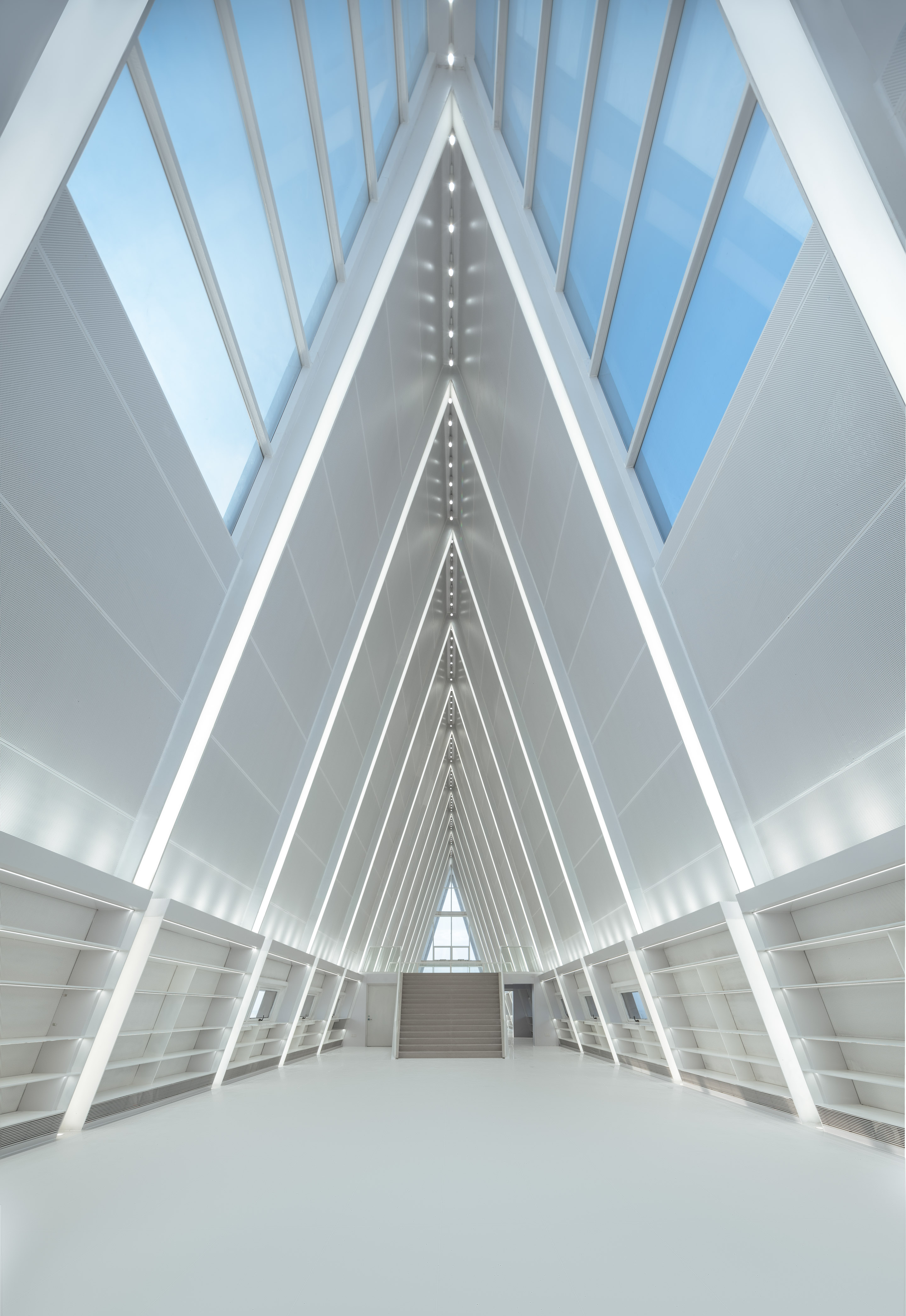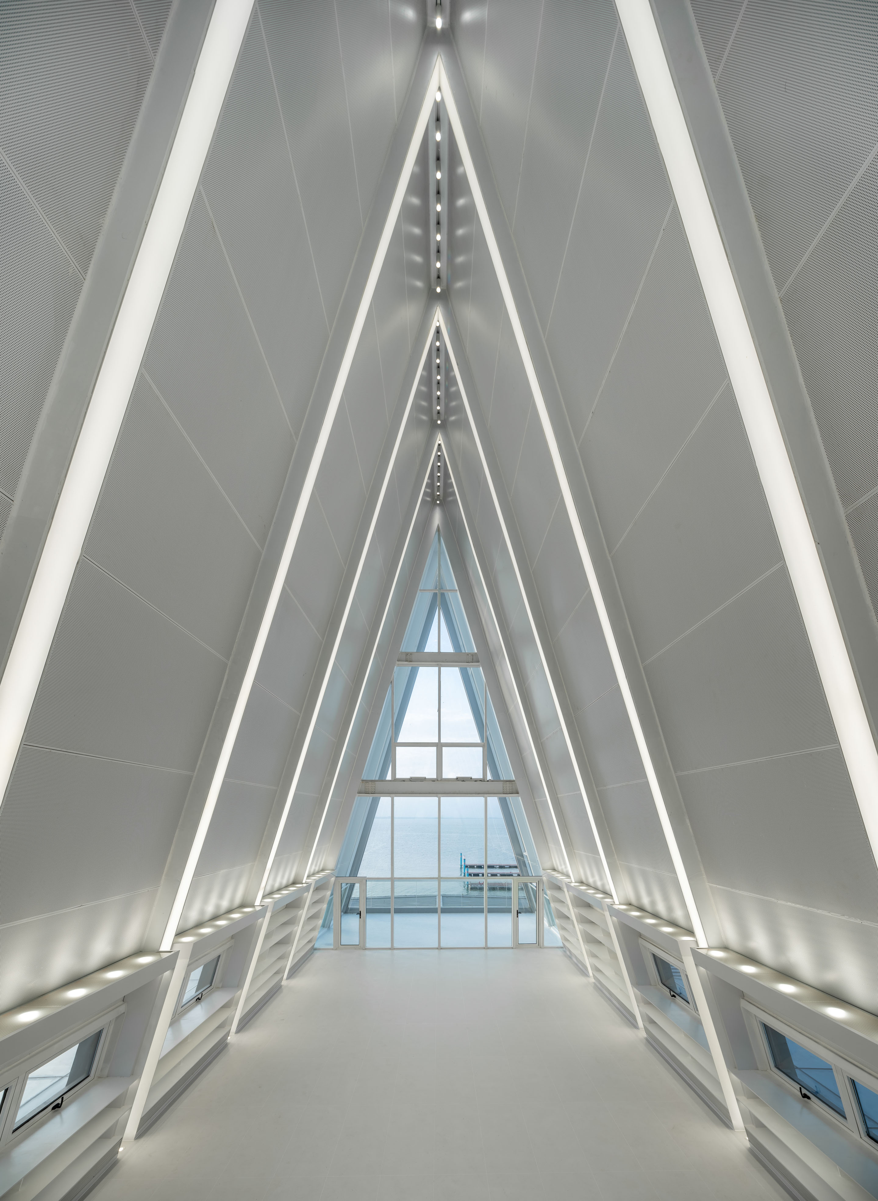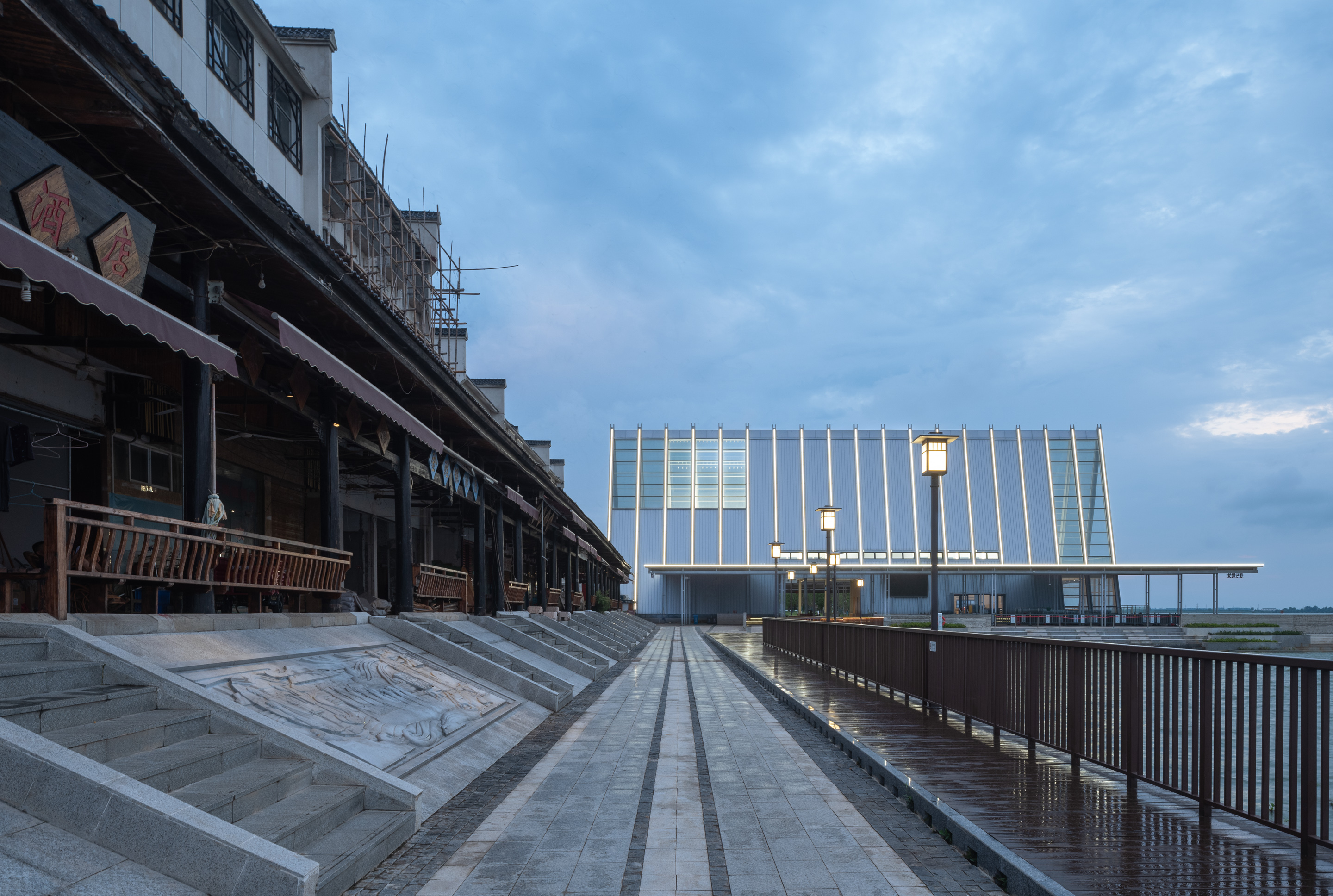设计用一个圆形玻璃天窗布置到平行四边形屋面内引入自然光。蓬下支撑的柱子,通过两根小柱的组合,弱化支撑结构的尺度感,再通过夹住横梁的抬梁方式,以更加轻巧的结构呈现。 建筑的序列被3m的斜柱规训,广场的景观铺装也遵循这个3m的控制。屋面被银灰色铝镁锰板覆盖,斜柱外包铝合金板设计成工字造型。蓬中间高起的游客中心,一层容纳非高峰客流时段的等候和消费等功能;二层高耸的空间,则承担了水上“灯塔”的象征性意义。