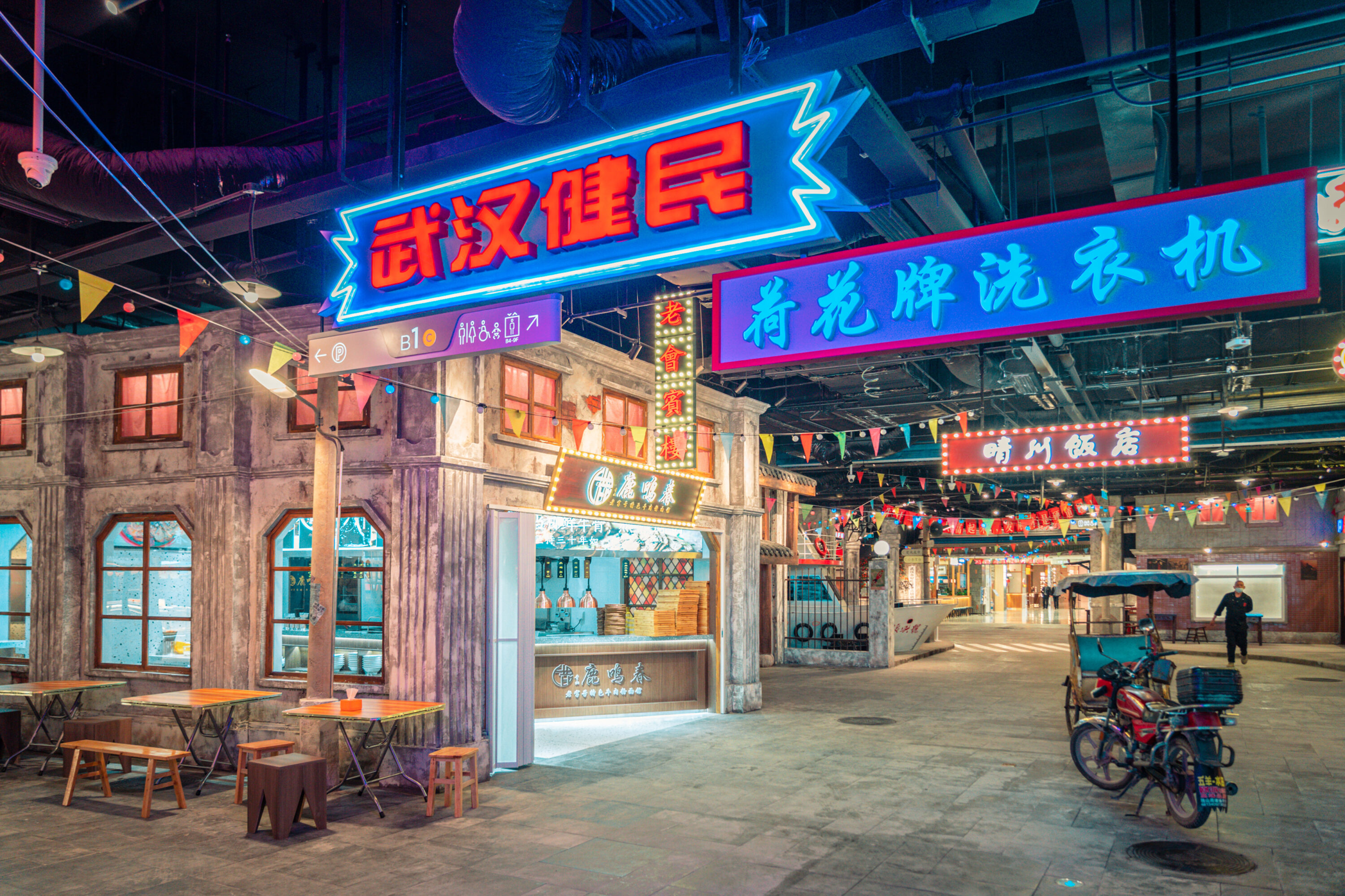 本案业主为武汉市老牌商业集团,业主希望在位于亚洲最大的单体商业项目中打造一条富有“老武汉”特色的美食街区。经过18个月的设计和跟踪,我们在3300平米的负一层打造了一个八九十年代的老武汉,将武汉当地独特的三镇、码头、商业、市井的文化融入复古街区的设计当中,让游客走街串巷,逛吃其中。打造“外地人共情、武汉人共鸣”与众不同的消费体验空间。