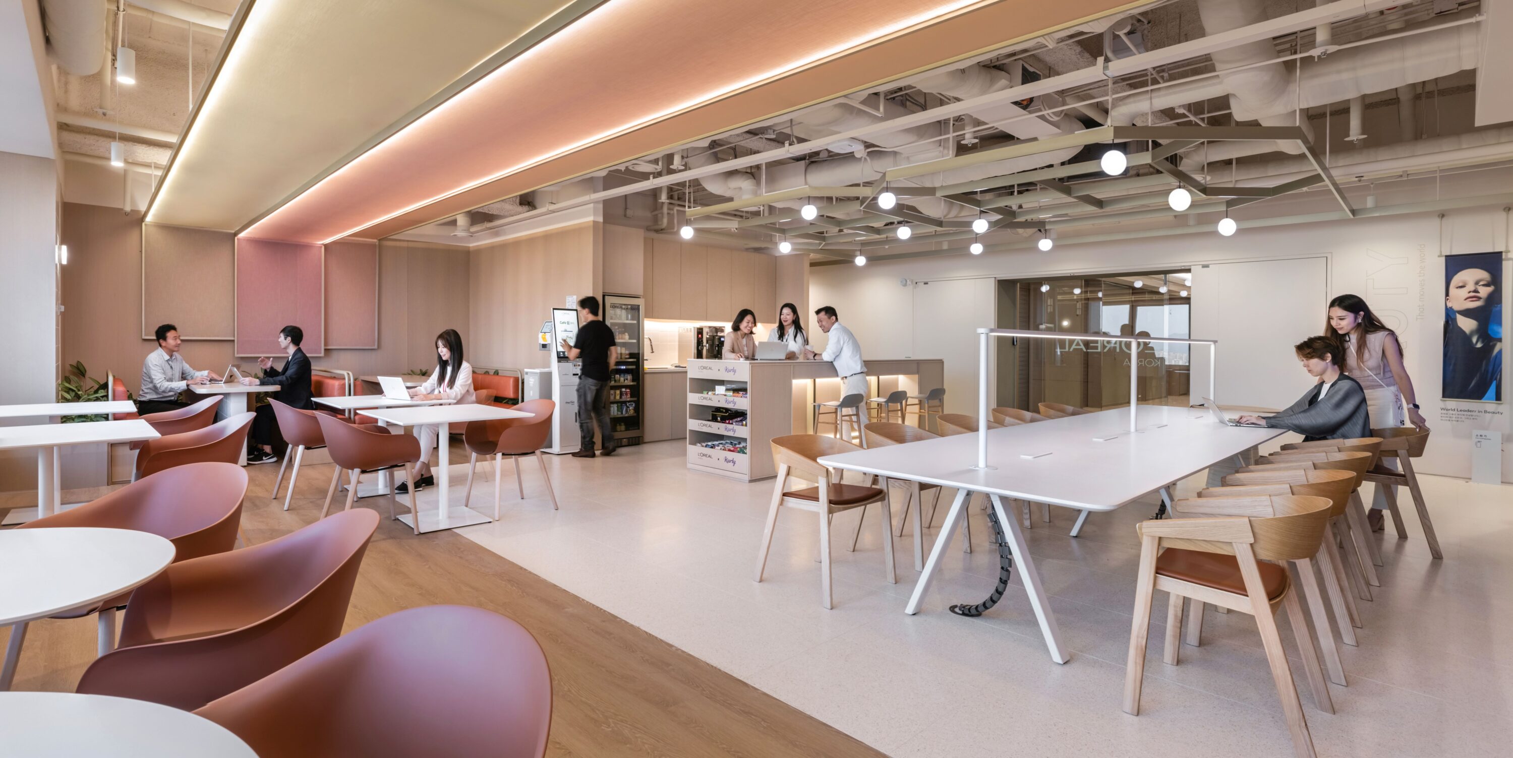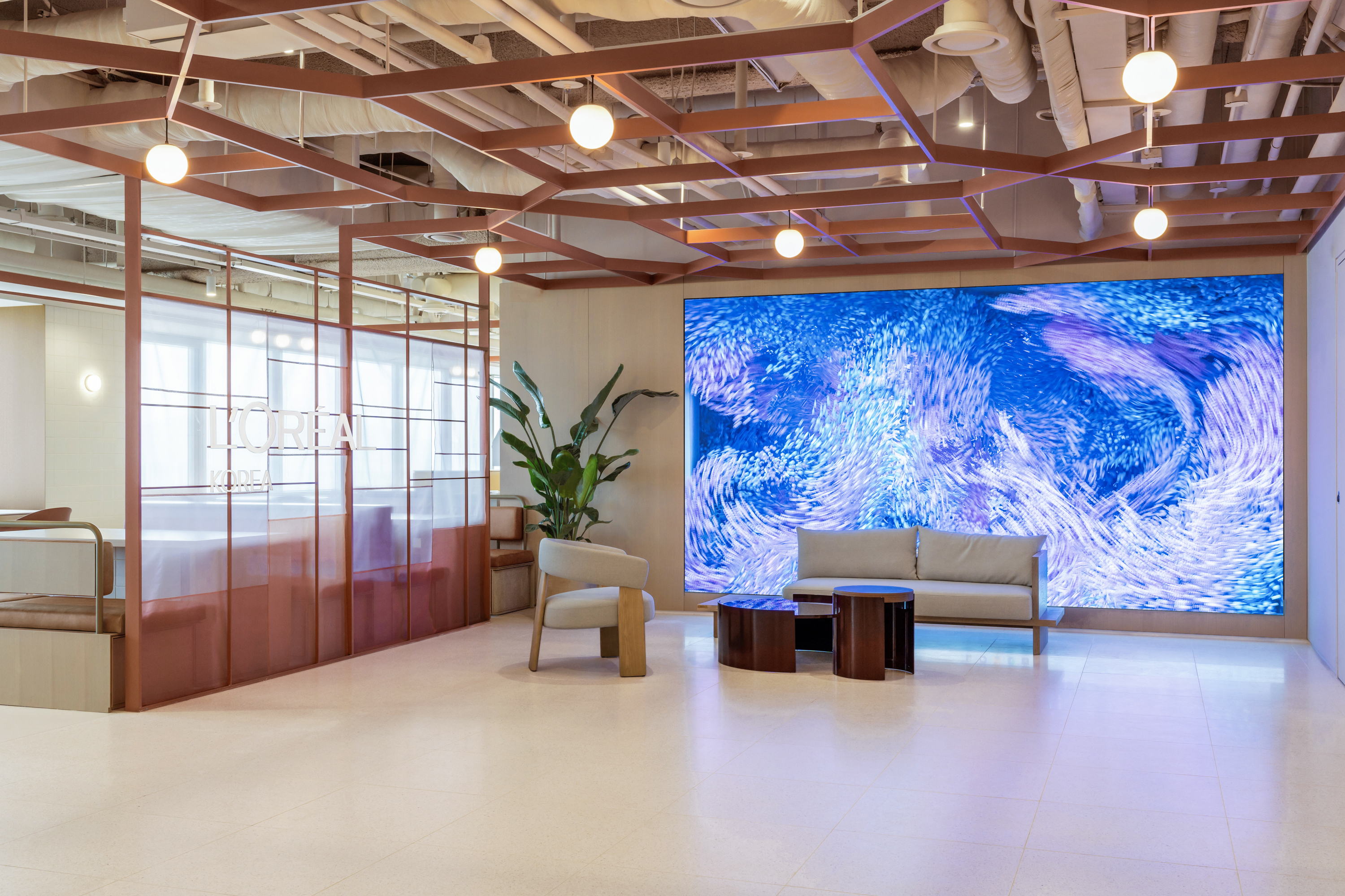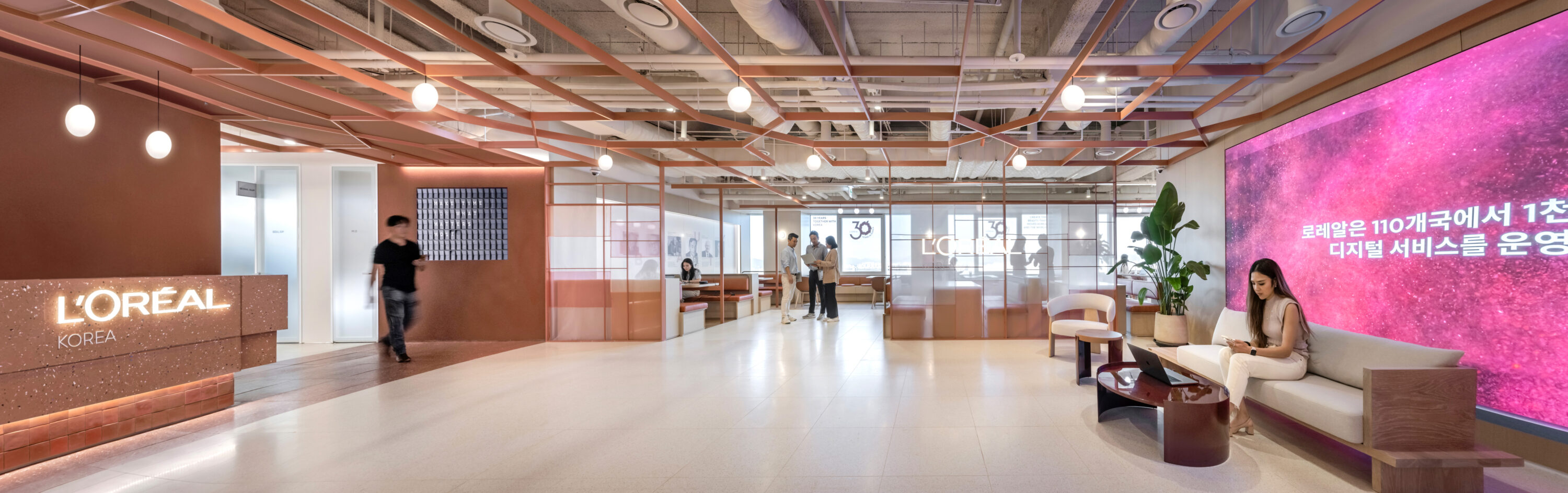 欧莱雅韩国首尔总部办公空间以“共生”为核心理念,融合品牌美学、首尔城市特色与协作文化,打造兼具灵活性与归属感的混合办公环境。设计灵感源自首尔的城市脉络,以艺术性的线性与曲线构建空间动线,呼应城市交错与秩序之美。本土文化元素如韩屋窗棂与传统布艺 Jo Kak Bo 的融入,则增添空间的人文温度。项目致力于通过开放而多元的设计,提升员工福祉与创造力,并积极回应欧莱雅在ESG可持续发展上的承诺。