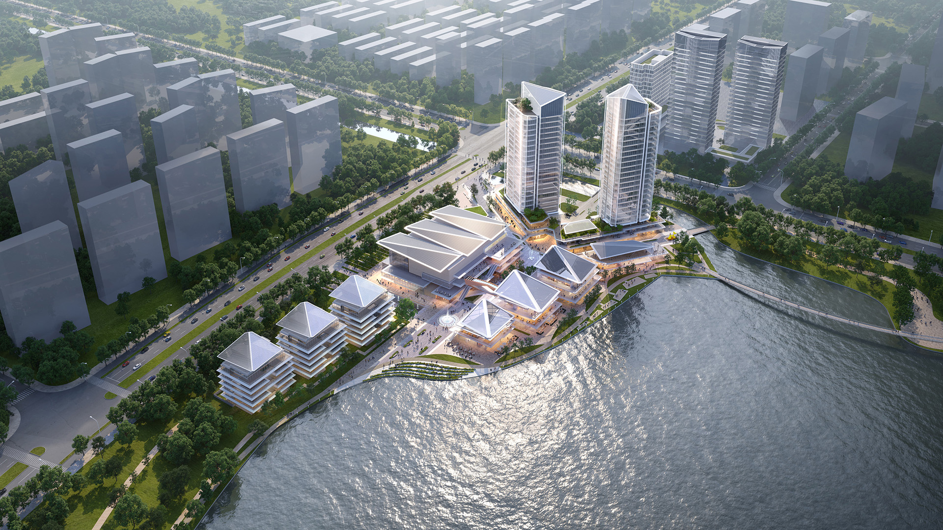 青剑湖商业广场位于苏州青剑湖畔,总面积64800平米,融合住宅、酒店、文化和娱乐,结合周围的公园系统,以生态和公共设施为特色。 它将成为社区的文化中心,包括21500平米高层住宅、8200平米别墅式住宅、16200平米零售、10500平米酒店和5000平米剧院。灵感来自苏州历史悠久的水乡,以折叠屋顶和乡村小径为特色。 从城市景观过渡到自然景观,成为一个充满活力的滨水景点,享有人行步道和自然美景。