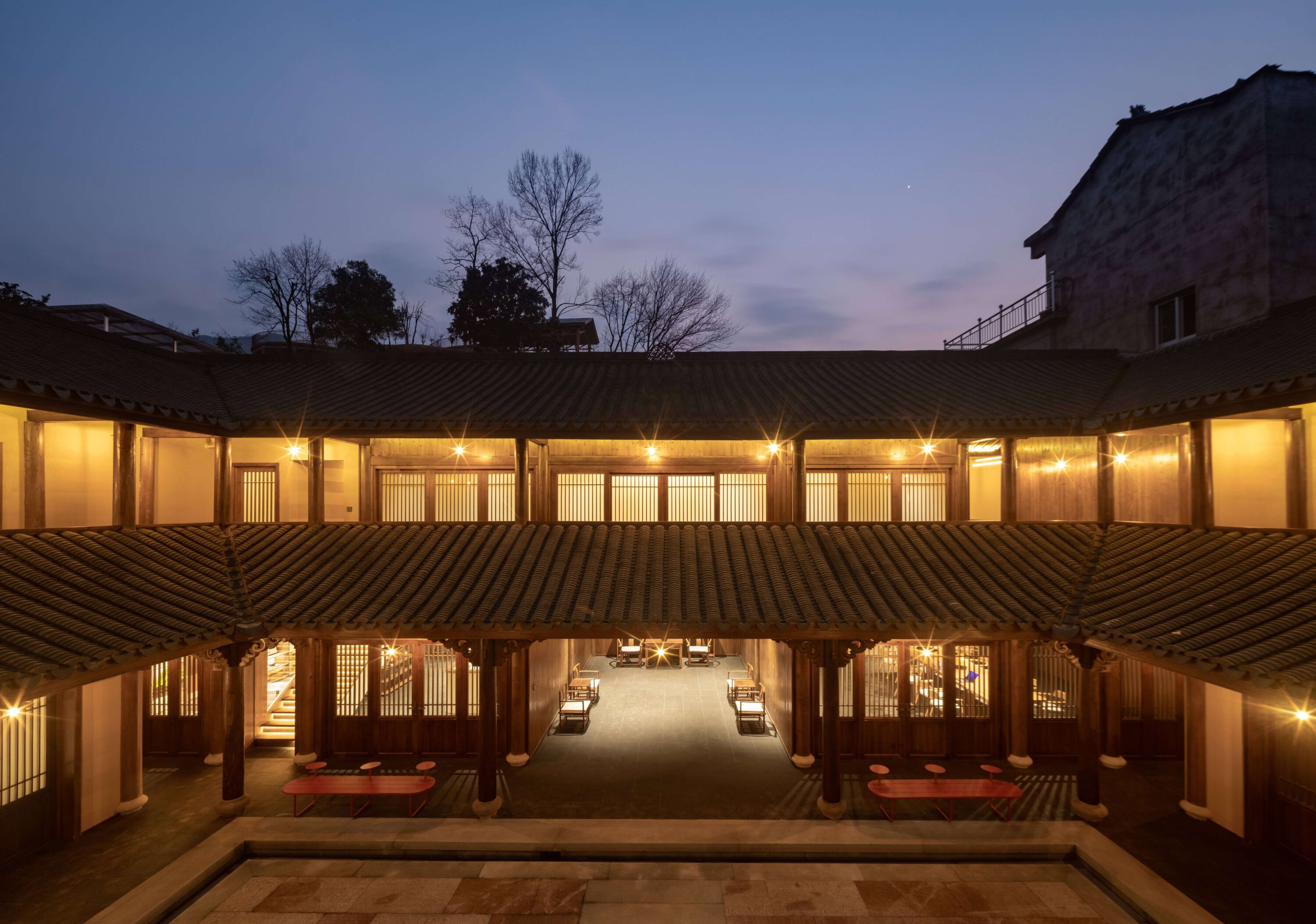 本案以”时空叠合”为核心设计哲学,在历史建筑肌理与现代生活需求之间构建对话,打造一座承载文化记忆、激活空间生命力的诗意栖居之所。设计严格遵循传统四合院”四水归堂”的空间理念,保留抬梁式木构架、青砖马头墙、纹样砖雕等建筑基因。主厅保留”明堂”格局,定制夯土墙面肌理源自本地黄泥采样分析,二层置入回廊串联多功能区和客房区,拉近了人与自然的距离,展现了开合有序的空间变化,冲淡了建筑内外部的界限。