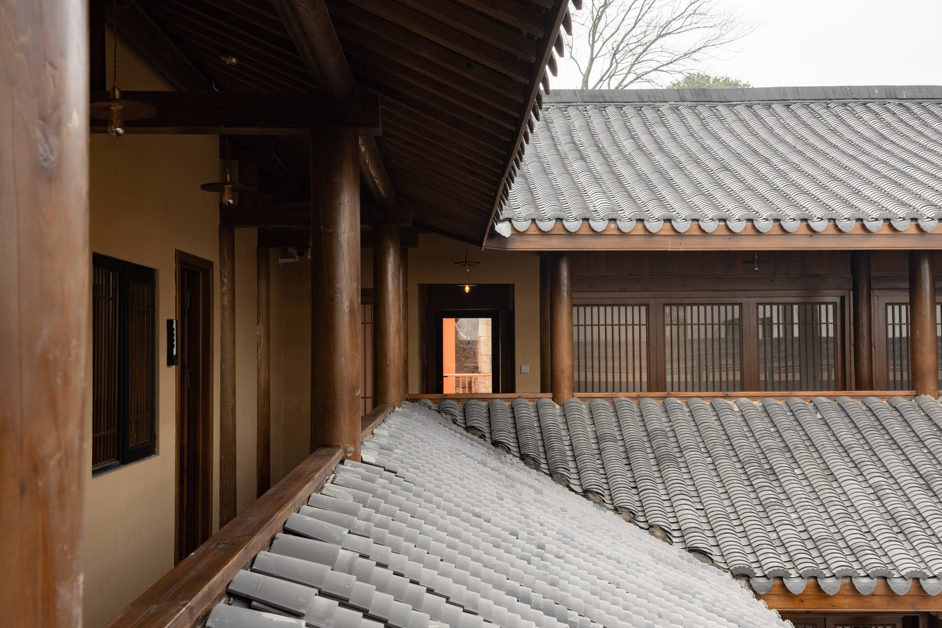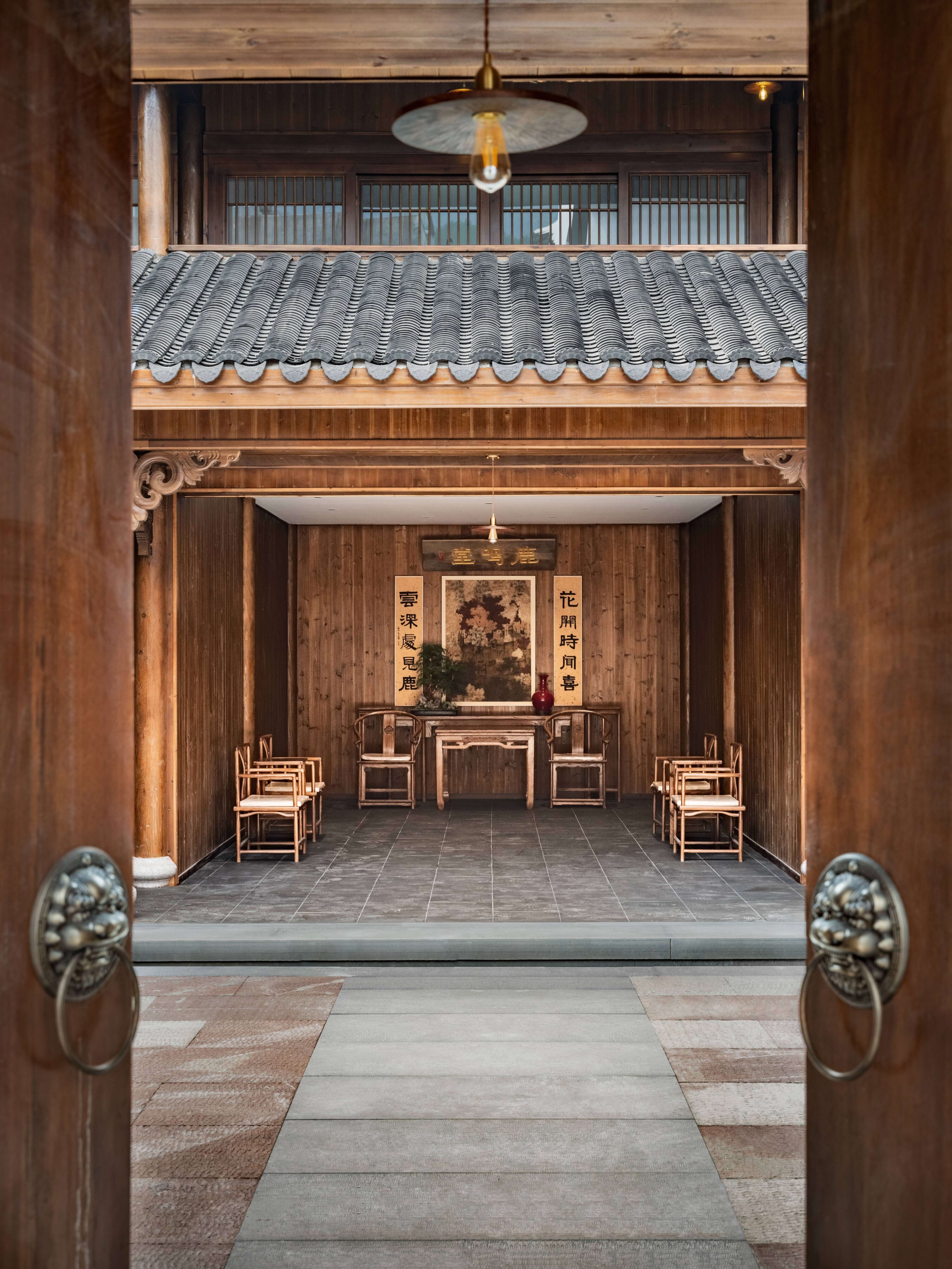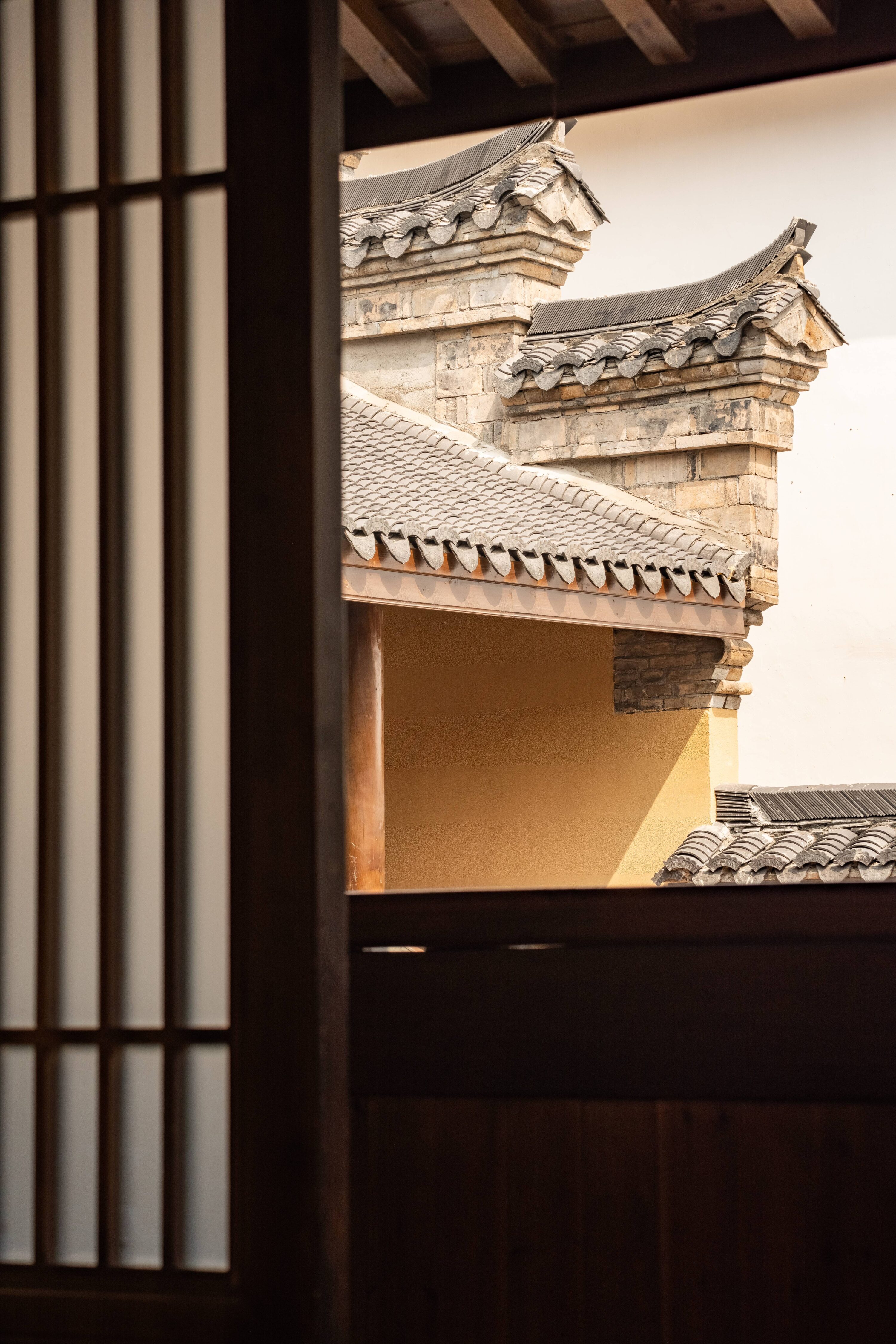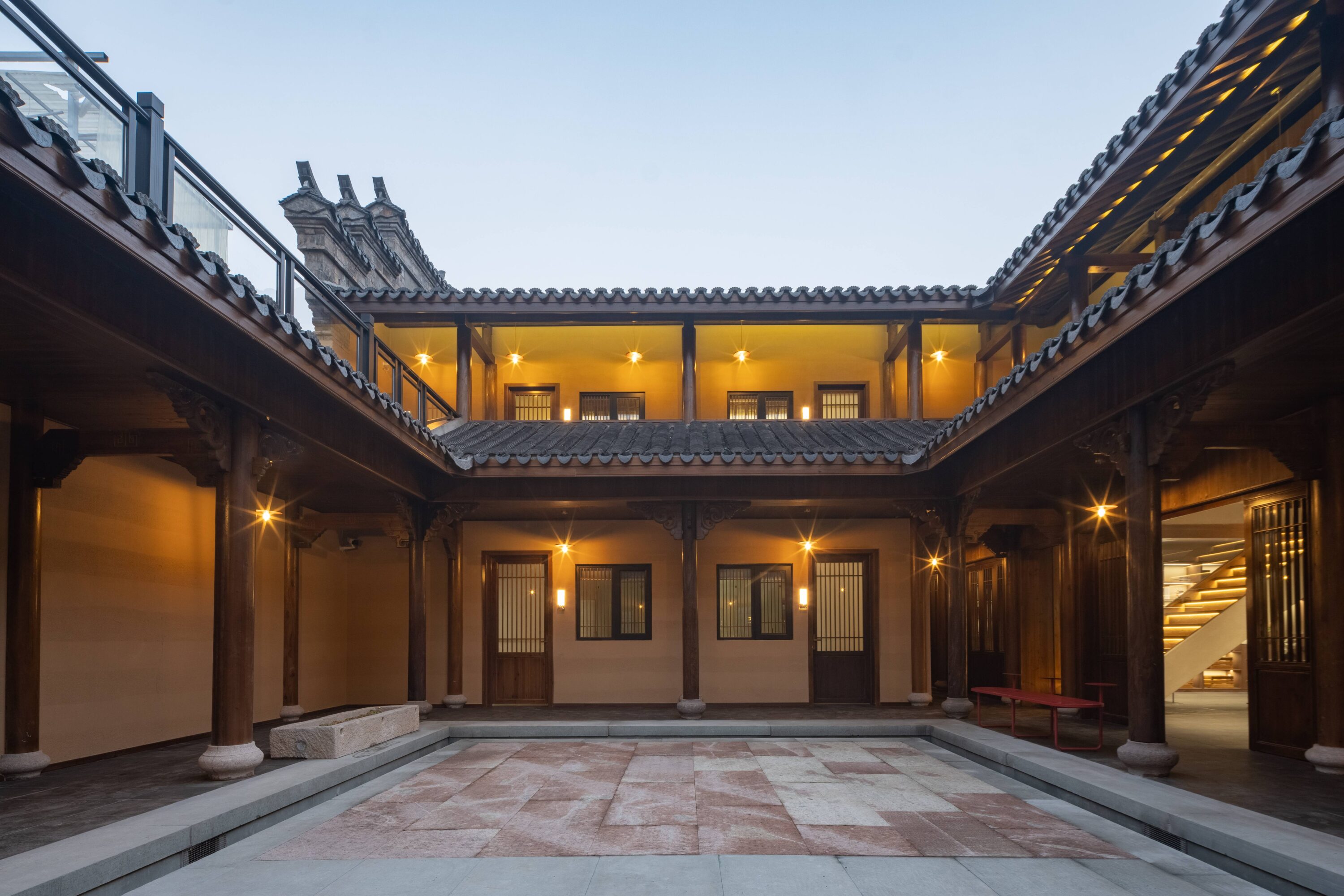 本案以”时空叠合”为核心设计哲学,在历史建筑肌理与现代生活需求之间构建对话,打造一座承载文化记忆、激活空间生命力的诗意栖居之所。设计严格遵循传统四合院”四水归堂”的空间理念,保留抬梁式木构架、青砖马头墙、纹样砖雕等建筑基因。主厅保留”明堂”格局,定制夯土墙面肌理源自本地黄泥采样分析,二层置入回廊串联多功能区和客房区,拉近了人与自然的距离,展现了开合有序的空间变化,冲淡了建筑内外部的界限。
