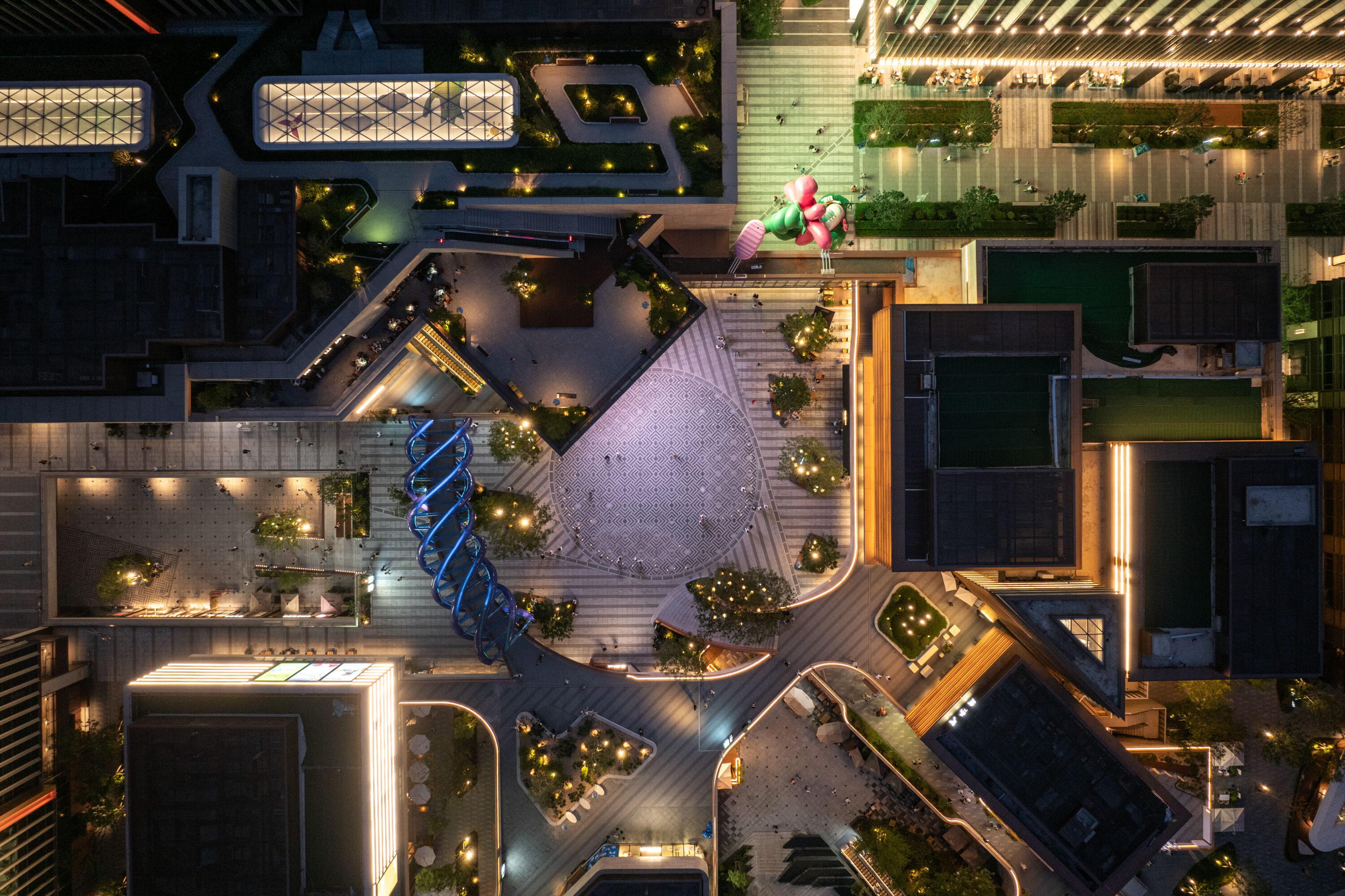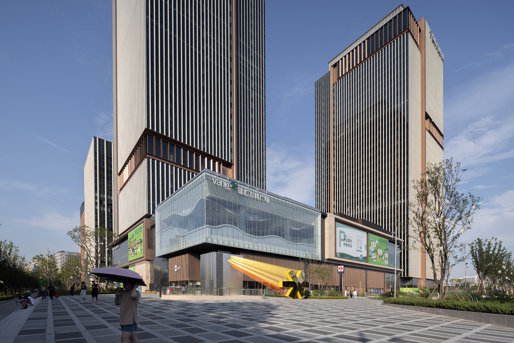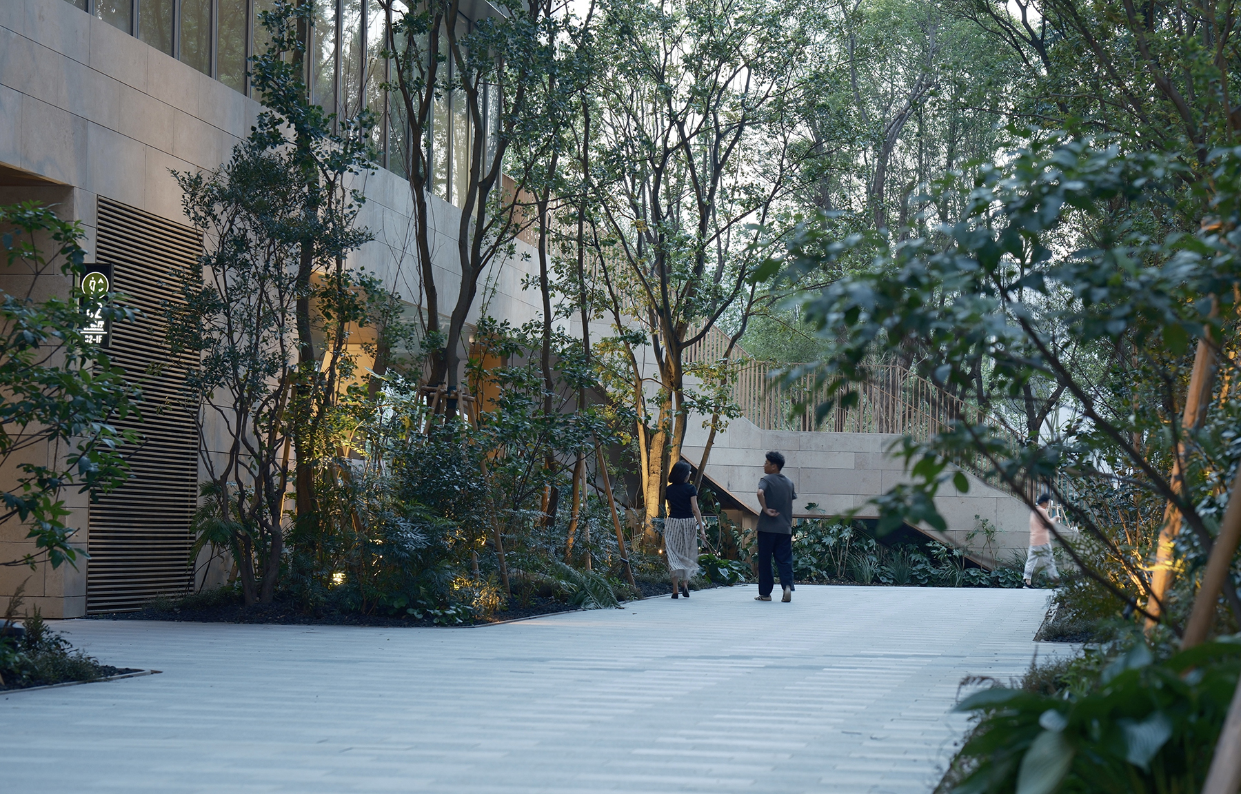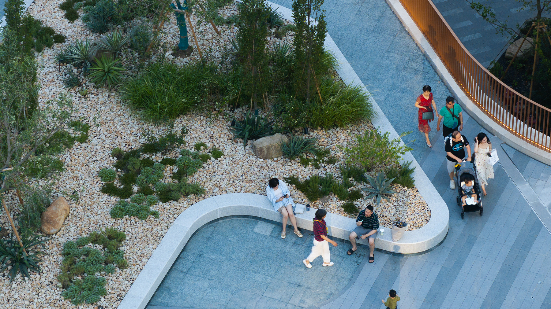 上海徐汇万科中心历经12年开发,以“山林中城”为核心理念,整合三期共72万㎡综合体。项目毗邻上海南站枢纽,通过“POD(公园×TOD)”模式,以“高效链接”策略缝合被割裂的场地,构建立体步行网络串联商业、办公与绿轴公园;“自然共生”策略通过生态圈分层与杂木林种植,打造低维护、可持续景观。设计强调“日常致远”,以人性化公共空间抵御极端气候考验,平衡城市更新与生态韧性,重塑可持续城市肌理。