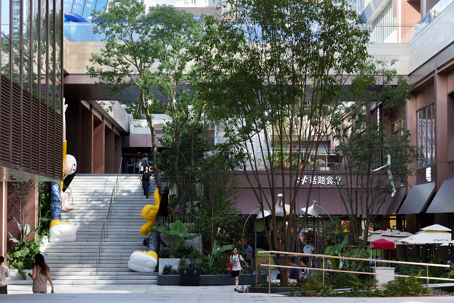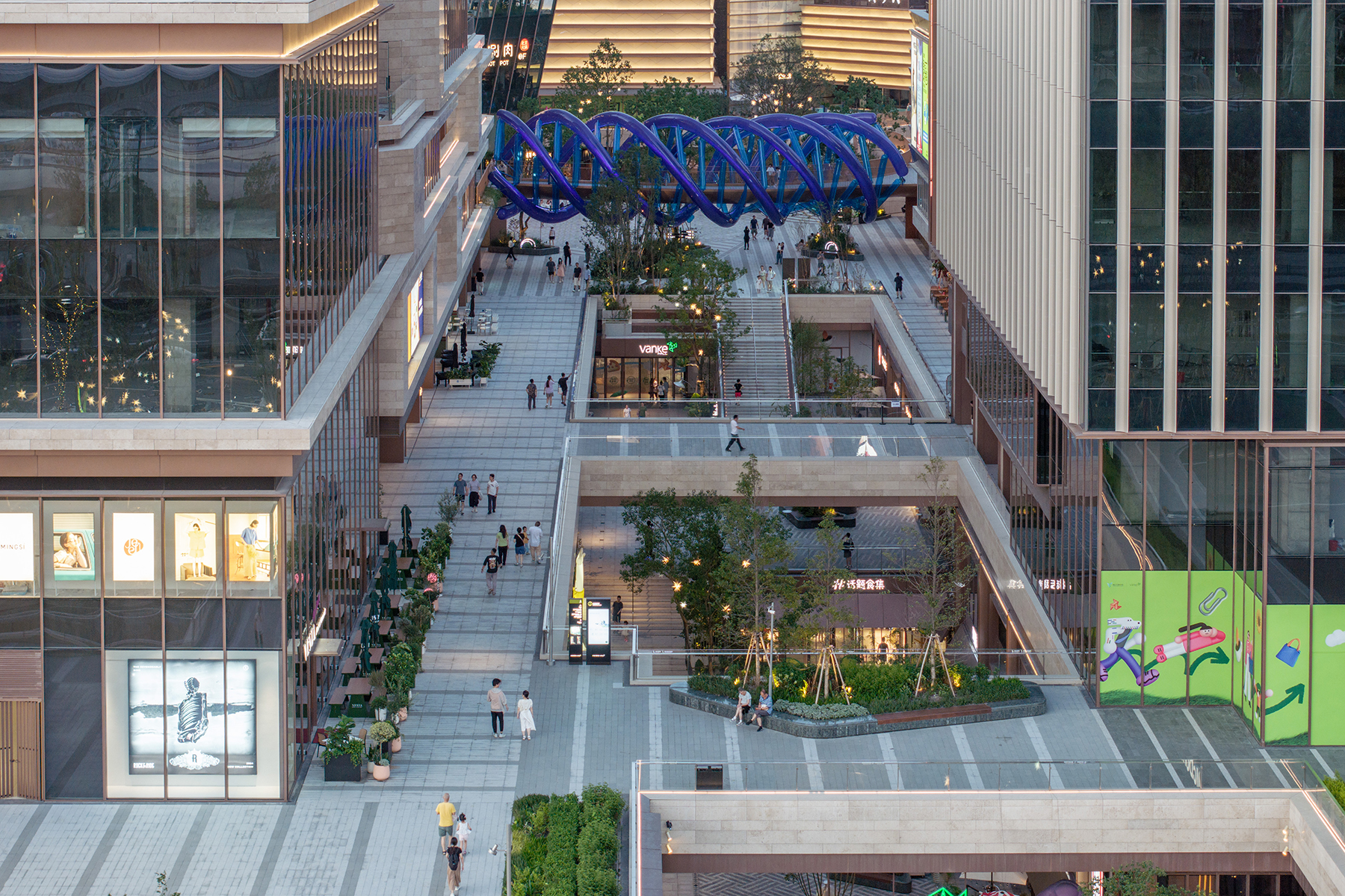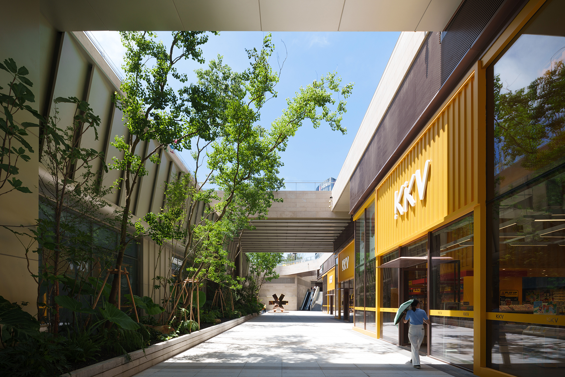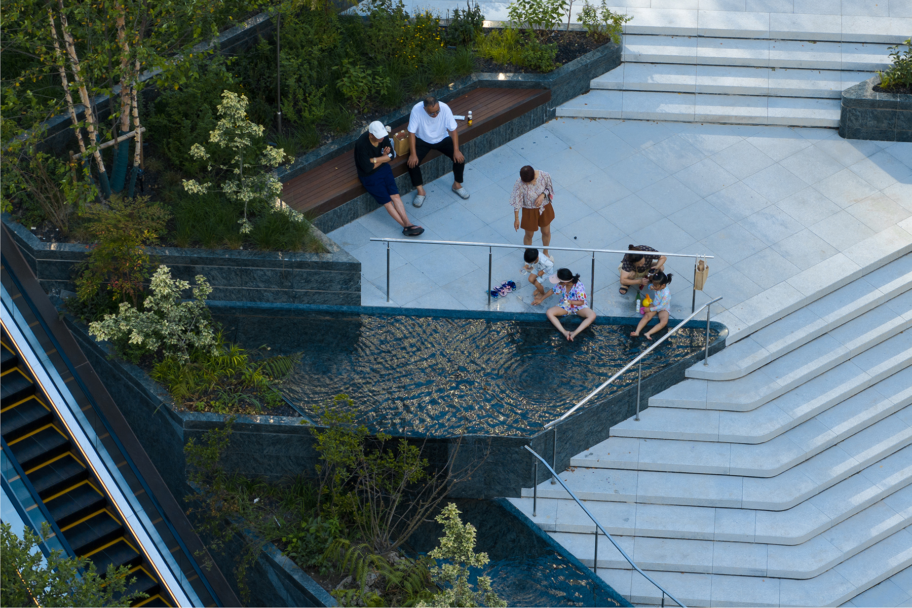 上海徐汇万科中心历经12年开发,以“山林中城”为核心理念,整合三期共72万㎡综合体。项目毗邻上海南站枢纽,通过“POD(公园×TOD)”模式,以“高效链接”策略缝合被割裂的场地,构建立体步行网络串联商业、办公与绿轴公园;“自然共生”策略通过生态圈分层与杂木林种植,打造低维护、可持续景观。设计强调“日常致远”,以人性化公共空间抵御极端气候考验,平衡城市更新与生态韧性,重塑可持续城市肌理。