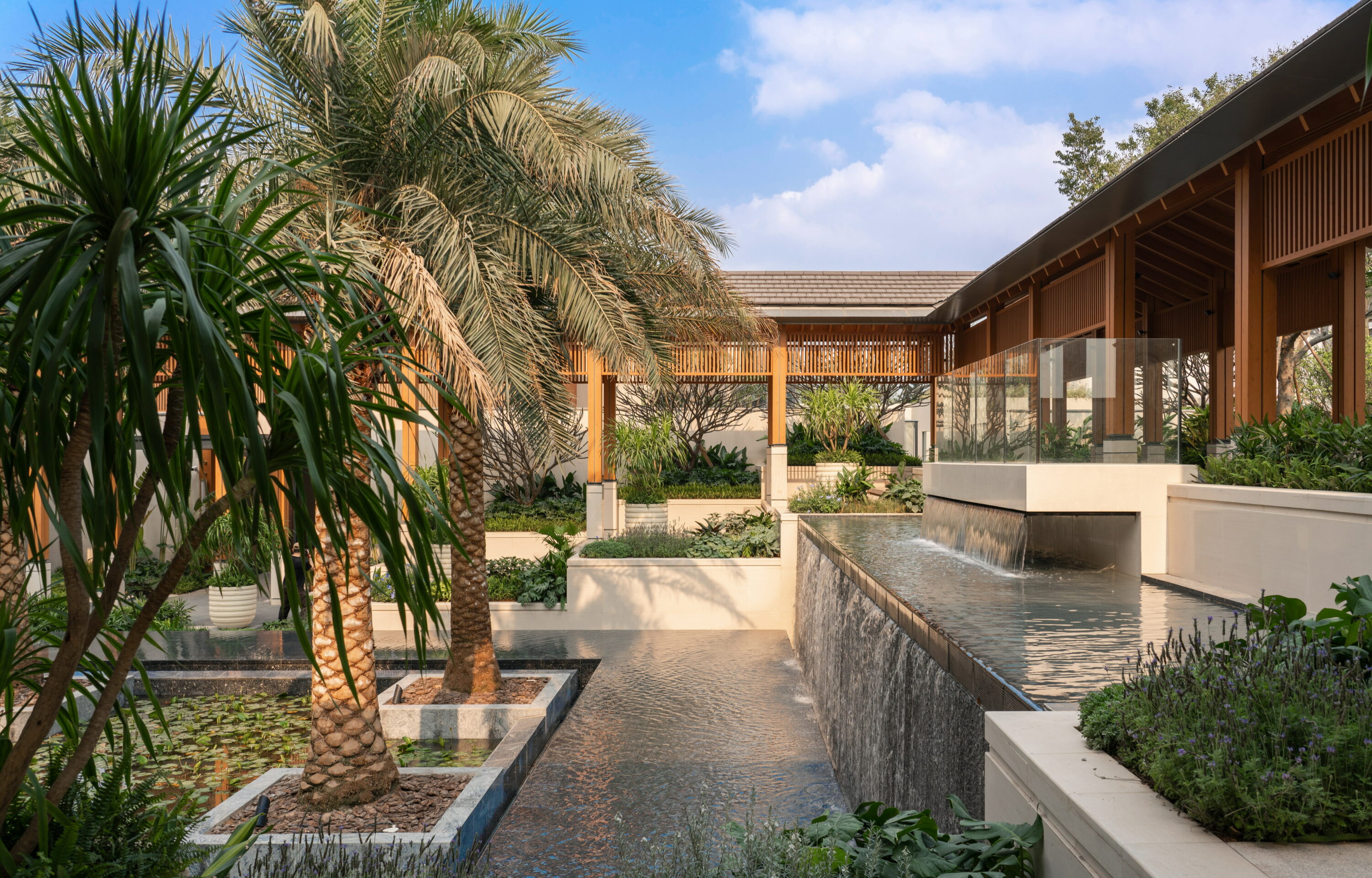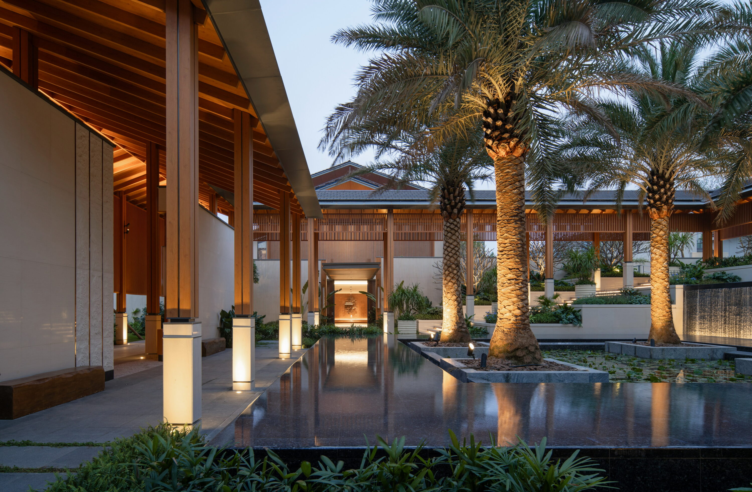 在美丽的中山,设计者打造了一个带有岭南地域文化的“原墅”生活场。场地拥有迷人的景观资源,东侧紧邻城市公园,距珠江海面仅1.5KM。从开阔的沿海水面到青翠的公园绿地,整体氛围是与自然和谐相处的奢华体验。对于将在此地新生的展示区,设计师希望最大程度地保留沿海环境,释放海面疗愈的度假感受。让归家者能在这片林、海、雾环绕拥抱的土地中,轻轻地放下自己,找到心的归处。