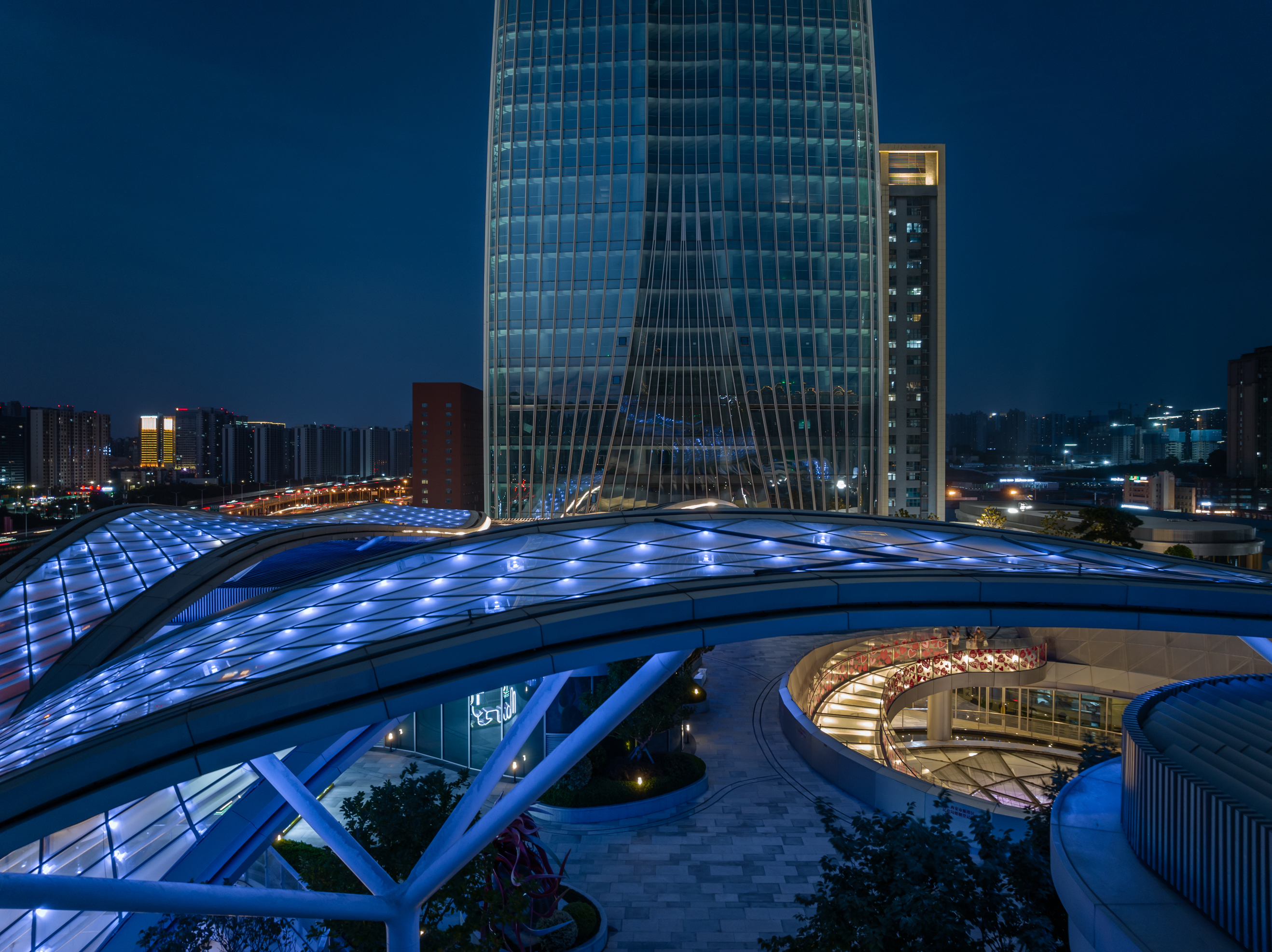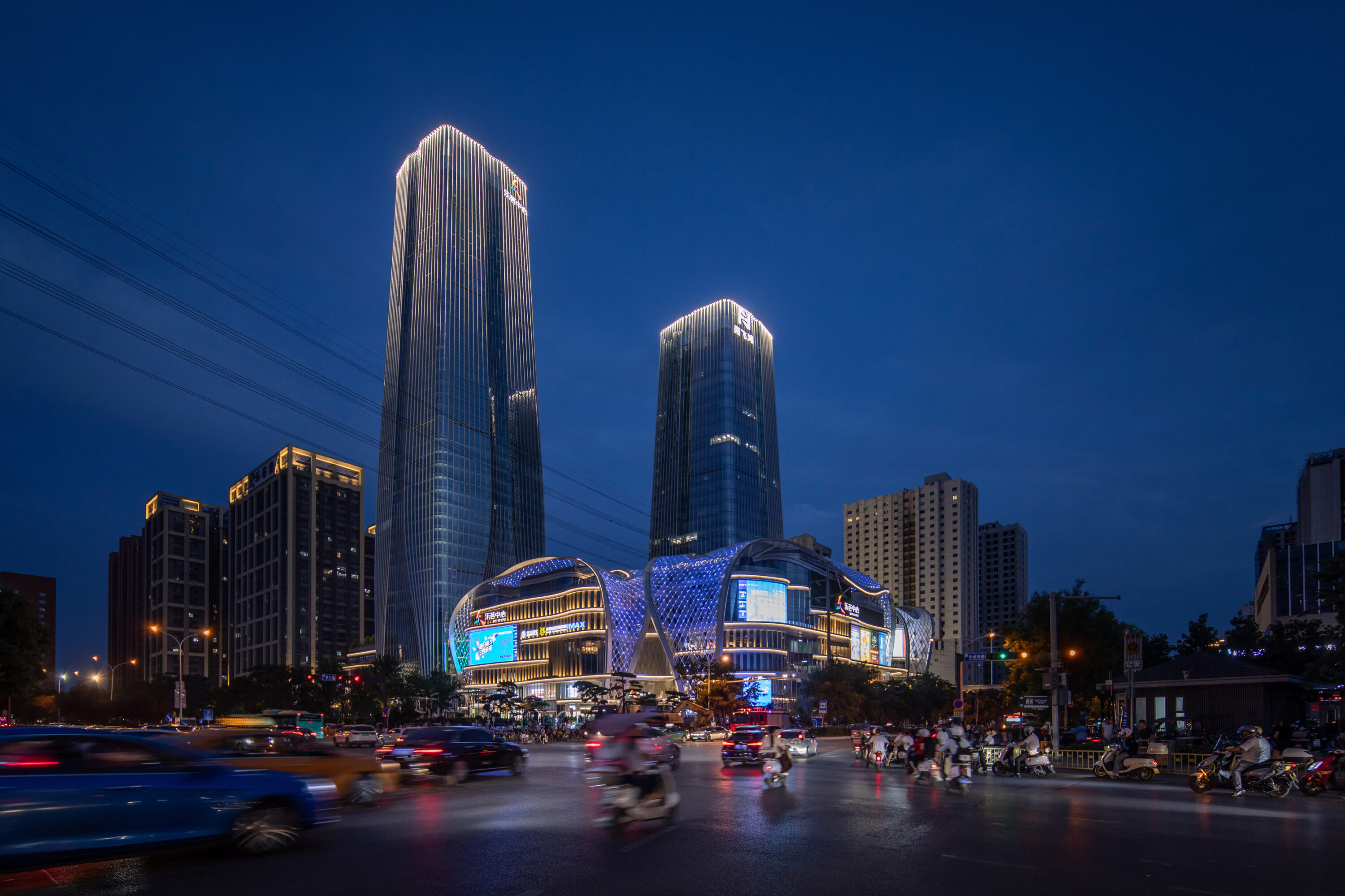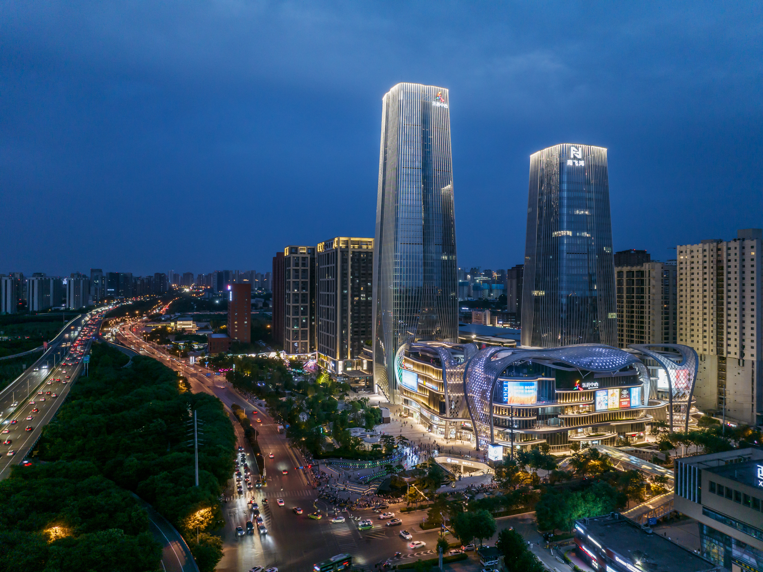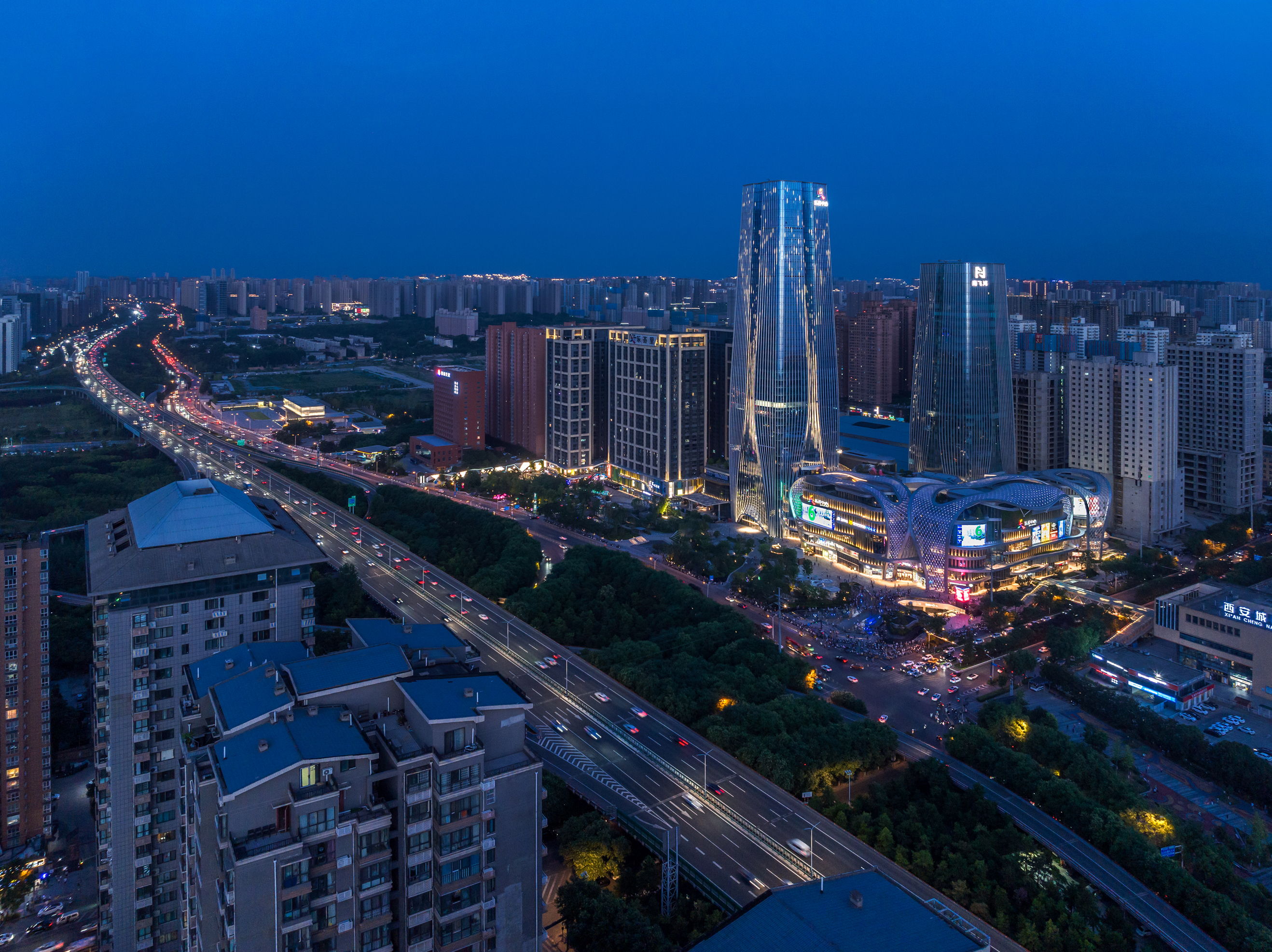 西安南飞鸿乐荟中心坐落于西安雁塔区中轴线核心区域,项目由著名建筑事务所Aedas设计,总建筑面积45万㎡,是一个集商业、办公、酒店、公寓多元业态于一体的城市商业综合体,建筑超高层双子塔为200米 & 154米,更新了城市天际线,同时拥有超3万㎡室外主题公园和1万㎡室内立体绿化,生态自然的主题空间概念使之成为西安城市商业综合体新典范,为城市休闲娱乐注入了新的活力,成为西安理想生活新地标。