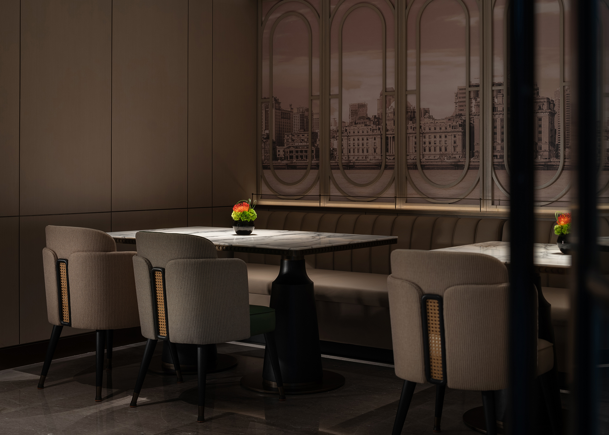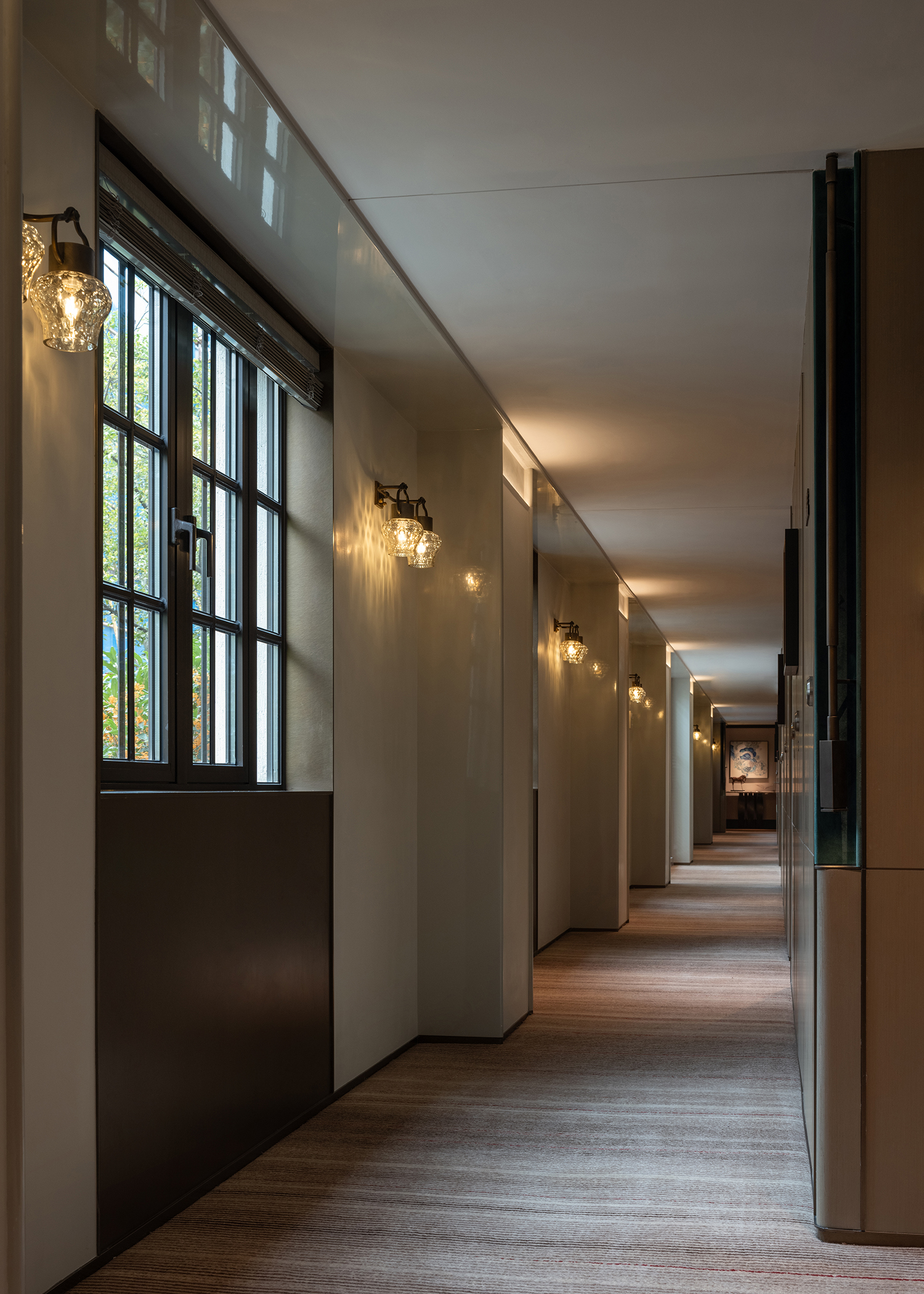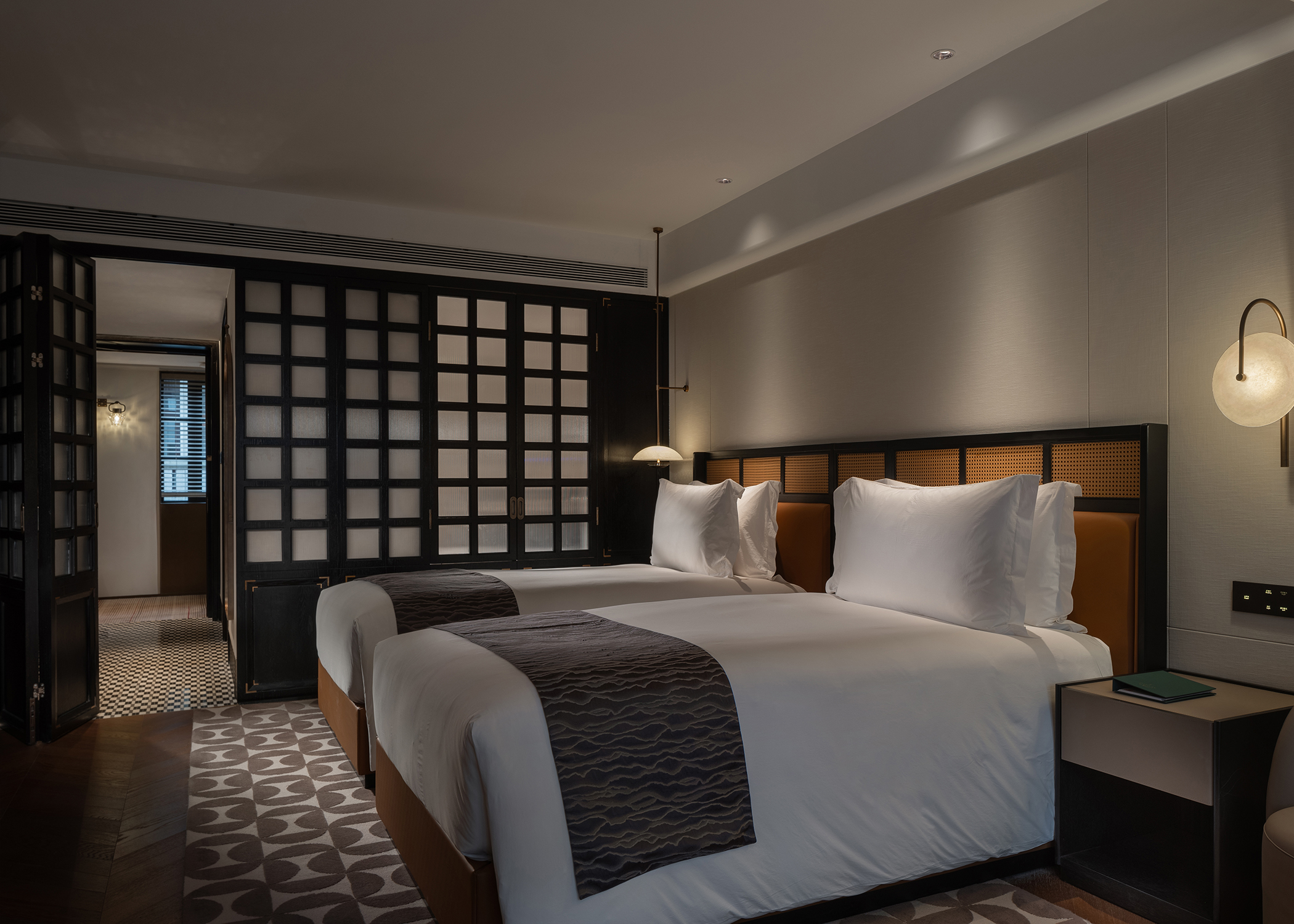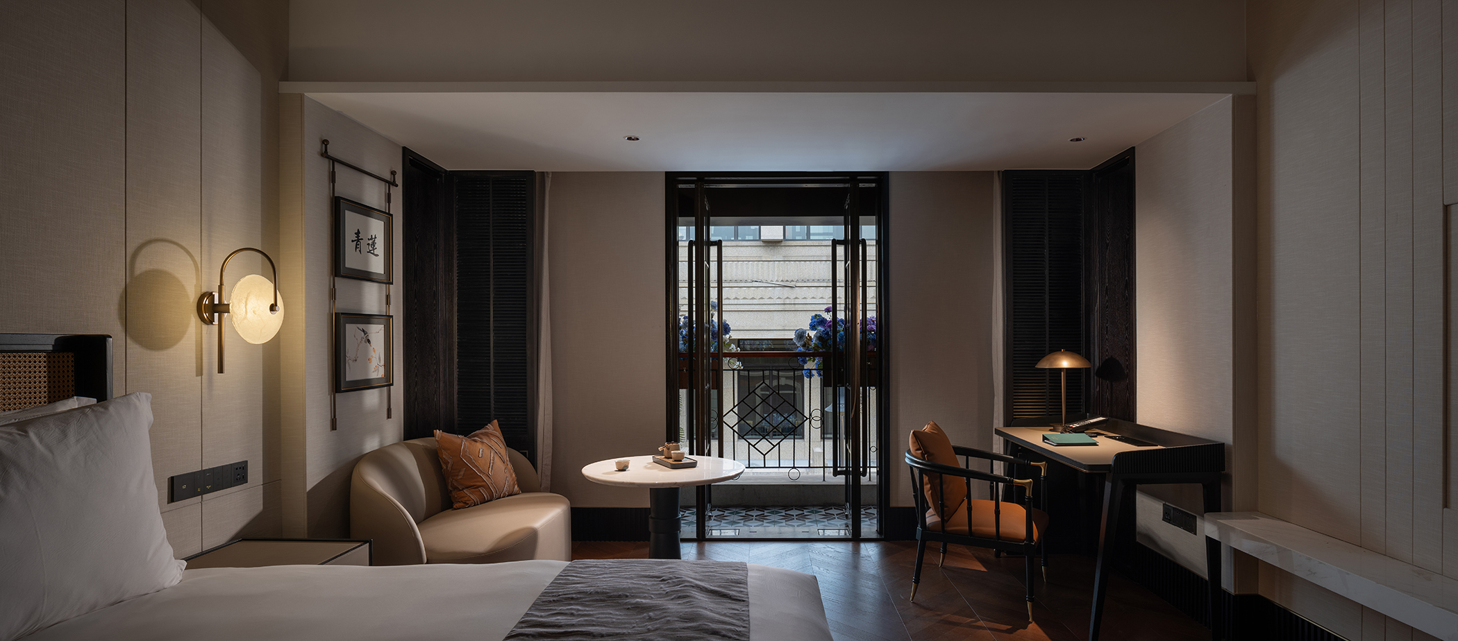 璟源·露香园酒店的室内设计融合了上海复古风情与现代雅致美学。客房设计灵感源自昔日顾氏风雅生活,以东方风格为基调,融合青莲、万竹等主题刺绣,展现出独特的文化韵味。室内采用深色木作墙面与浅色壁纸交织,地面铺设暖色鱼骨拼地板,搭配复古家具与现代艺术摆件,营造出温馨而典雅的氛围。走廊陈列民国时期的上海风情,重现老城厢的烟火气。整体设计在细节中融入上海的历史文化记忆,为宾客打造一场穿越时空的艺术之旅。