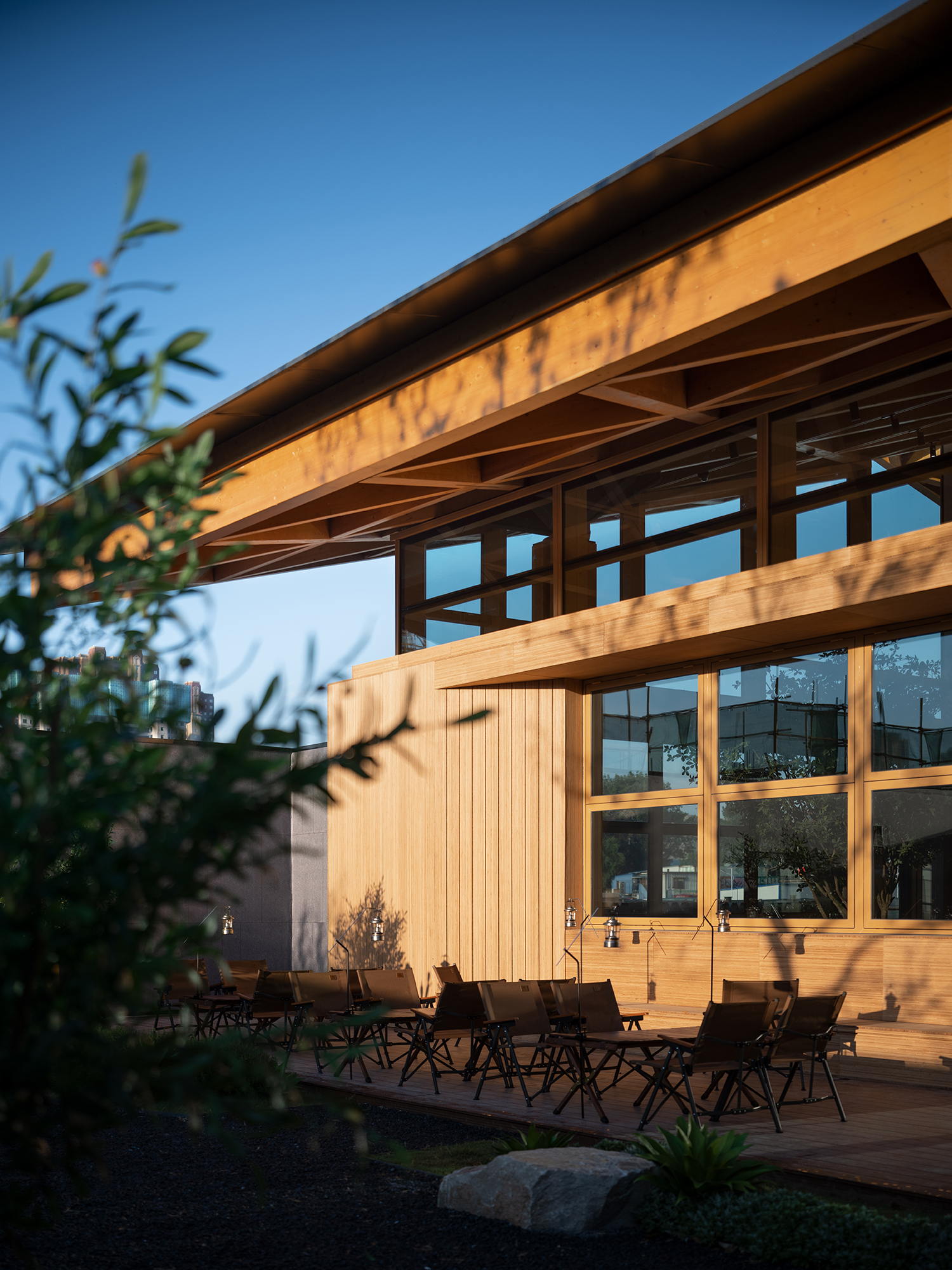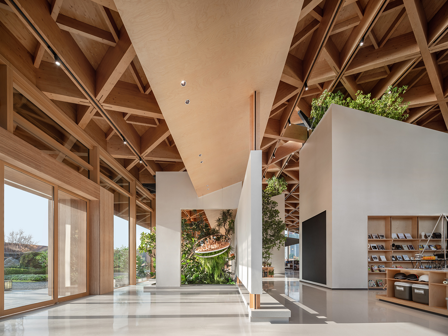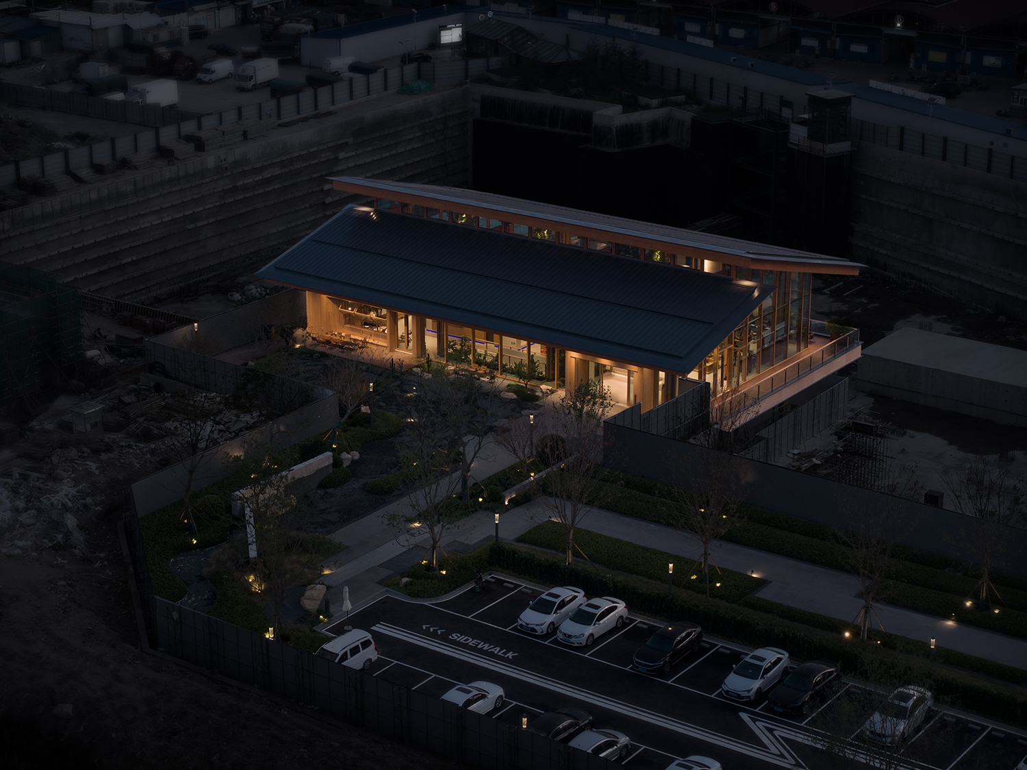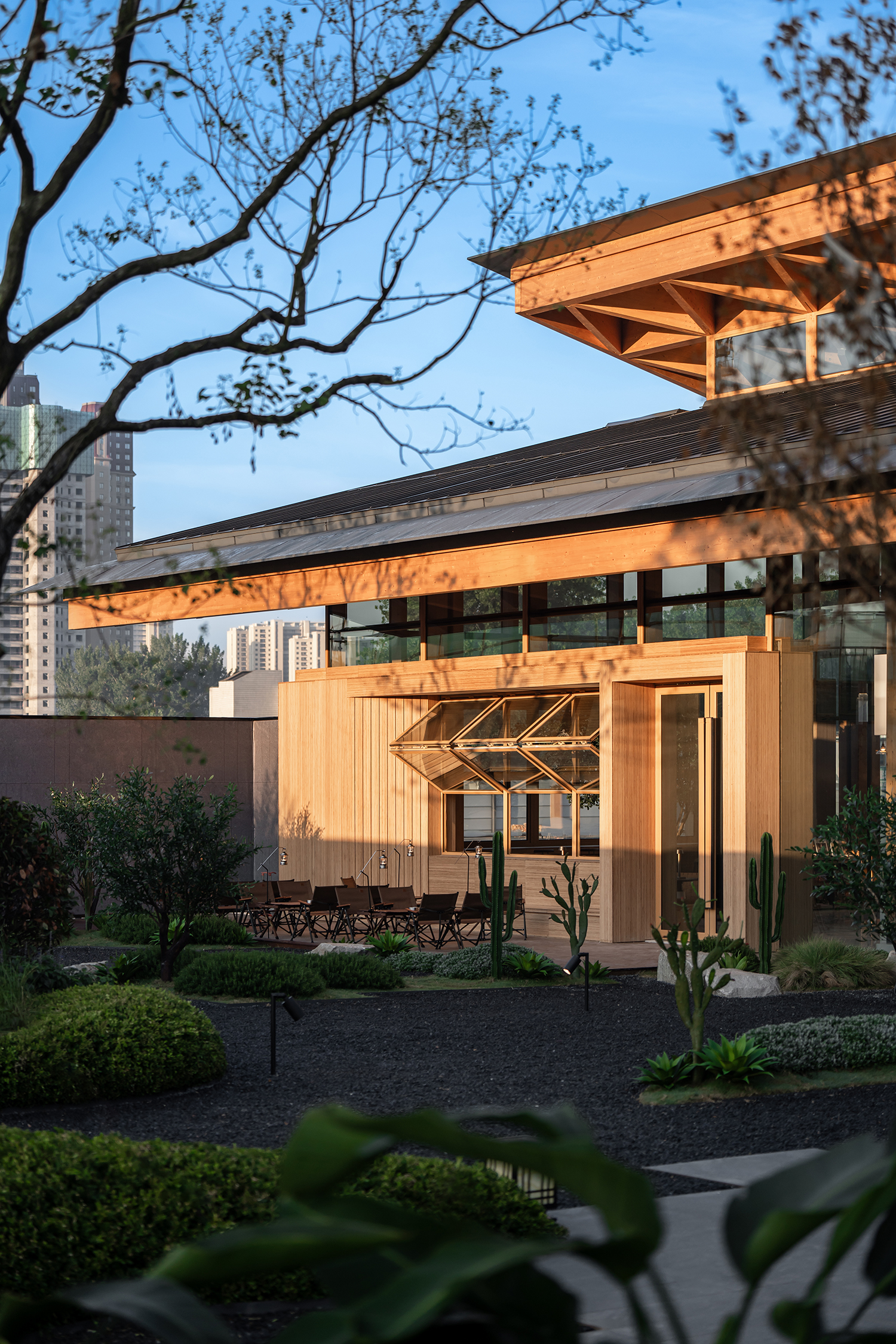 青岛保利和著展示区,是 TOD 理想栖居地。灵感源于青岛“向海而生,与山为邻”的城市画面,融合立体公园、运动与市集商业。双坡悬山屋顶传承中国传统木构坡屋顶形式,同时利用地块内高差打造多样空间,提供多元归家流线;三角形木构结合爪形承重结构优化了传统屋面形式;和著售楼处为青岛的文化续演注入新的活力,也将推动公园式商业模式的发展,为未来的城市建设提供一种可持续发展的可能性。
