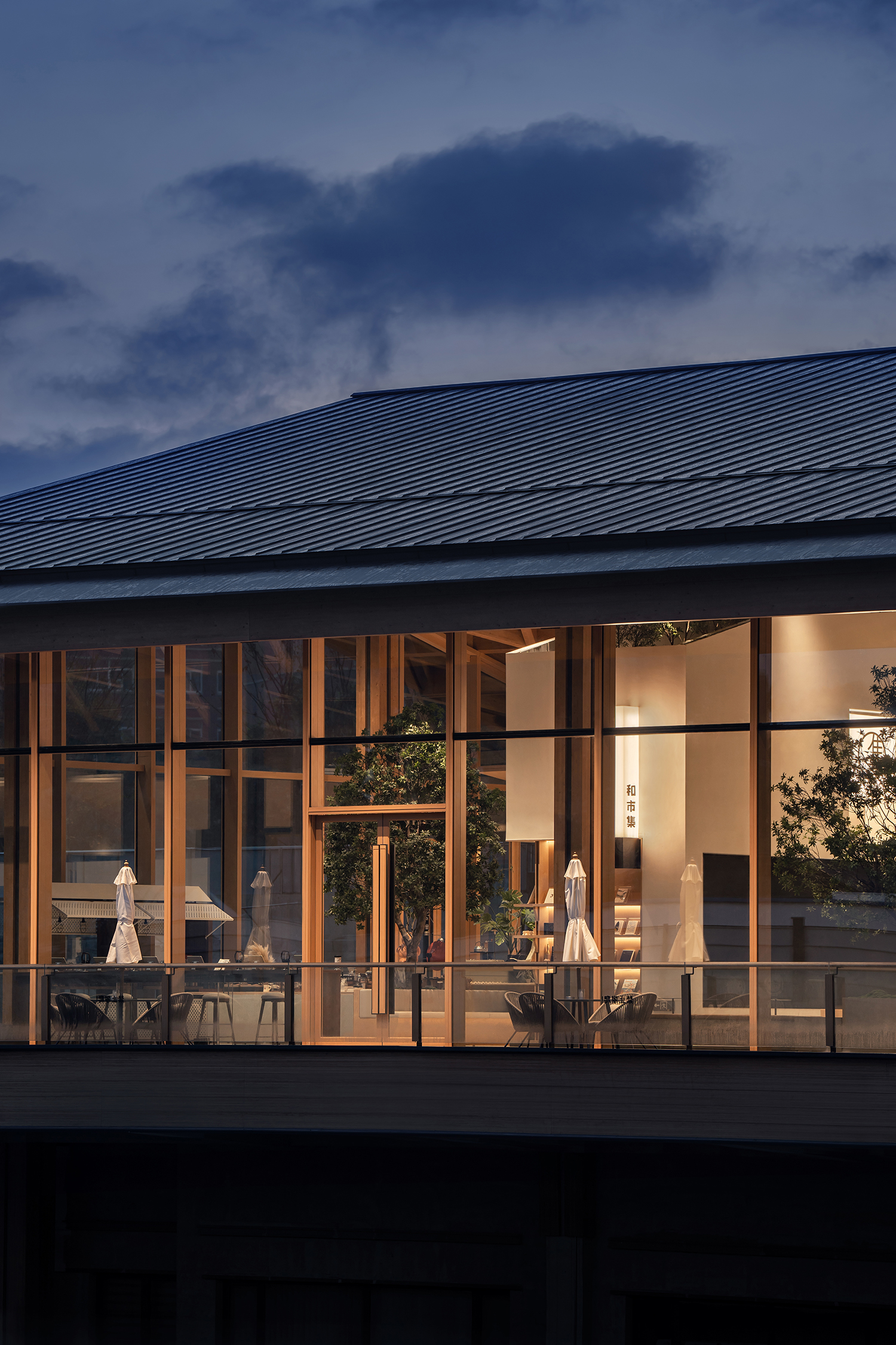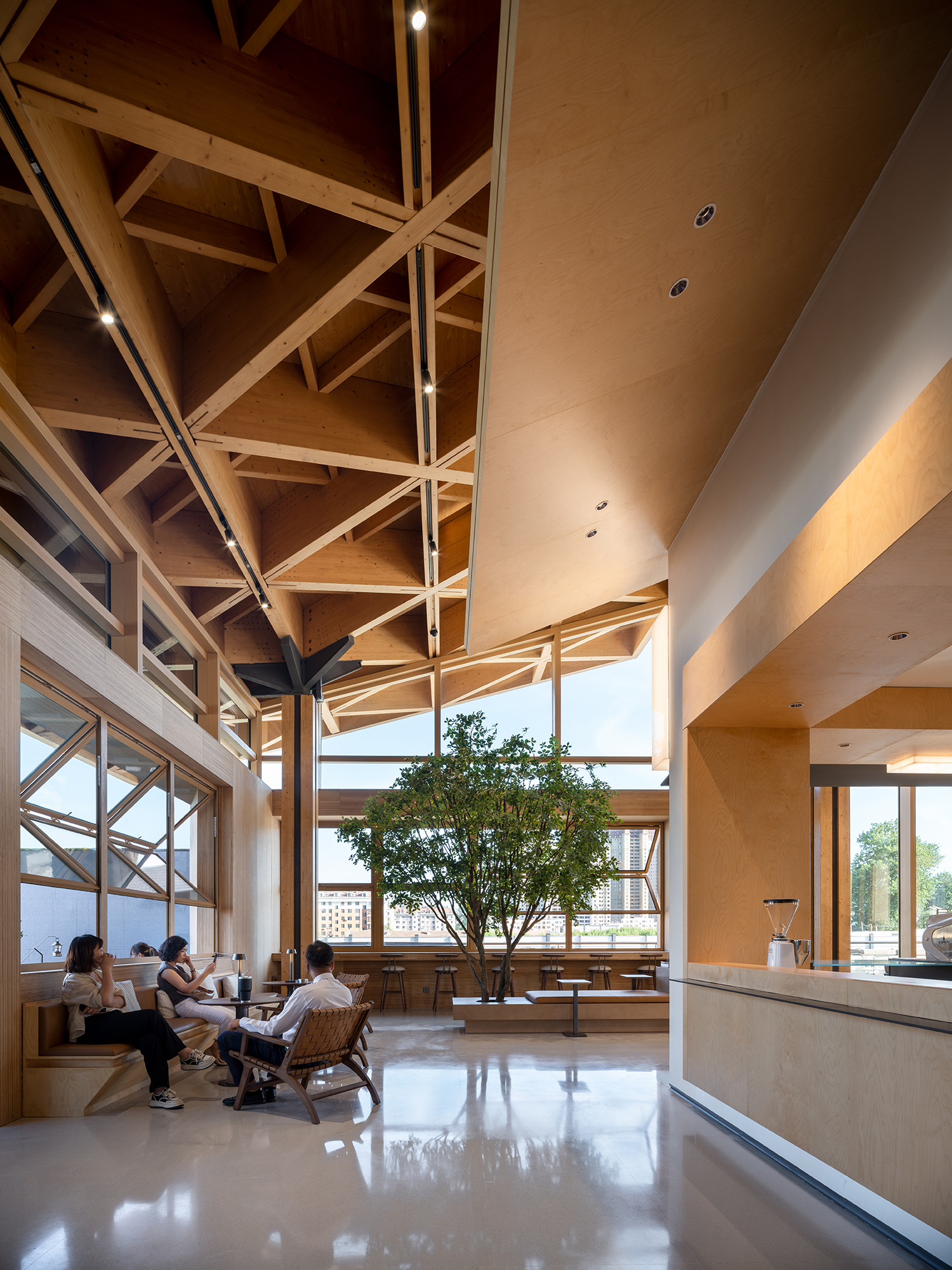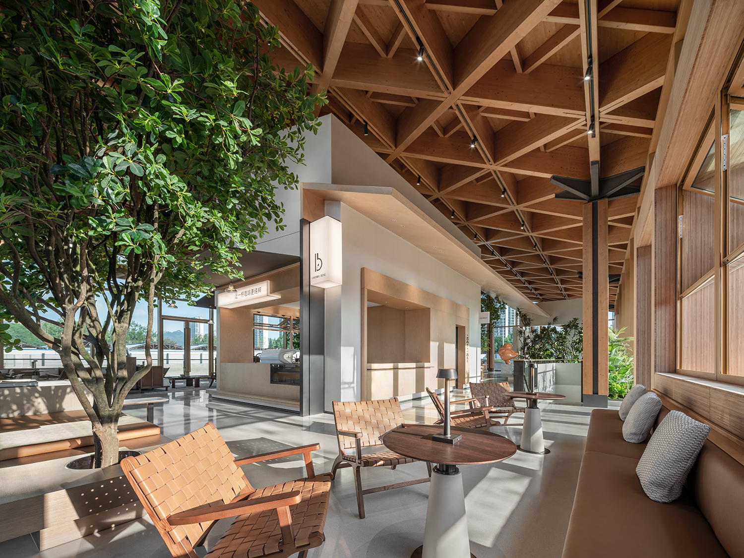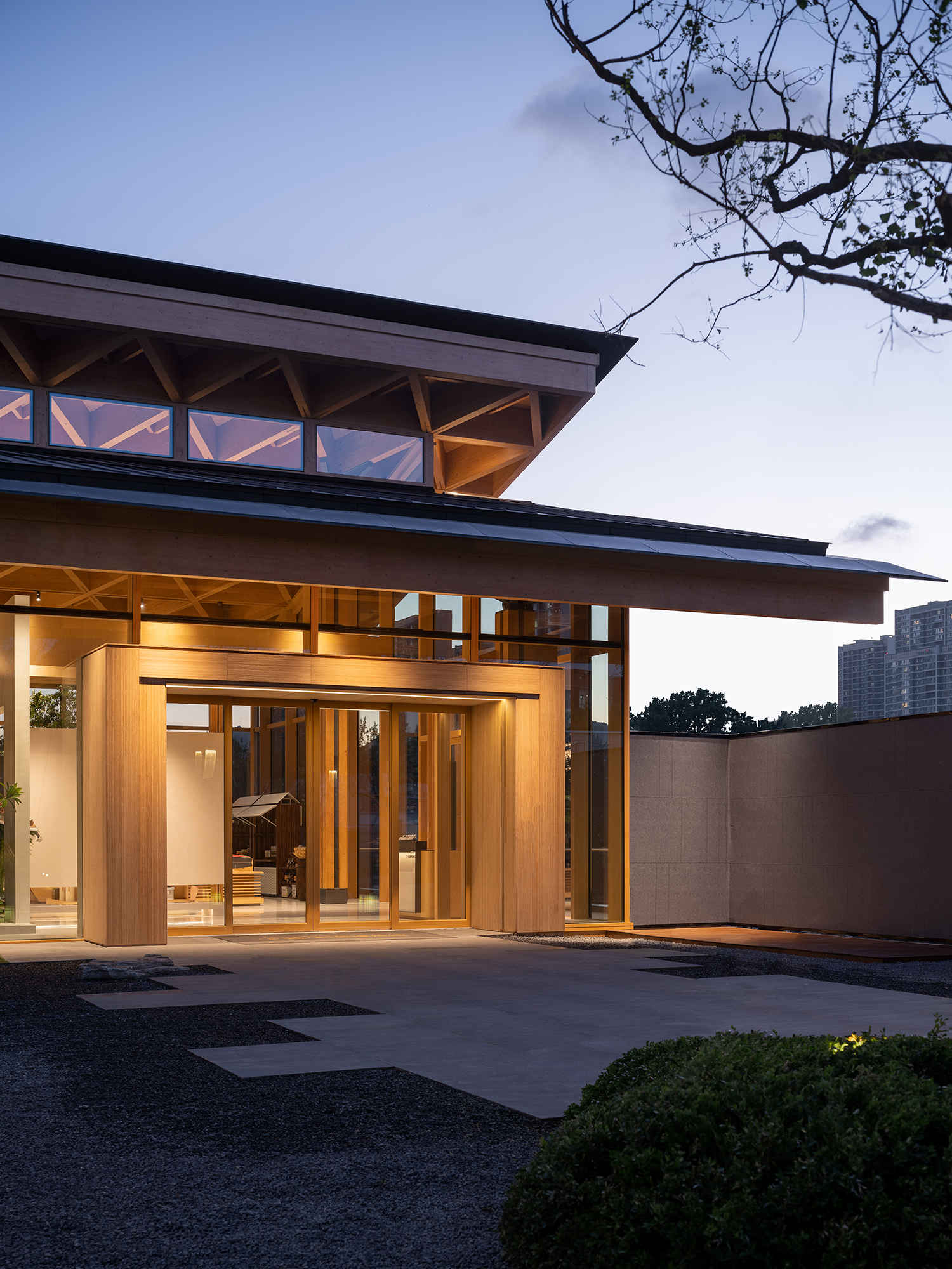 青岛保利和著展示区,是 TOD 理想栖居地。灵感源于青岛“向海而生,与山为邻”的城市画面,融合立体公园、运动与市集商业。双坡悬山屋顶传承中国传统木构坡屋顶形式,同时利用地块内高差打造多样空间,提供多元归家流线;三角形木构结合爪形承重结构优化了传统屋面形式;和著售楼处为青岛的文化续演注入新的活力,也将推动公园式商业模式的发展,为未来的城市建设提供一种可持续发展的可能性。