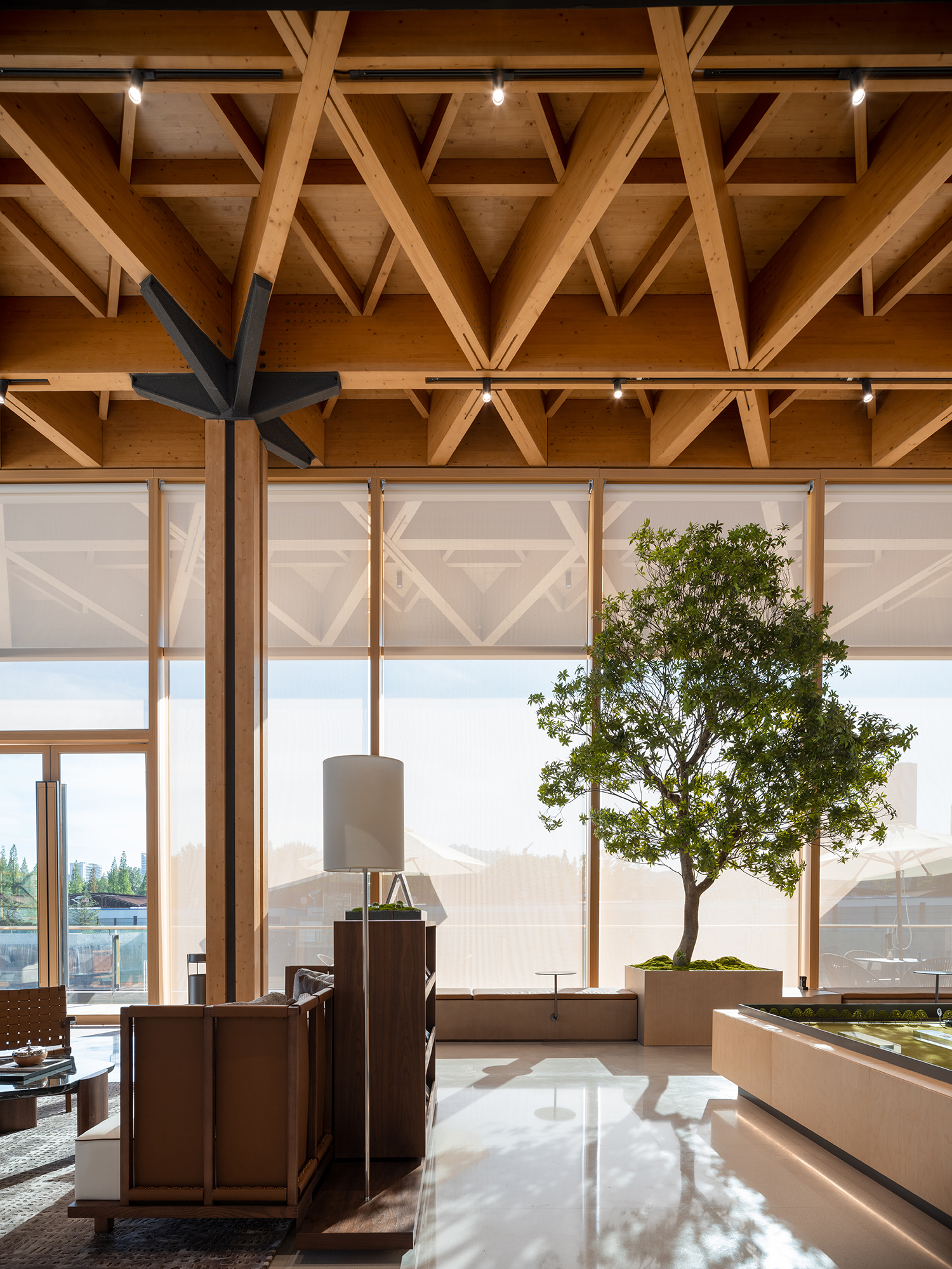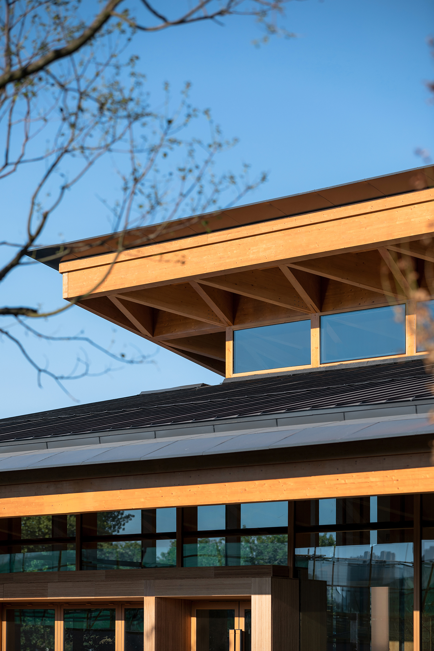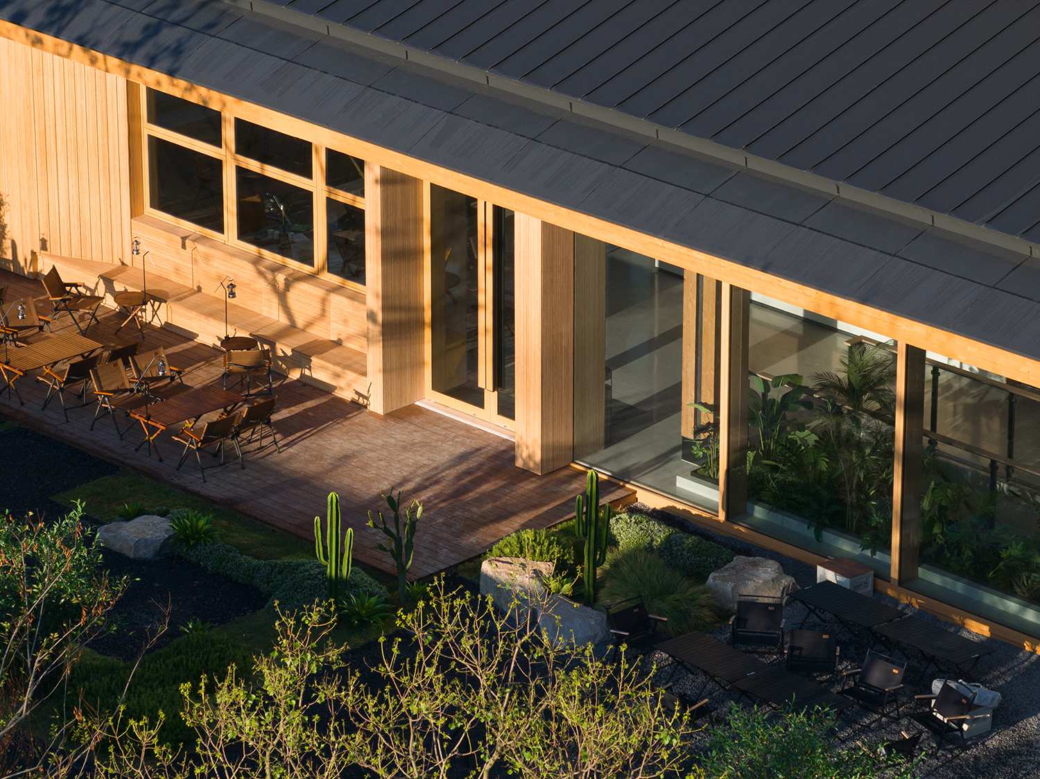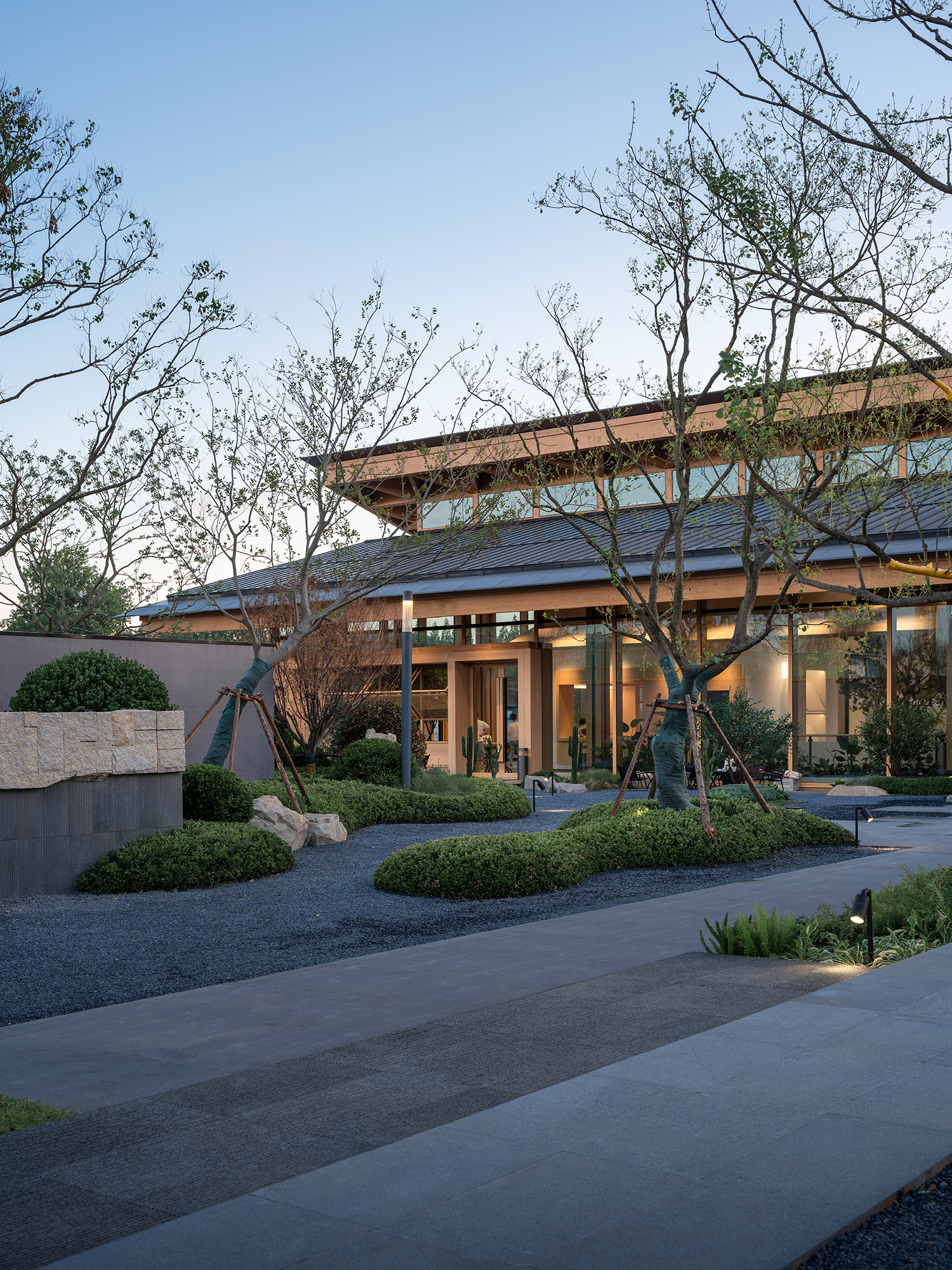 青岛保利和著展示区,是 TOD 理想栖居地。灵感源于青岛“向海而生,与山为邻”的城市画面,融合立体公园、运动与市集商业。双坡悬山屋顶传承中国传统木构坡屋顶形式,同时利用地块内高差打造多样空间,提供多元归家流线;三角形木构结合爪形承重结构优化了传统屋面形式;和著售楼处为青岛的文化续演注入新的活力,也将推动公园式商业模式的发展,为未来的城市建设提供一种可持续发展的可能性。