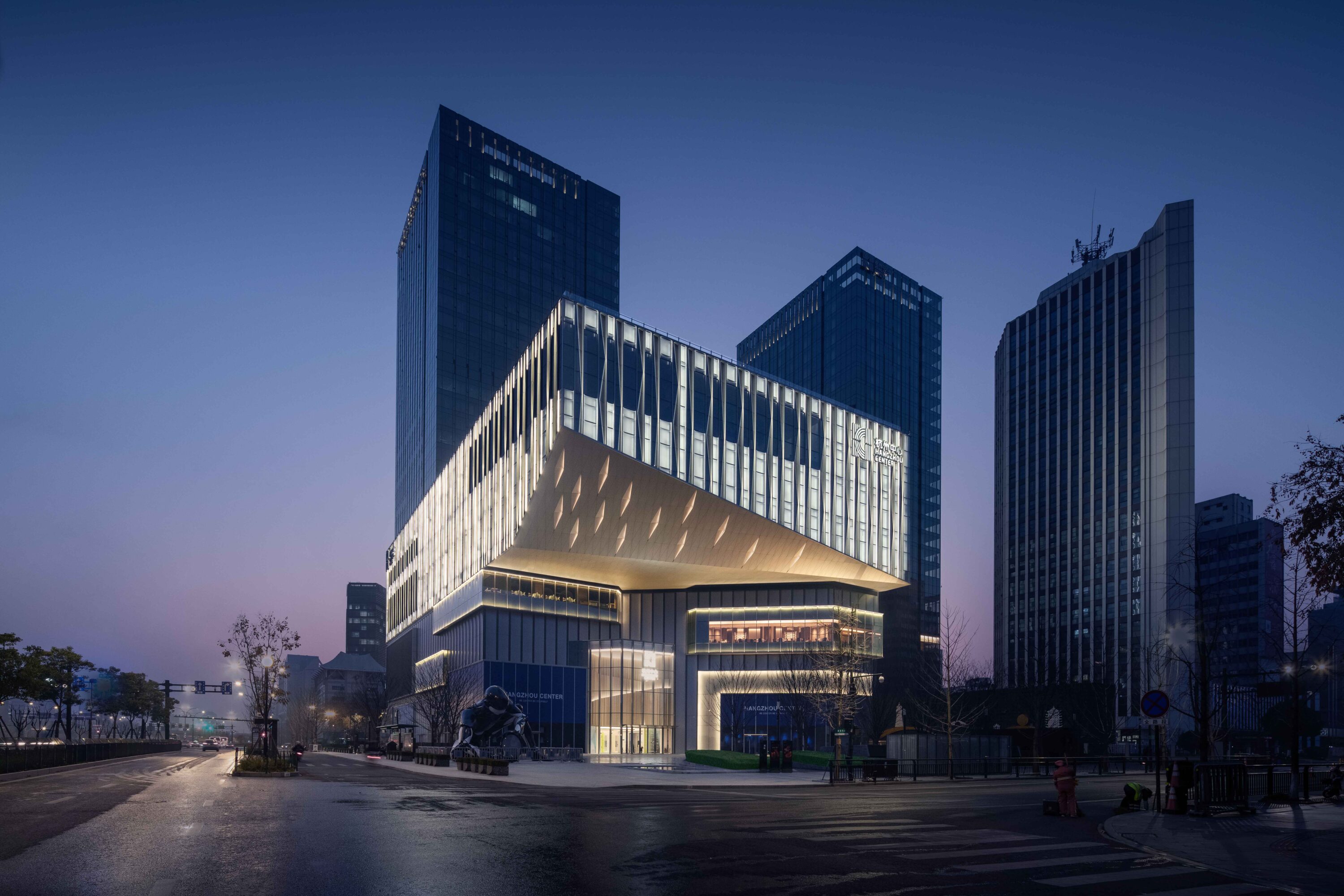 用灯光来表达水的流动和宁静,山的稳固和坚实,以及杭州油纸伞重叠、朦胧的意向。强化玻璃盒子体块感,提升简洁的折面结构,形成独特的外观特点,悬挑下切角部分的灯光增添了一丝奇特感和记忆点,丰富了层次。