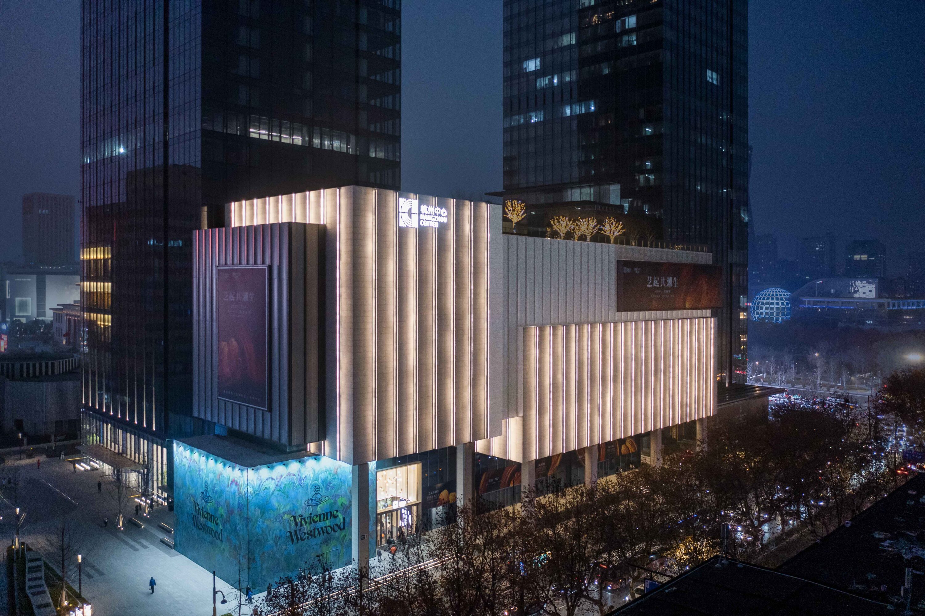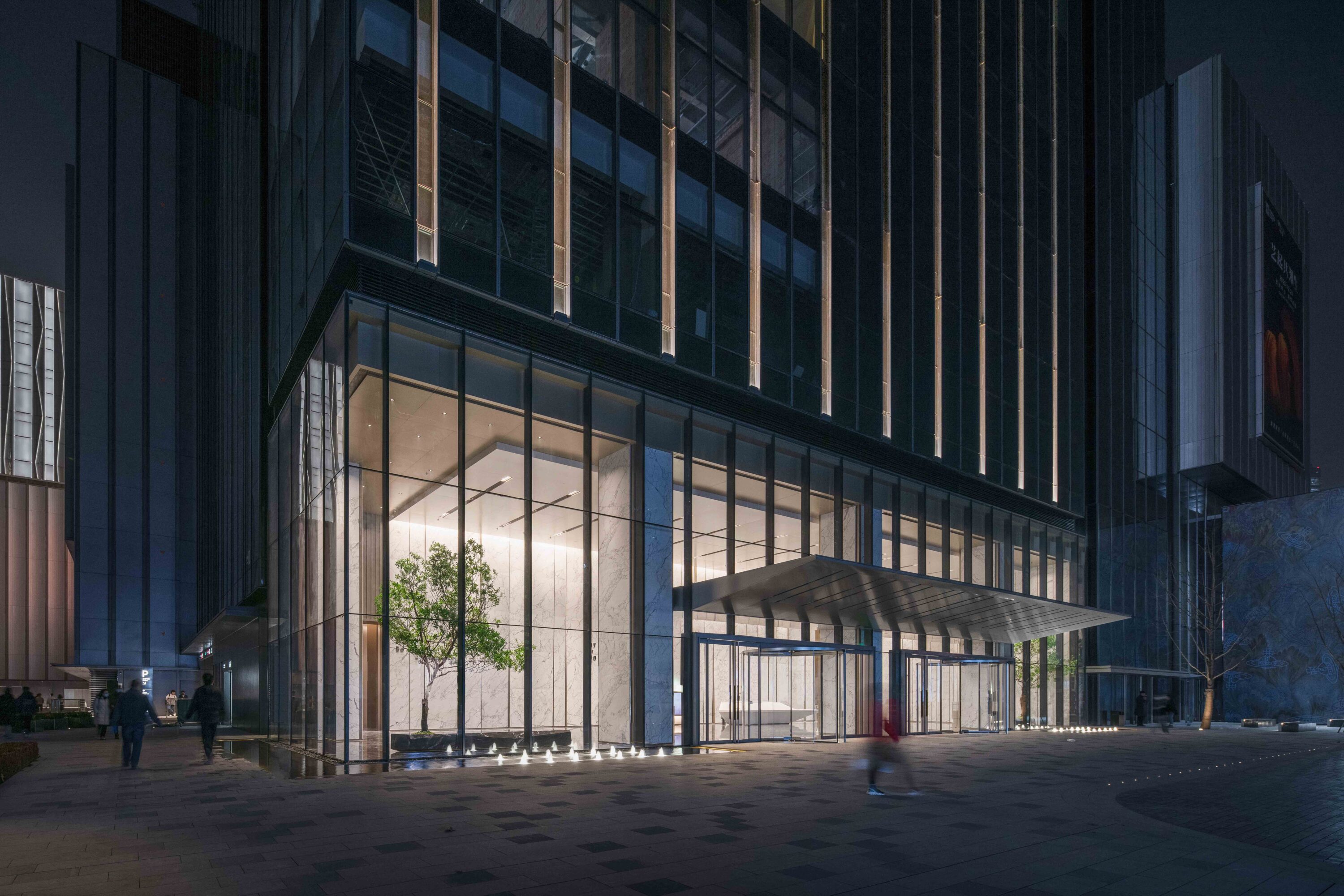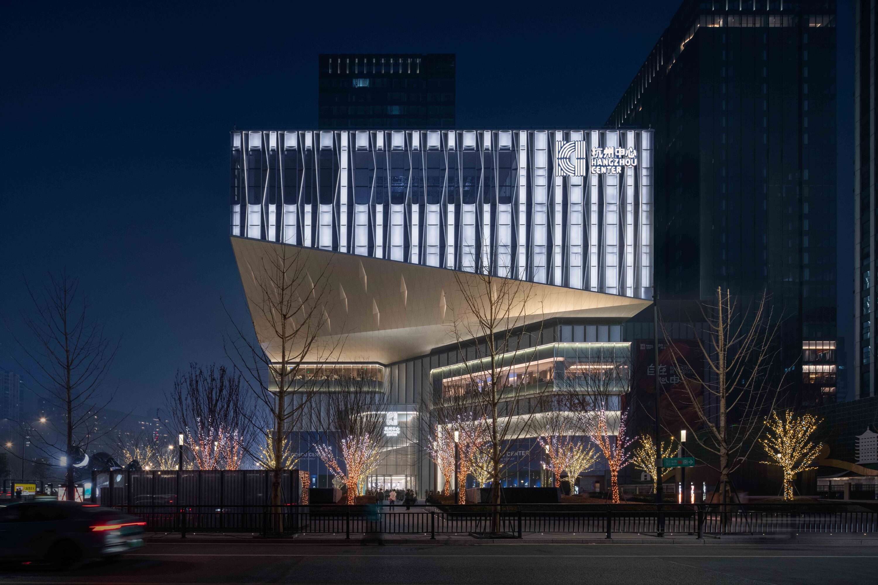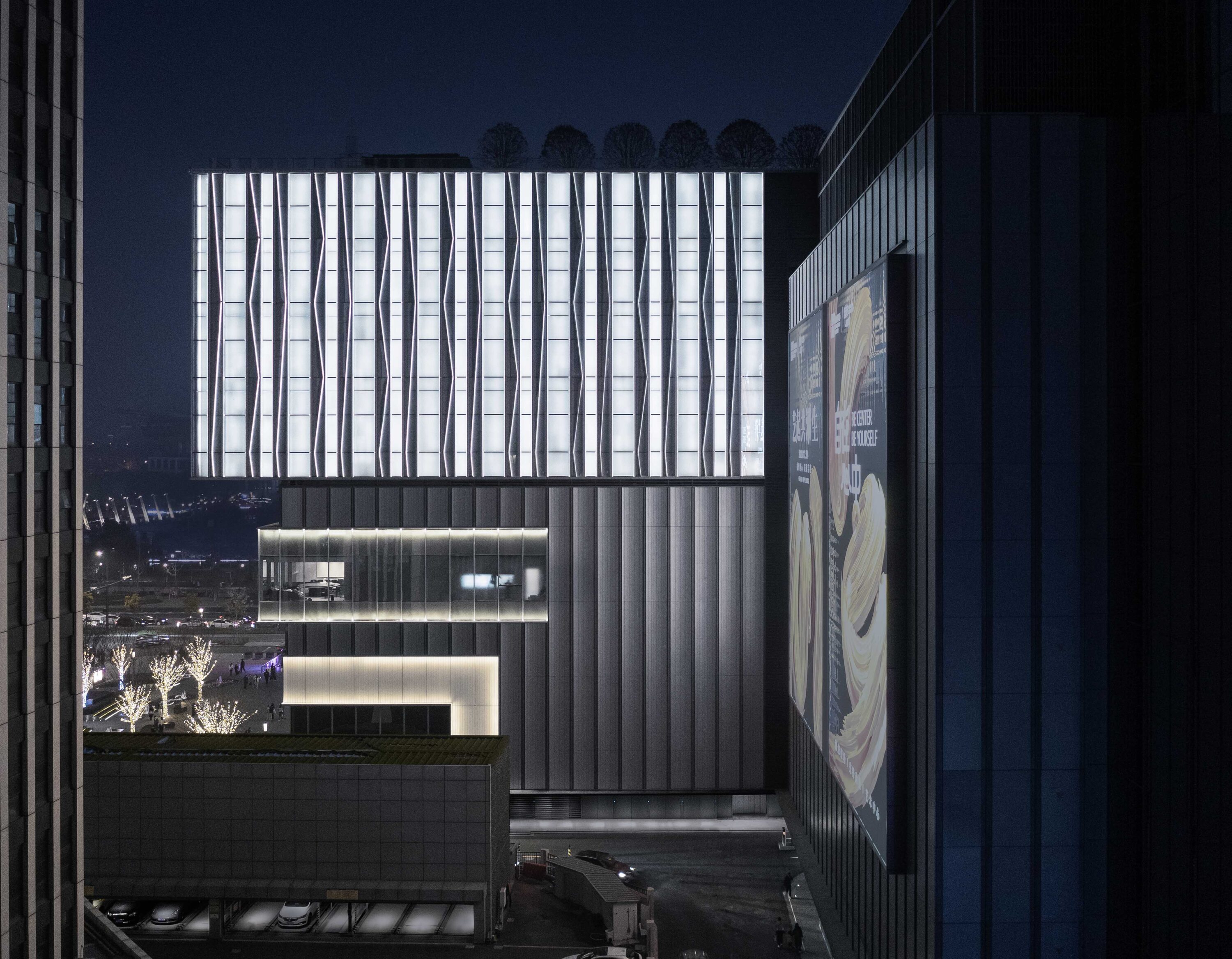 用灯光来表达水的流动和宁静,山的稳固和坚实,以及杭州油纸伞重叠、朦胧的意向。强化玻璃盒子体块感,提升简洁的折面结构,形成独特的外观特点,悬挑下切角部分的灯光增添了一丝奇特感和记忆点,丰富了层次。