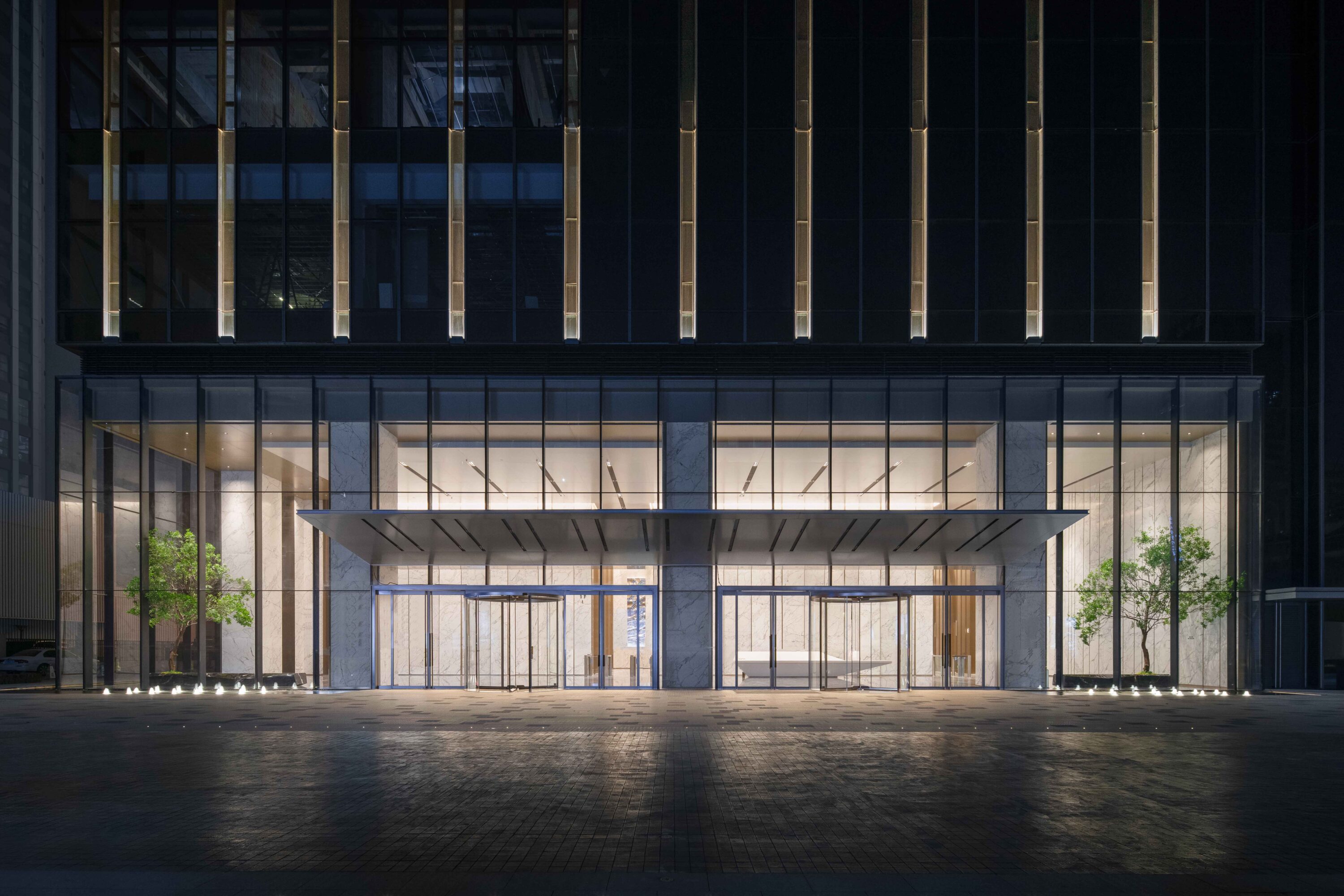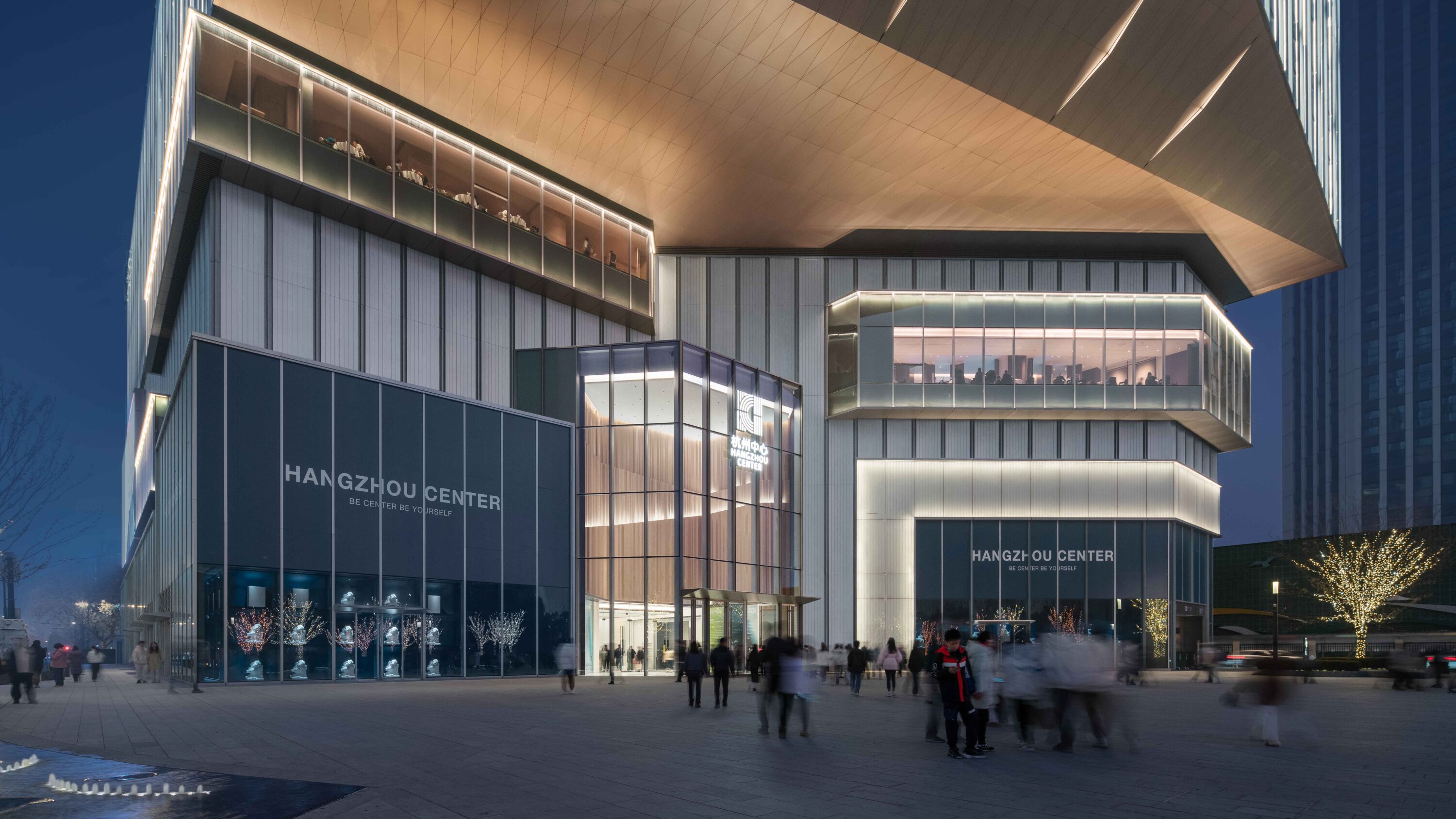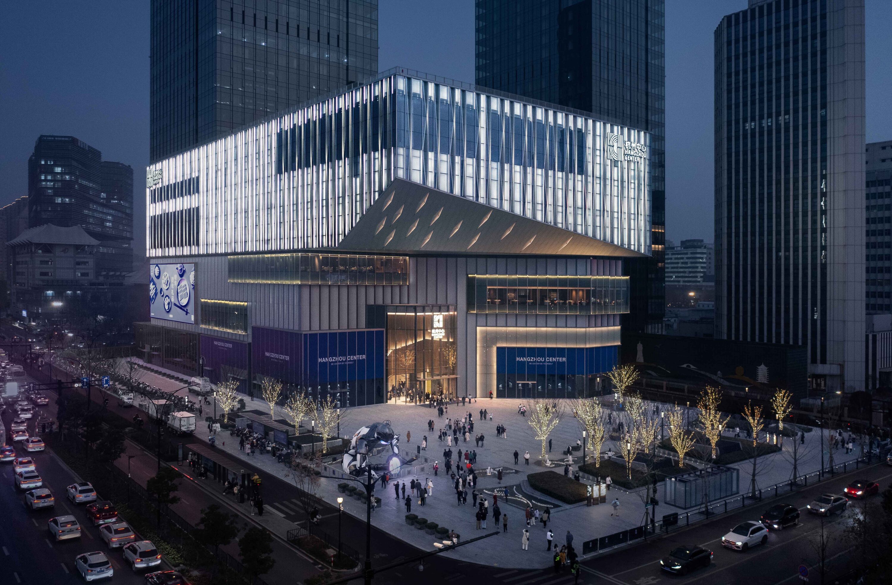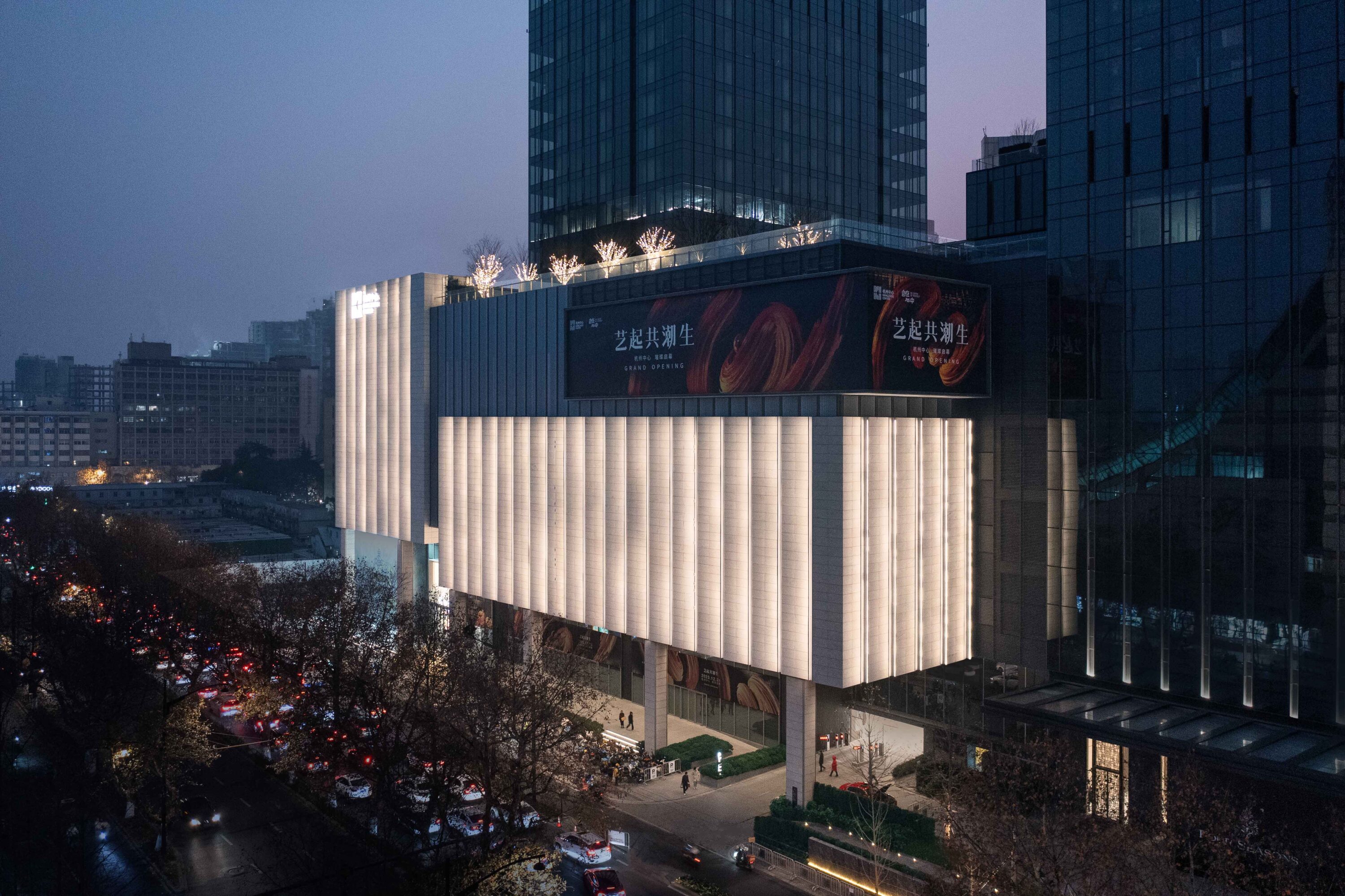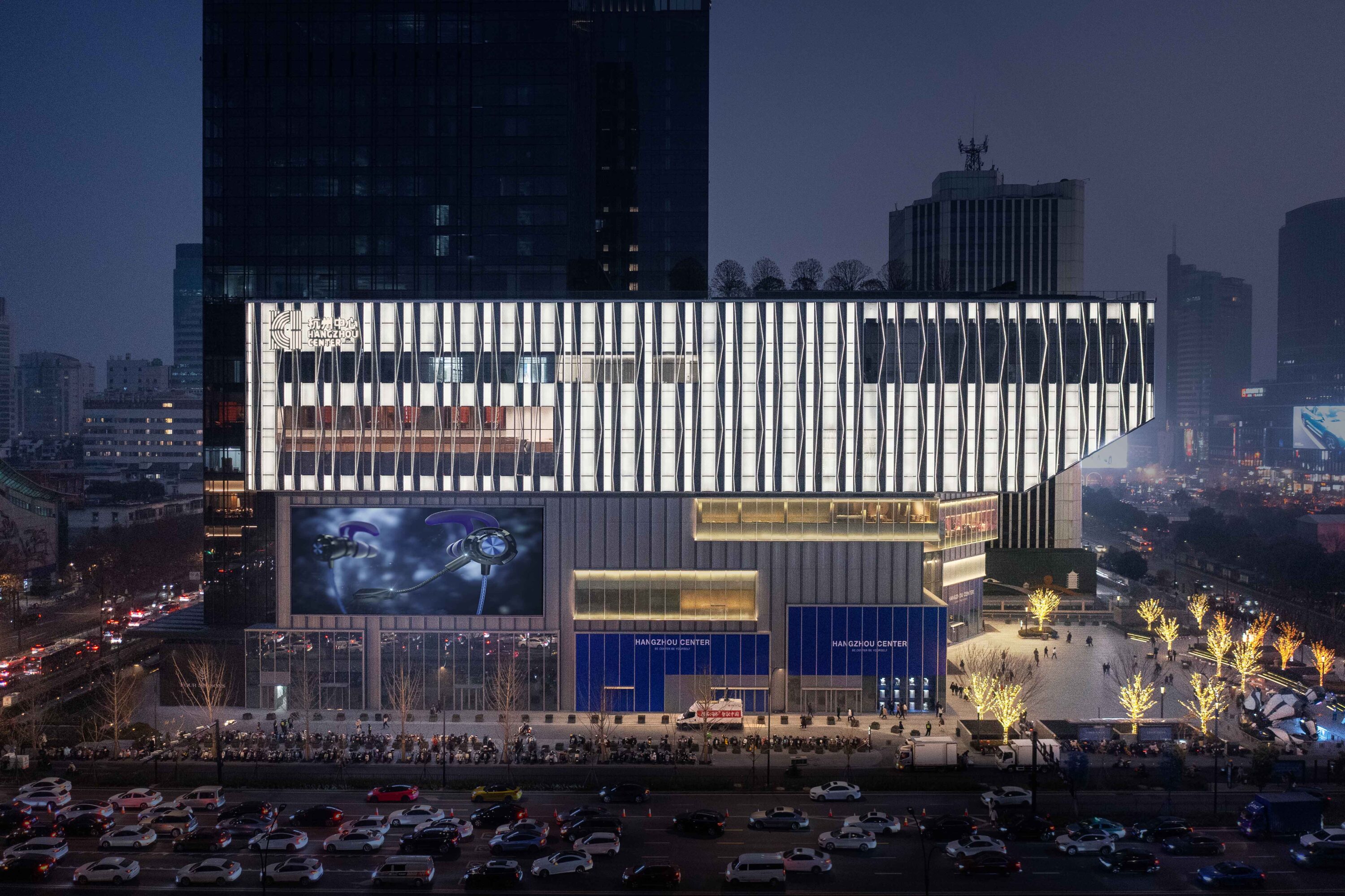 用灯光来表达水的流动和宁静,山的稳固和坚实,以及杭州油纸伞重叠、朦胧的意向。强化玻璃盒子体块感,提升简洁的折面结构,形成独特的外观特点,悬挑下切角部分的灯光增添了一丝奇特感和记忆点,丰富了层次。