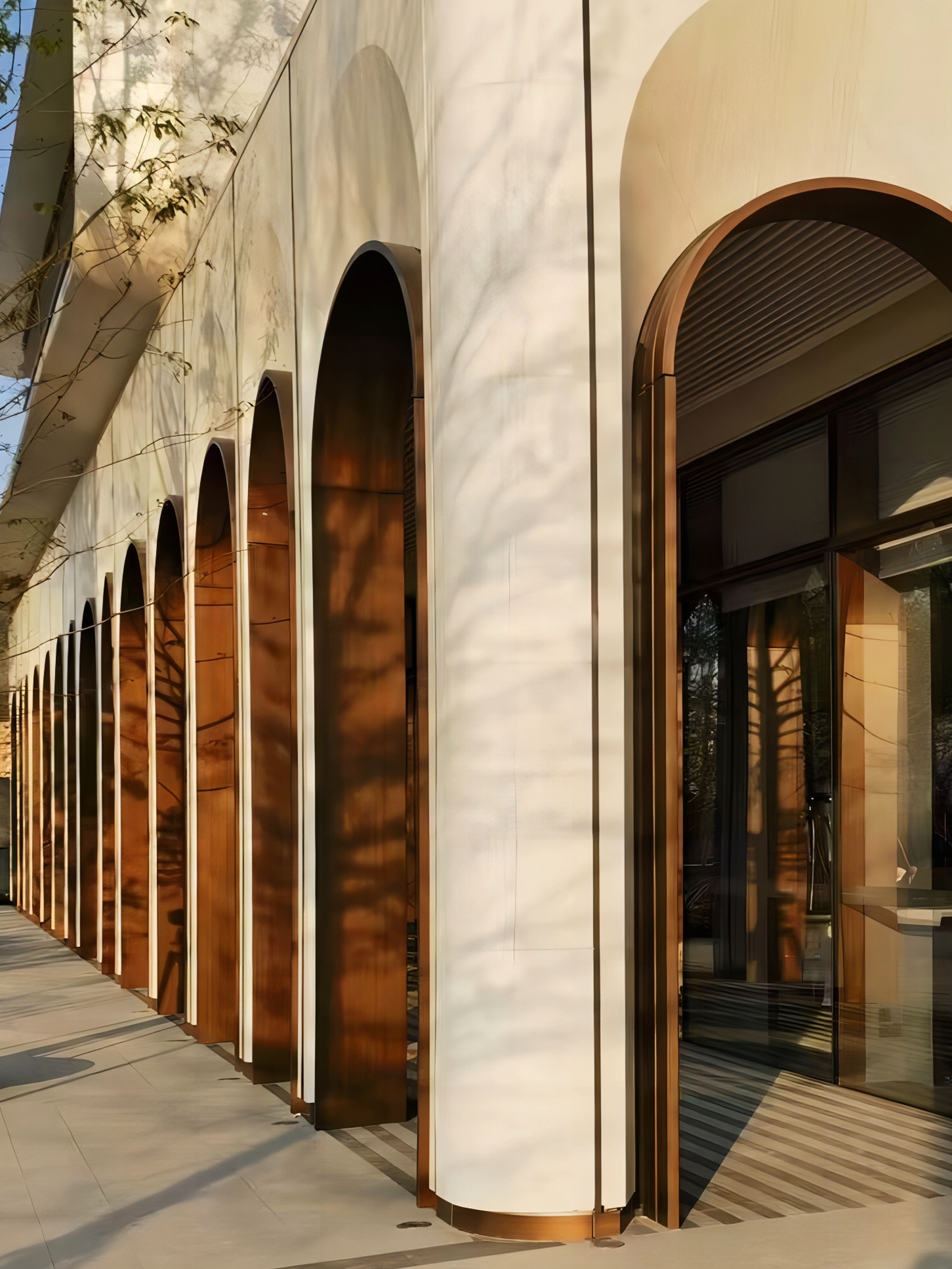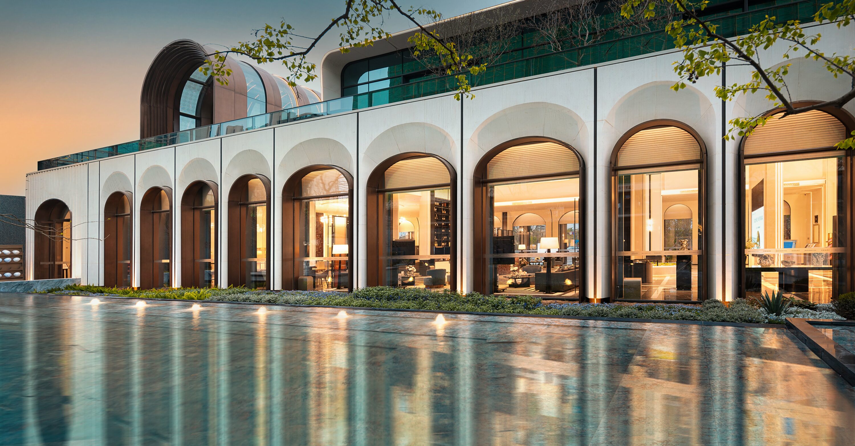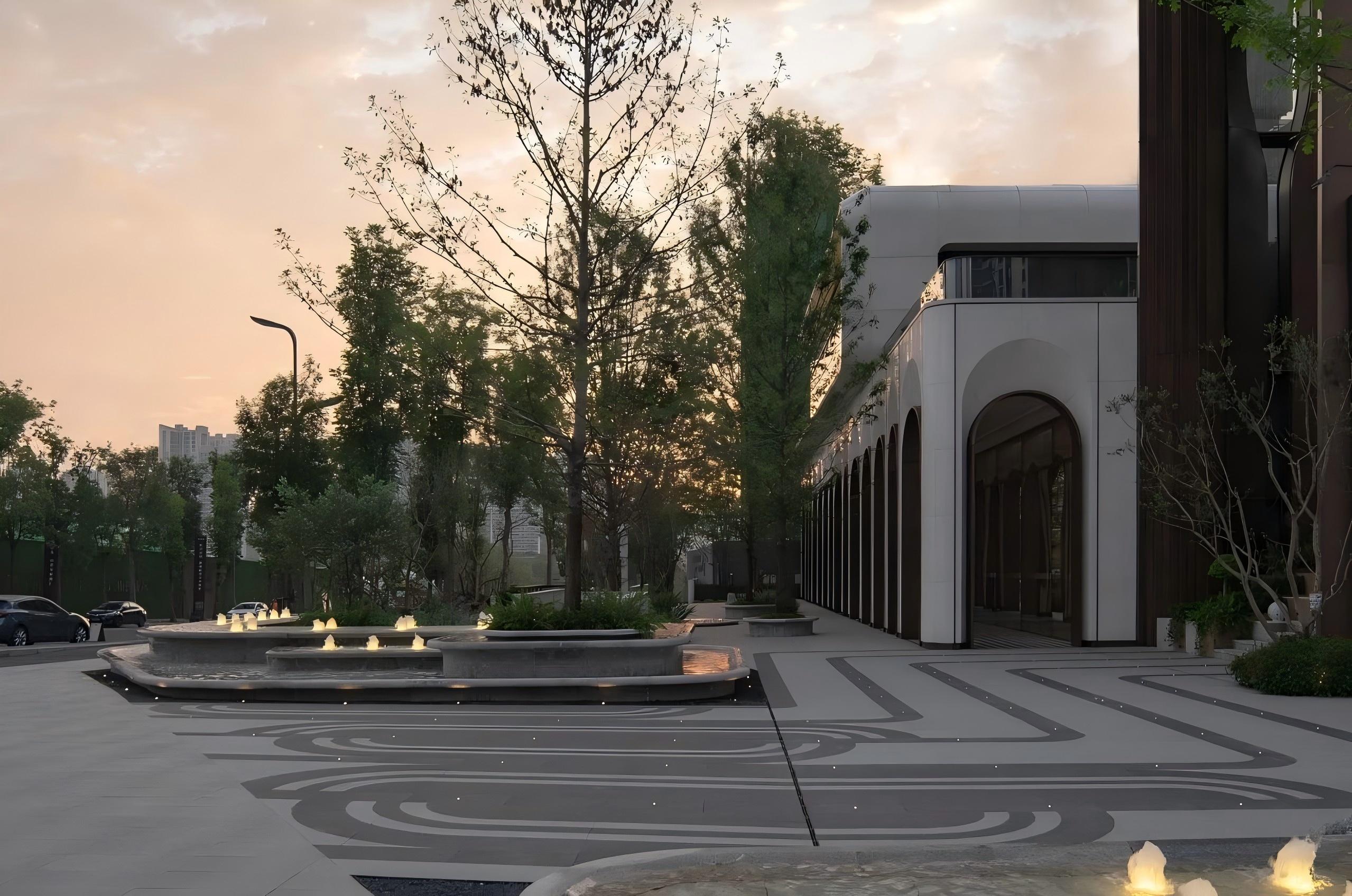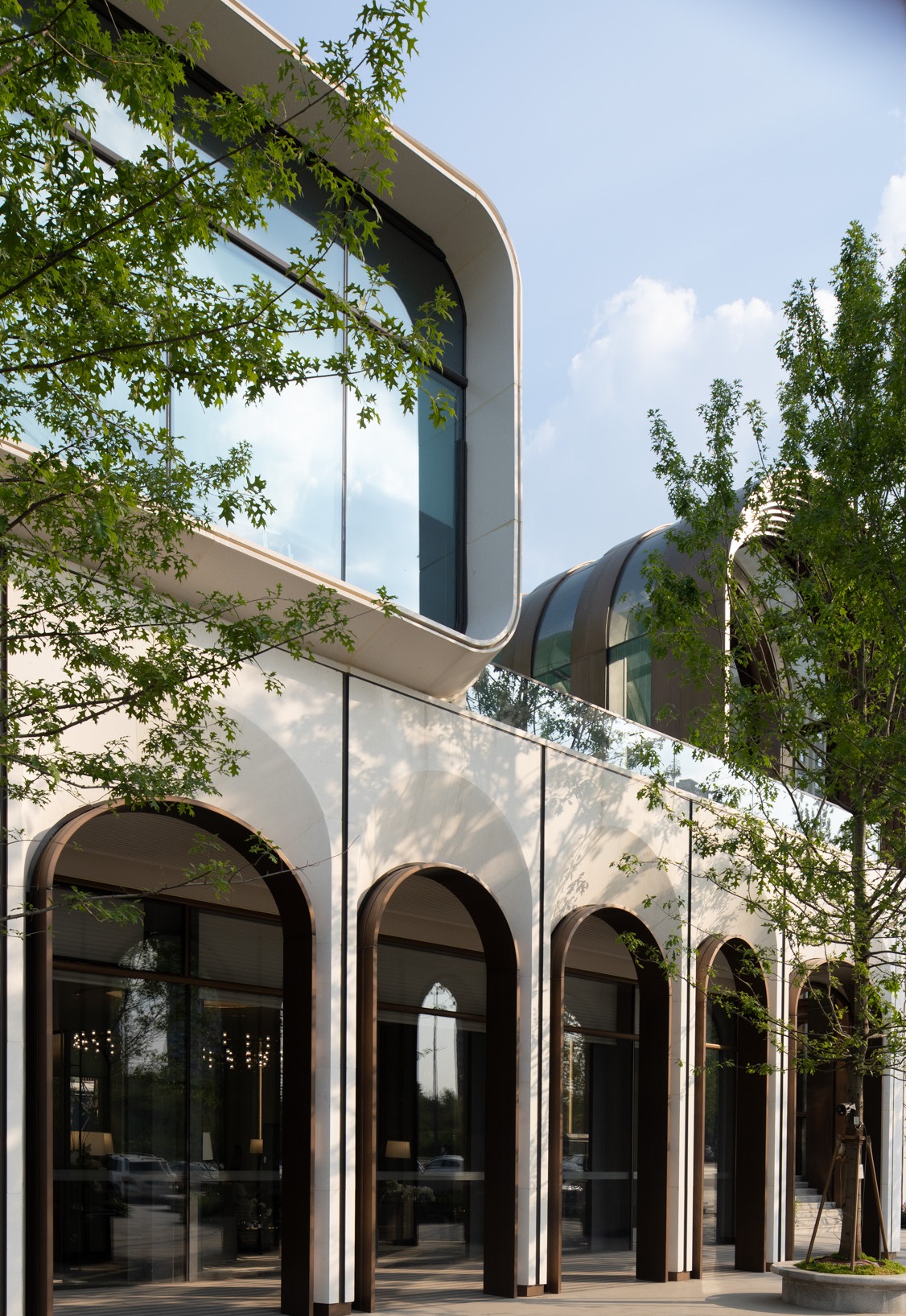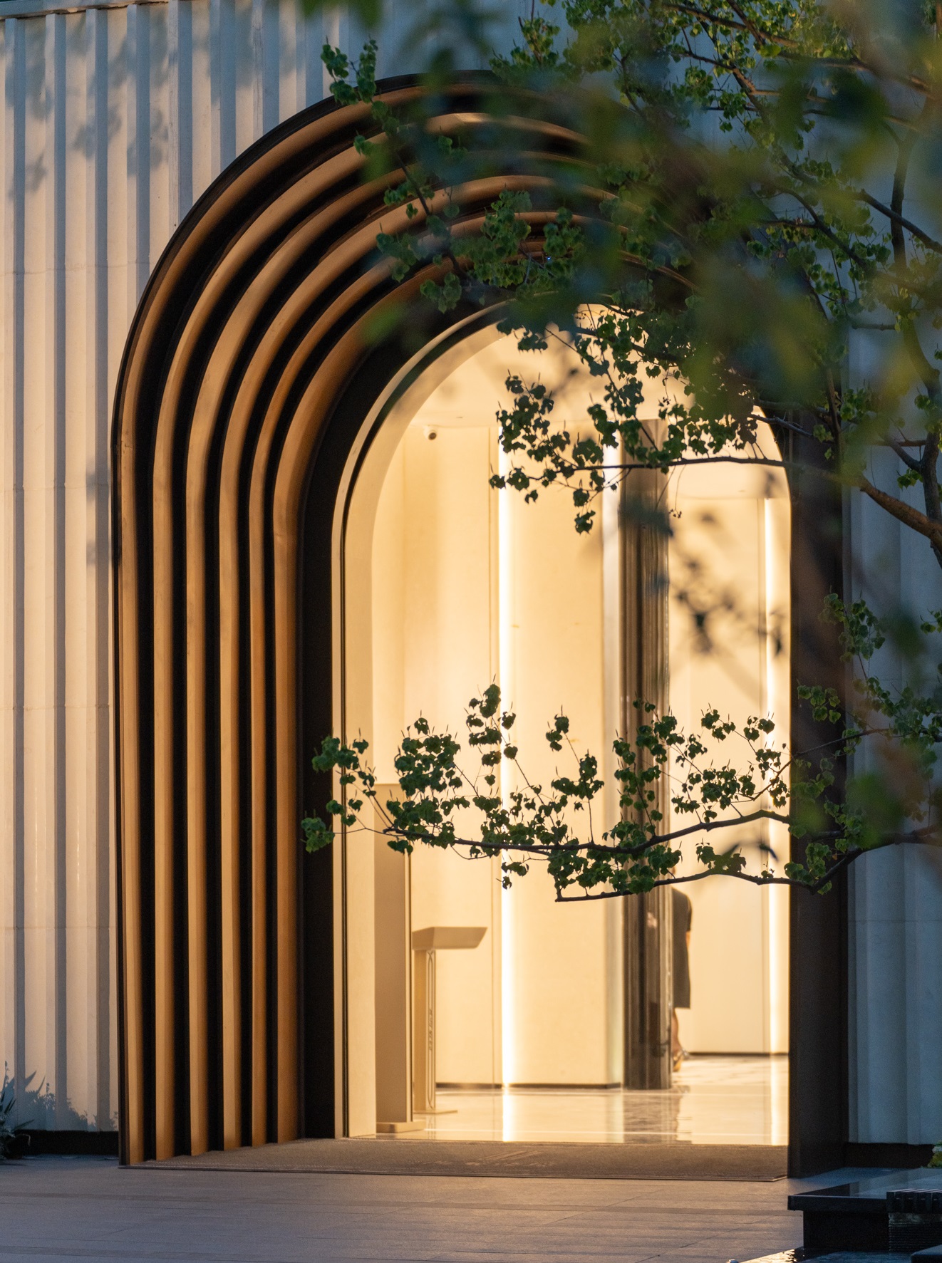 中铁建麓湖西派臻境多处采用了直线与弧形相融合的手法,勾勒轮廓展现刚柔并济之美,首层连续拱洞柱廊作为基座与二层玻璃盒子的虚实对比,强调简洁、轻盈的建筑形态。花园式的公馆生活,规划布局以内聚外张性的空间形态。“街区”通过建筑、街巷、广场、景观等要素灵活建构,街角广场与IP建筑及31.4米沿街展面的酒店式社区入口,具有辨识度的垂直交通和视觉中心,打造了一处适宜人尺度空间环境与序列性的社区级建筑群落。