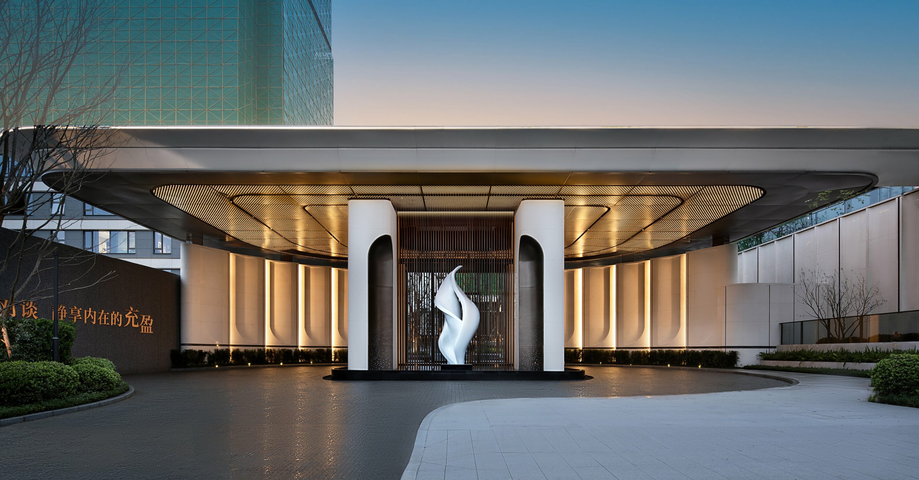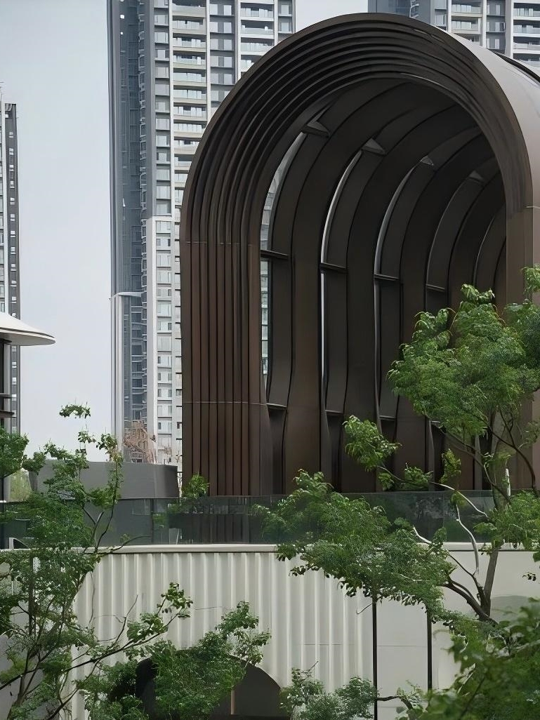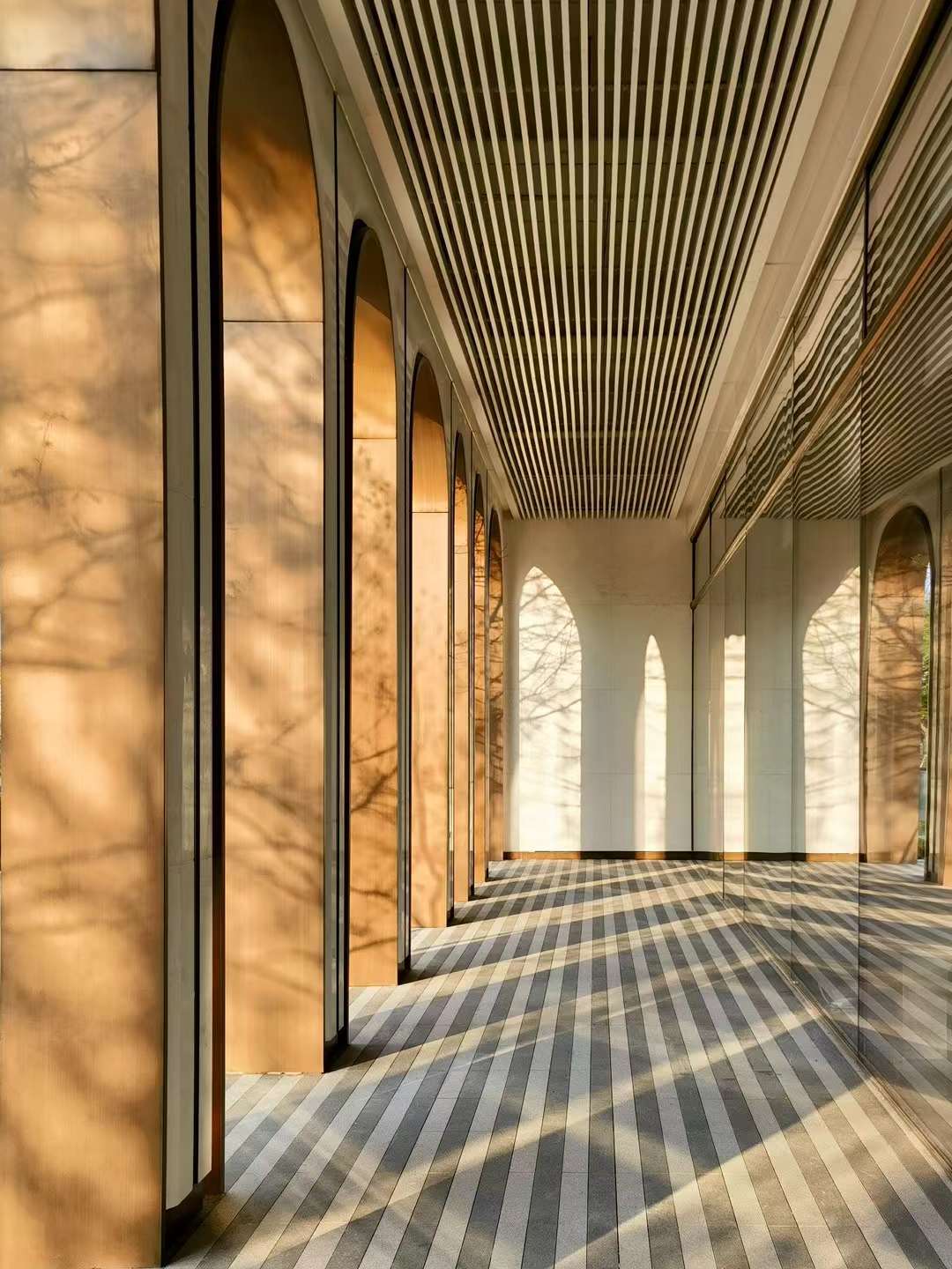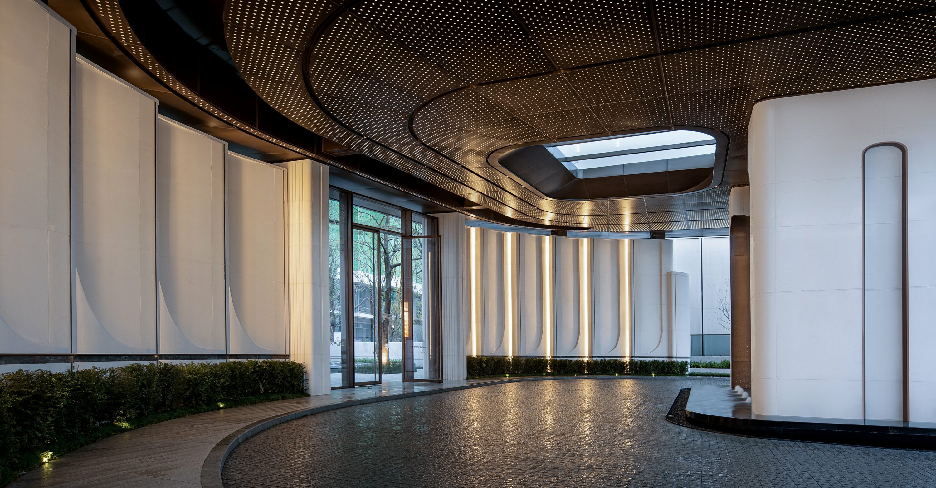 中铁建麓湖西派臻境多处采用了直线与弧形相融合的手法,勾勒轮廓展现刚柔并济之美,首层连续拱洞柱廊作为基座与二层玻璃盒子的虚实对比,强调简洁、轻盈的建筑形态。花园式的公馆生活,规划布局以内聚外张性的空间形态。“街区”通过建筑、街巷、广场、景观等要素灵活建构,街角广场与IP建筑及31.4米沿街展面的酒店式社区入口,具有辨识度的垂直交通和视觉中心,打造了一处适宜人尺度空间环境与序列性的社区级建筑群落。