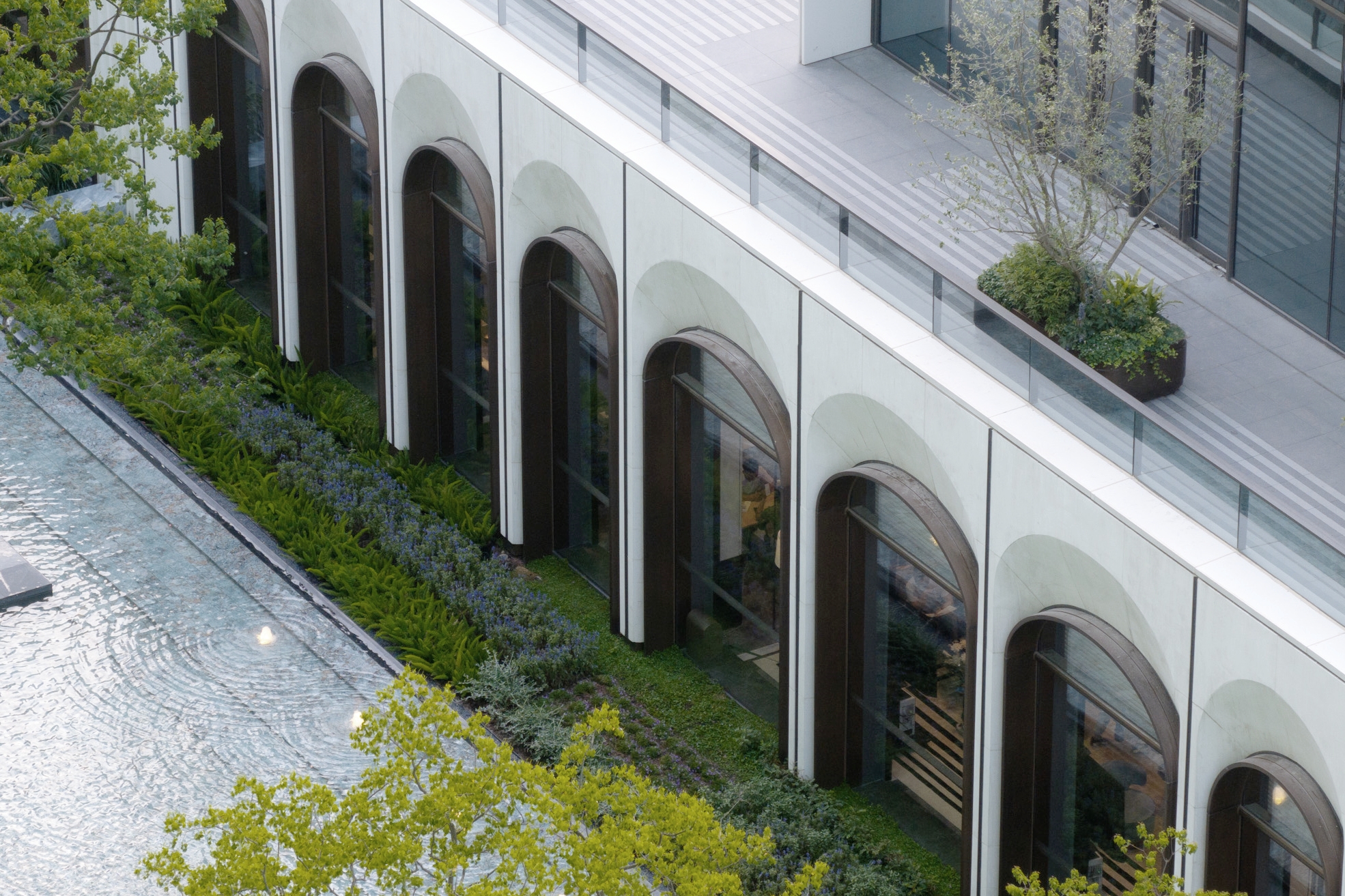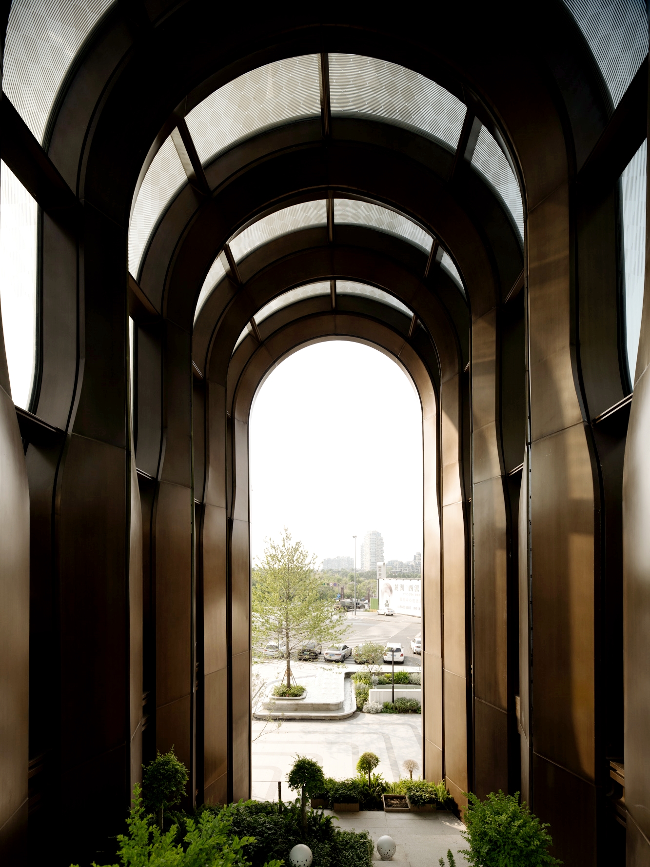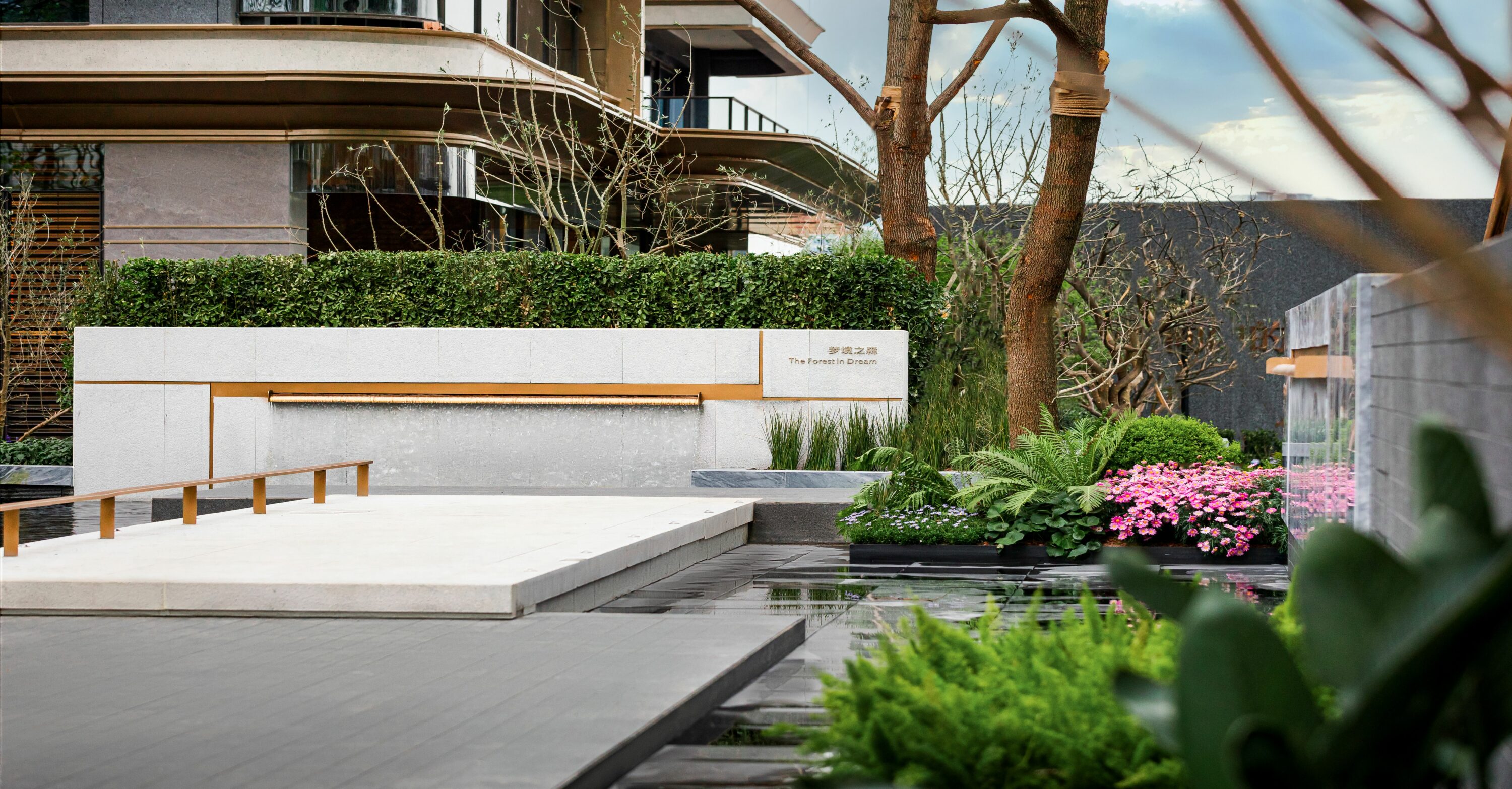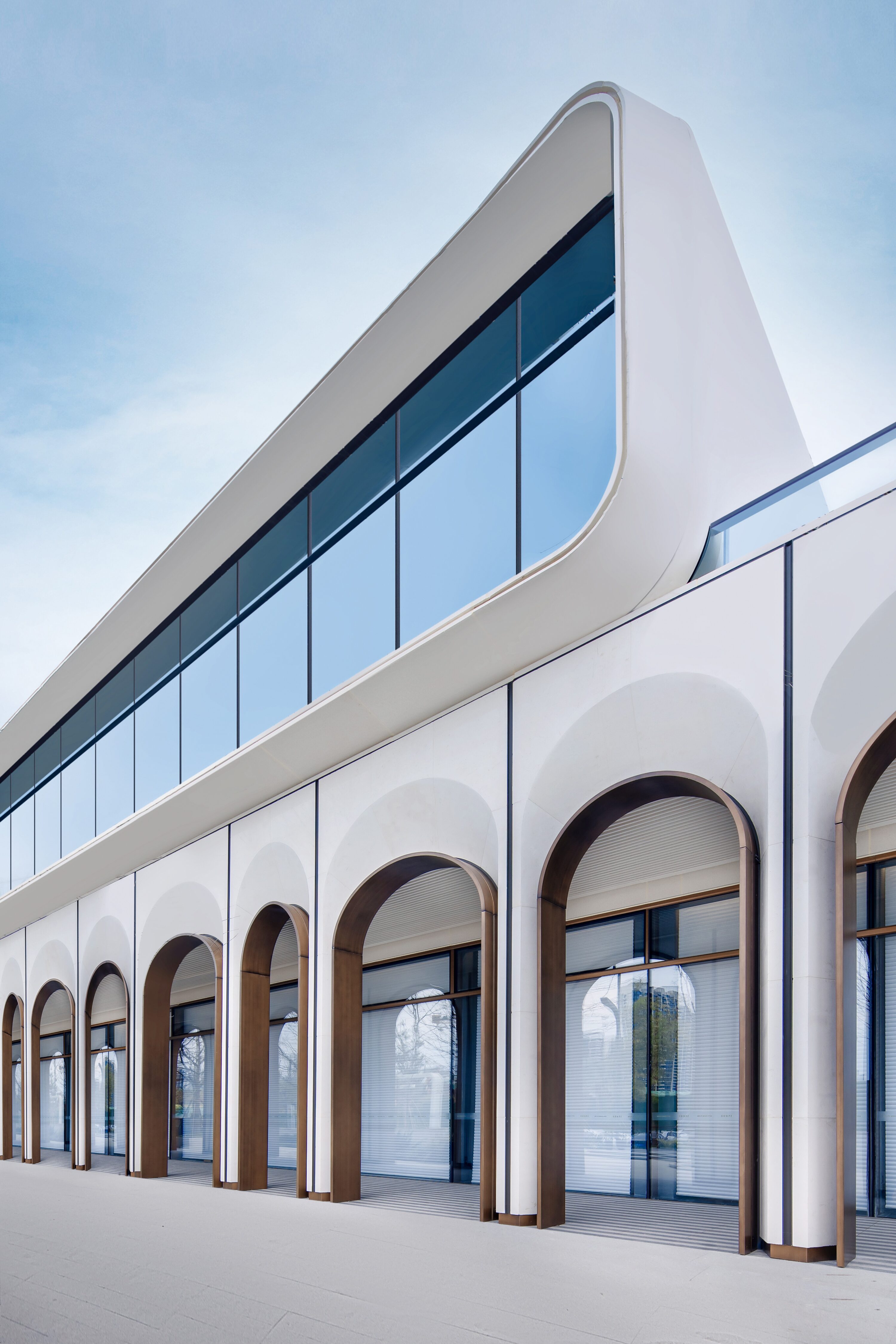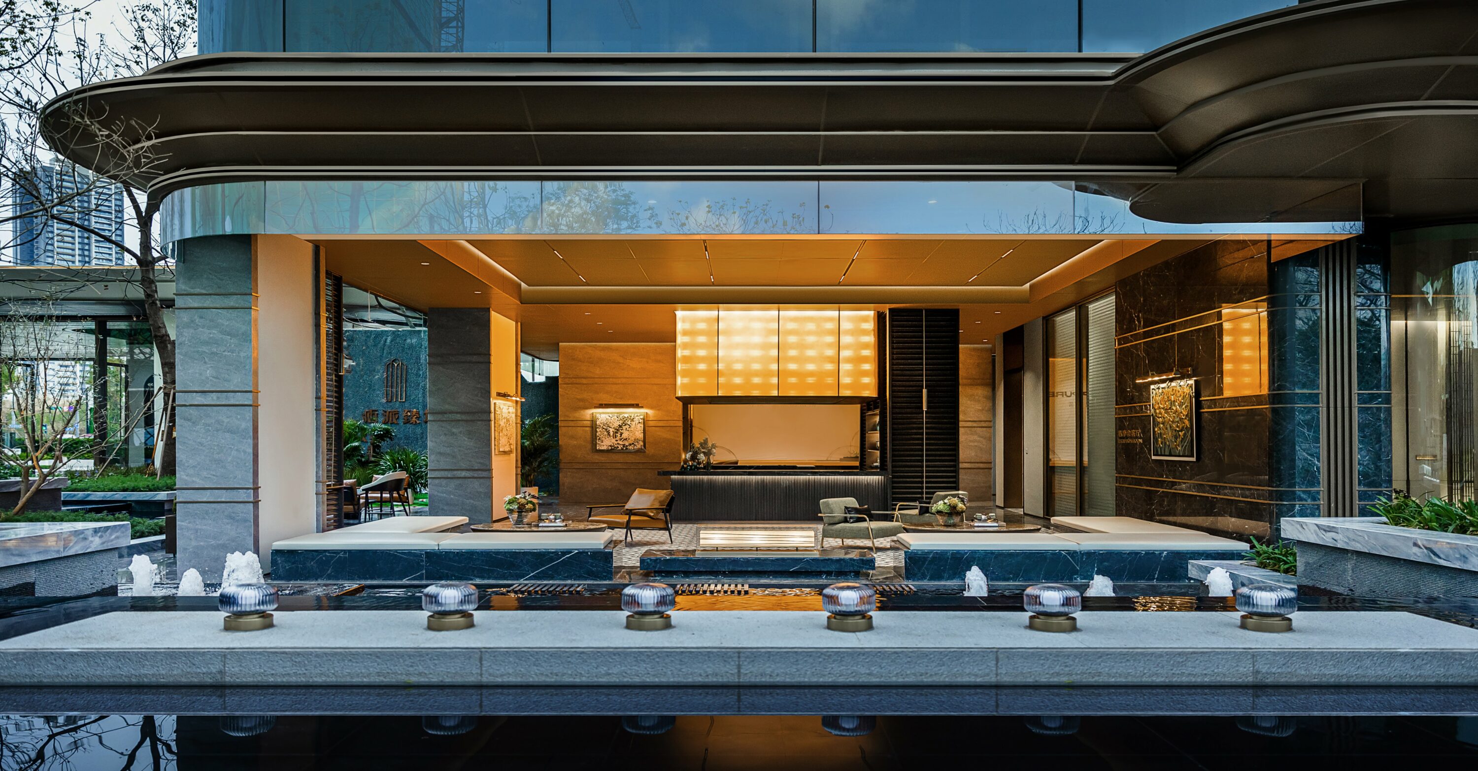 中铁建麓湖西派臻境多处采用了直线与弧形相融合的手法,勾勒轮廓展现刚柔并济之美,首层连续拱洞柱廊作为基座与二层玻璃盒子的虚实对比,强调简洁、轻盈的建筑形态。花园式的公馆生活,规划布局以内聚外张性的空间形态。“街区”通过建筑、街巷、广场、景观等要素灵活建构,街角广场与IP建筑及31.4米沿街展面的酒店式社区入口,具有辨识度的垂直交通和视觉中心,打造了一处适宜人尺度空间环境与序列性的社区级建筑群落。