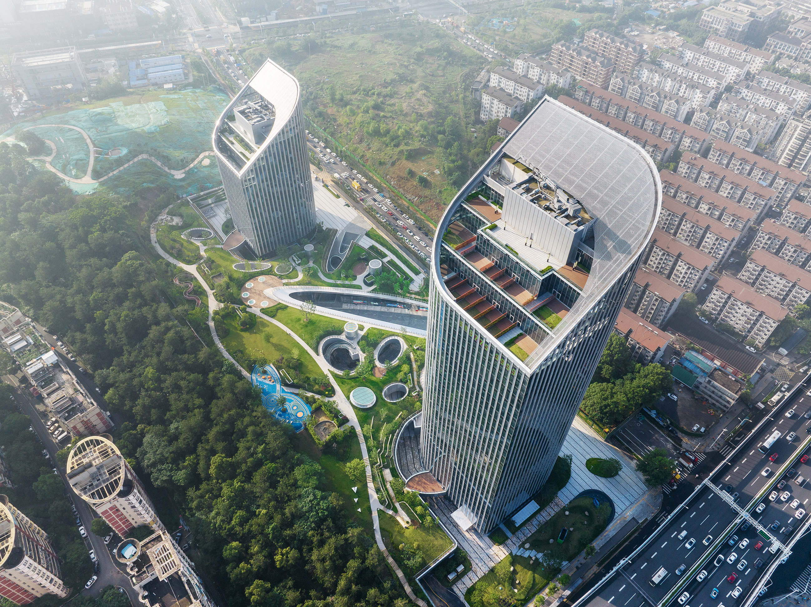 此项目是由航空企业主导,华中首个以航空产业为主导的综合体项目。结合基地的起伏地形,复原了绿丘,在 “中国四大锅炉 “之称的武汉营造了一个清爽开阔的公共空间,为周边带来了新的活力。 在此基础上插入两条轴线与贯穿绿丘的开口,形成了立体的动线。风与光流进绿丘下边的商业和航空展览馆,为来访者提供了舒适且富有吸引力的体验。双塔在各种基地与规范条件的引导下呈现出具有特色的姿态,从不同的角度看呈现不同的视觉效果。