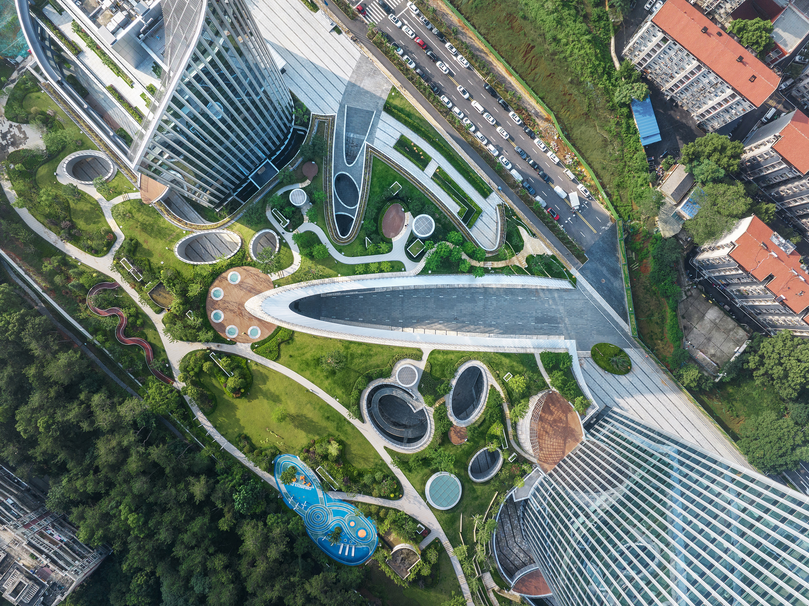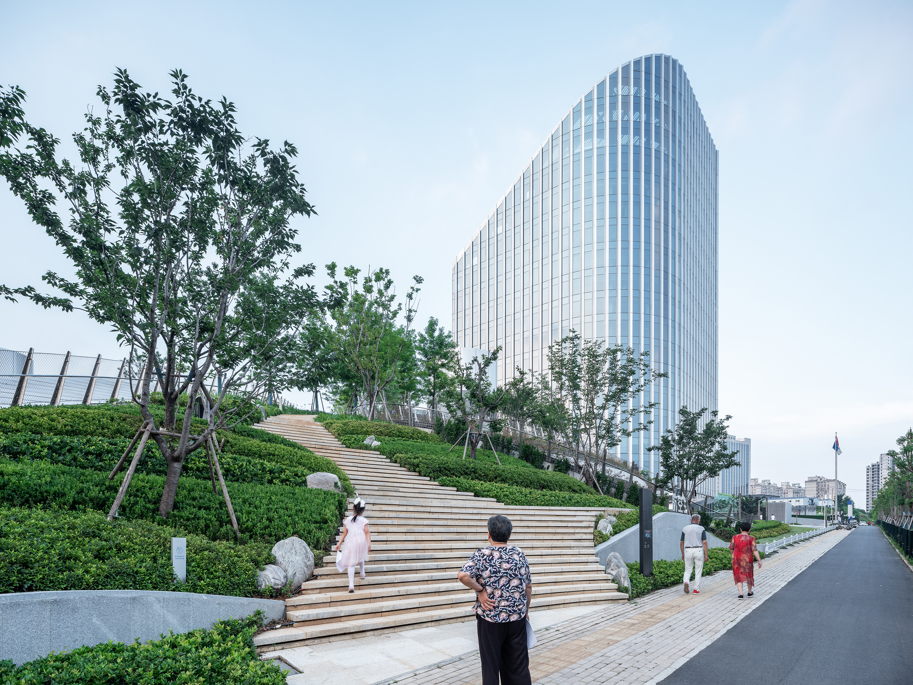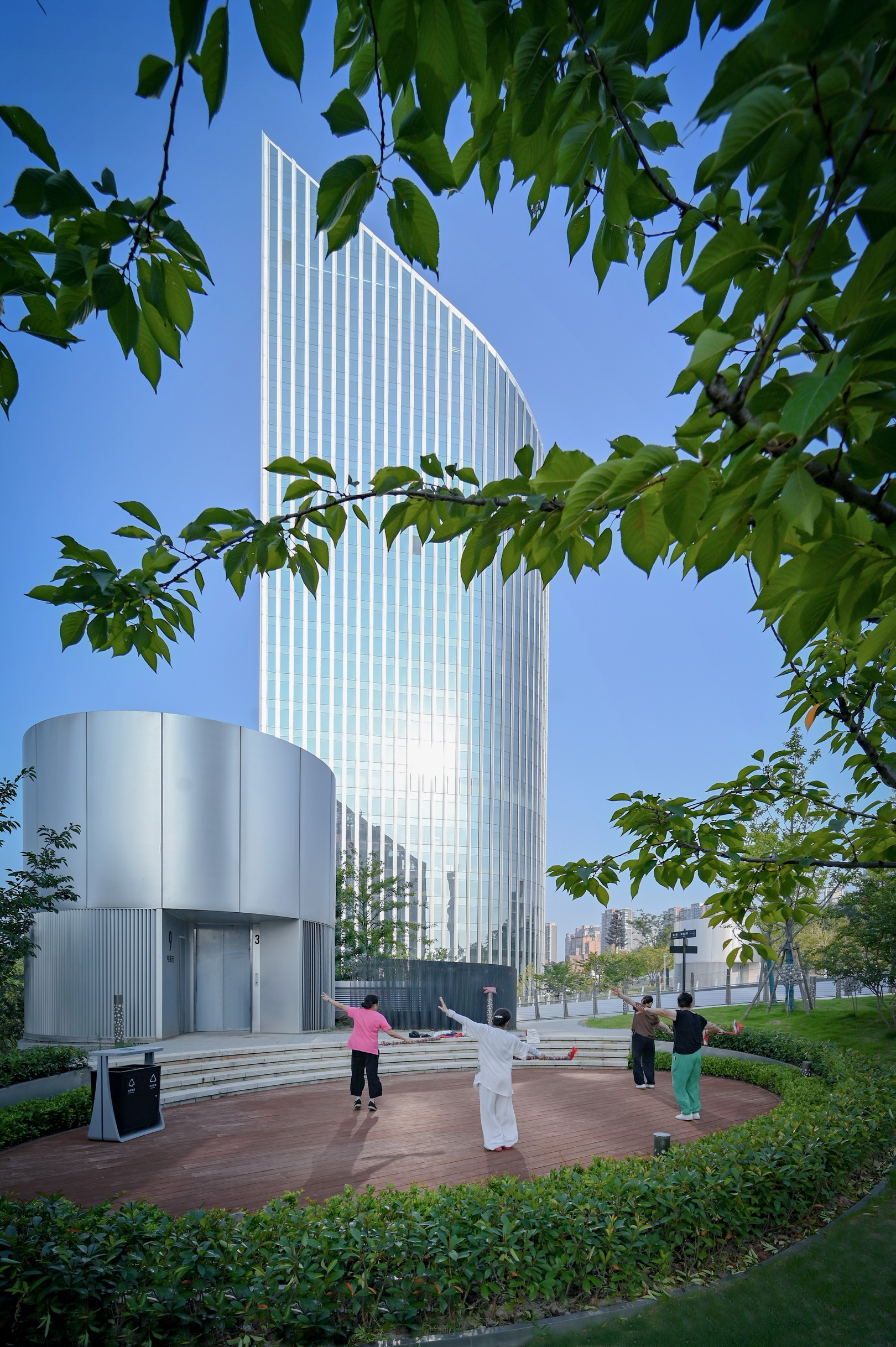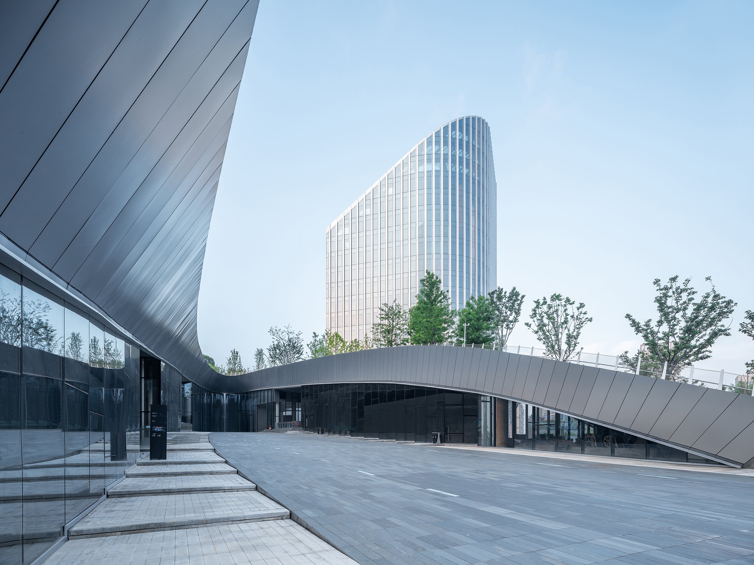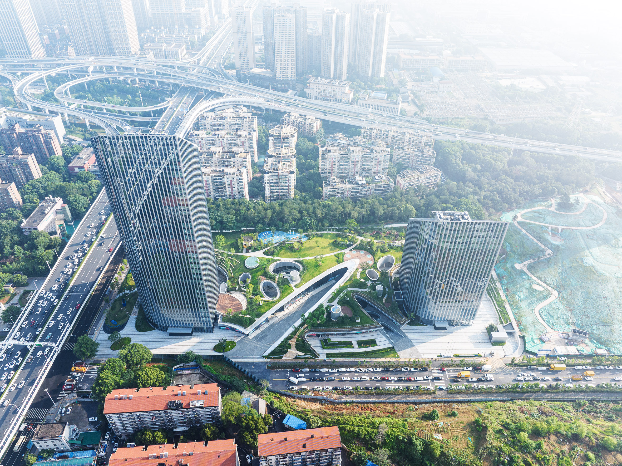此项目是由航空企业主导,华中首个以航空产业为主导的综合体项目。结合基地的起伏地形,复原了绿丘,在 “中国四大锅炉 “之称的武汉营造了一个清爽开阔的公共空间,为周边带来了新的活力。 在此基础上插入两条轴线与贯穿绿丘的开口,形成了立体的动线。风与光流进绿丘下边的商业和航空展览馆,为来访者提供了舒适且富有吸引力的体验。双塔在各种基地与规范条件的引导下呈现出具有特色的姿态,从不同的角度看呈现不同的视觉效果。