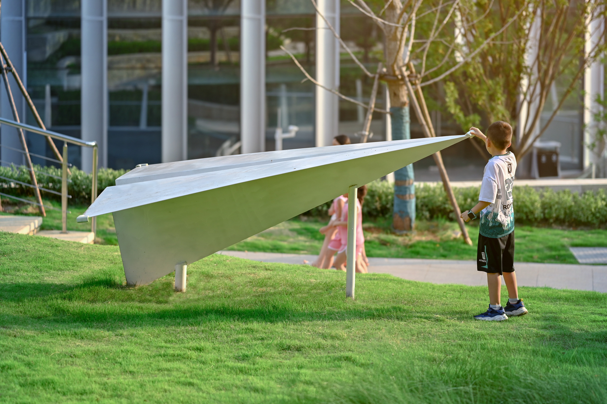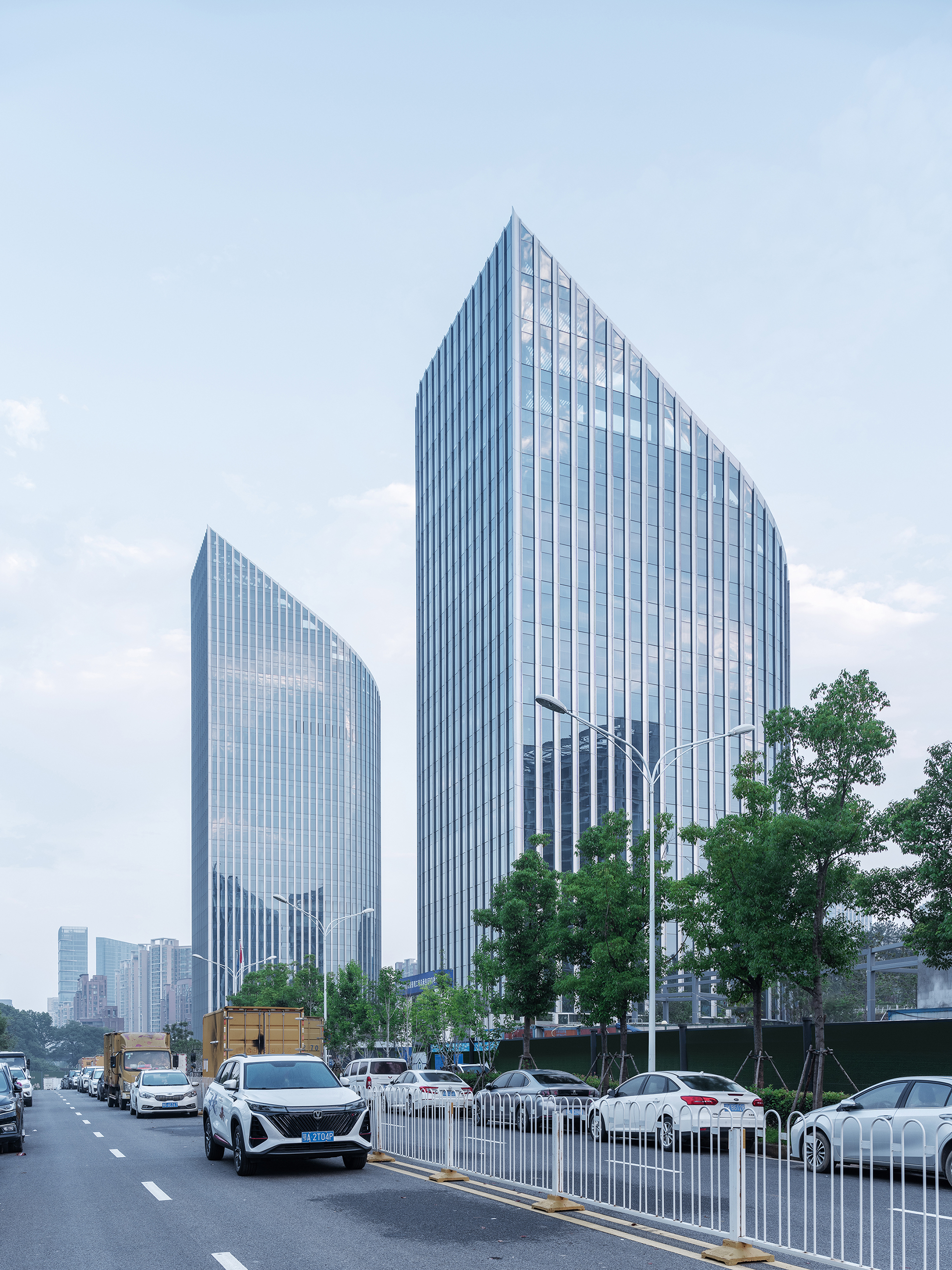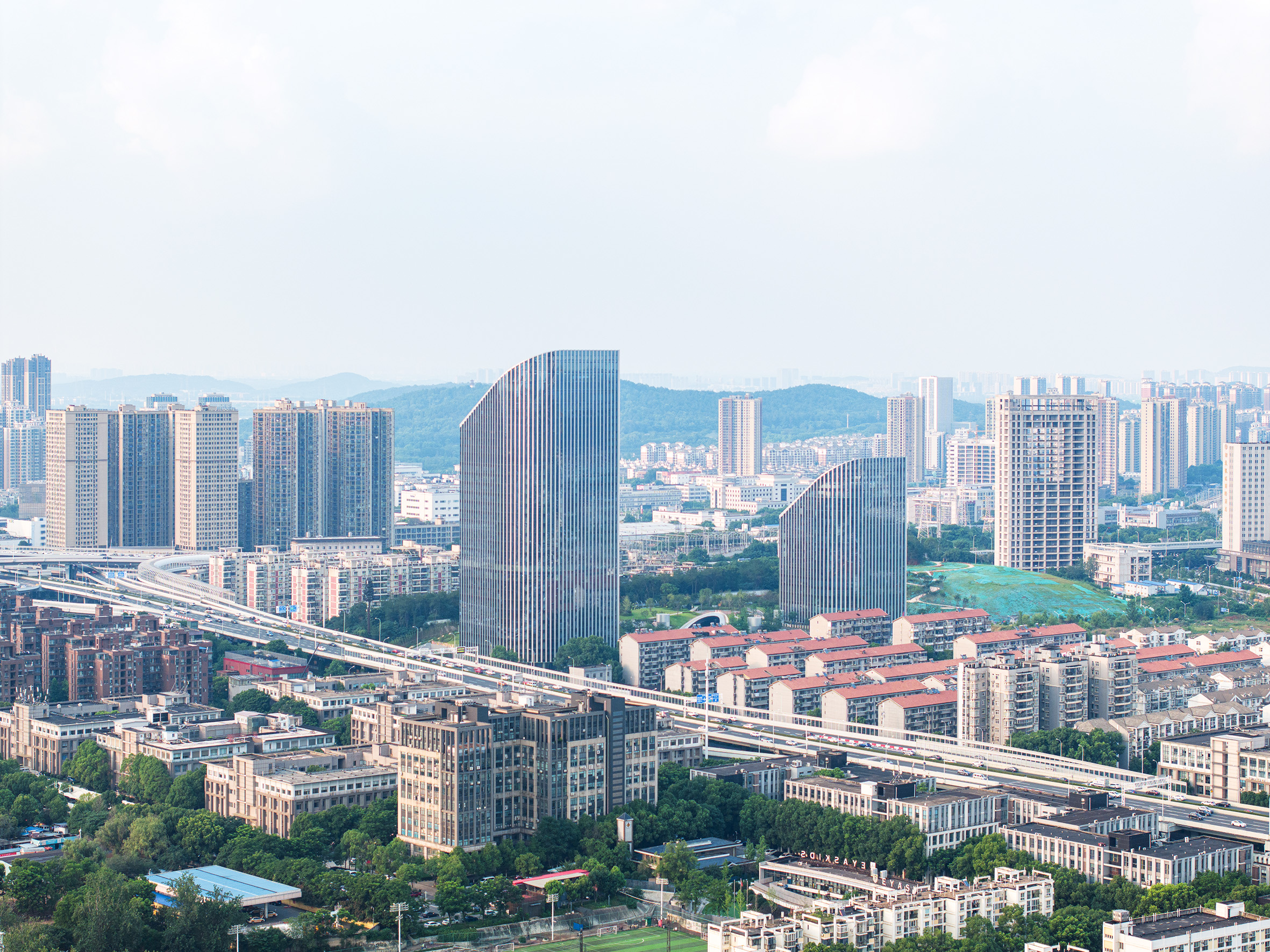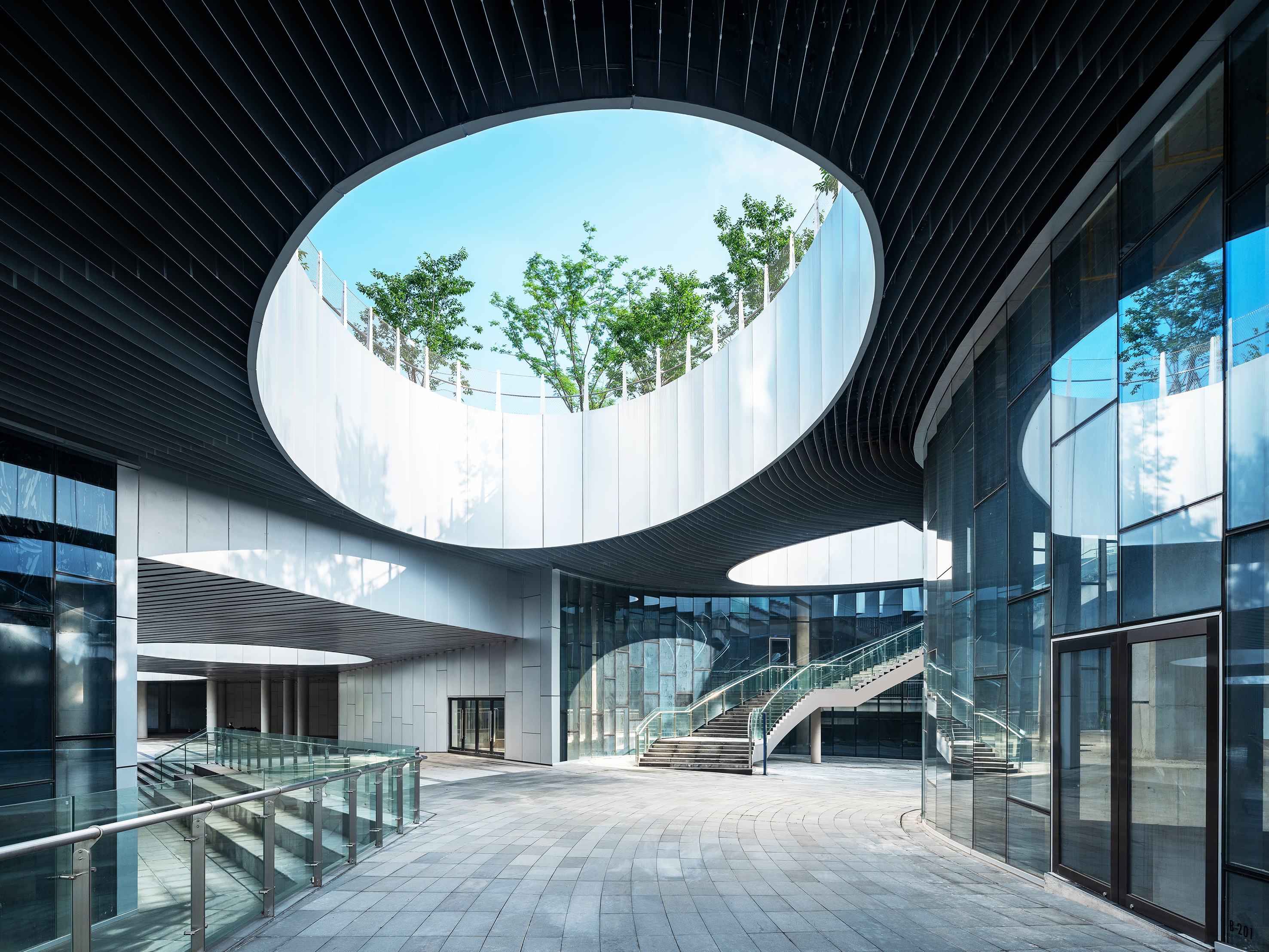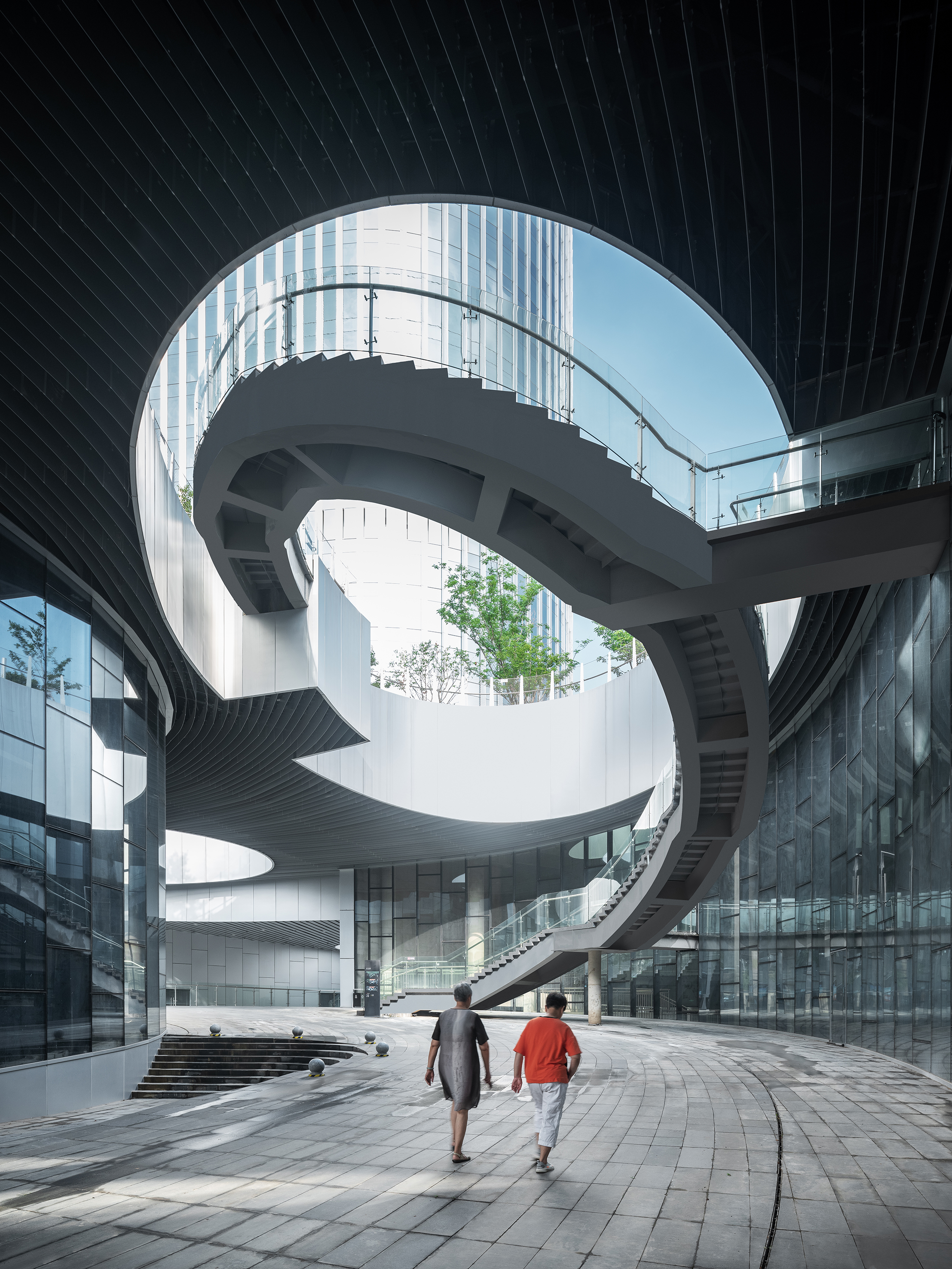 此项目是由航空企业主导,华中首个以航空产业为主导的综合体项目。结合基地的起伏地形,复原了绿丘,在 “中国四大锅炉 “之称的武汉营造了一个清爽开阔的公共空间,为周边带来了新的活力。 在此基础上插入两条轴线与贯穿绿丘的开口,形成了立体的动线。风与光流进绿丘下边的商业和航空展览馆,为来访者提供了舒适且富有吸引力的体验。双塔在各种基地与规范条件的引导下呈现出具有特色的姿态,从不同的角度看呈现不同的视觉效果。