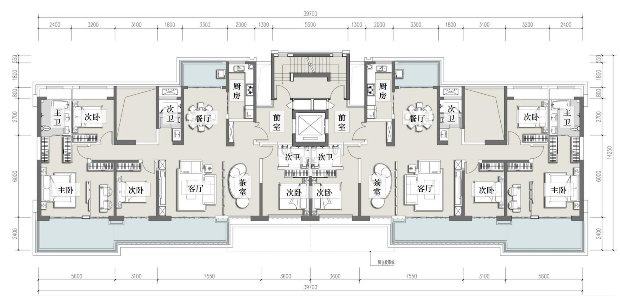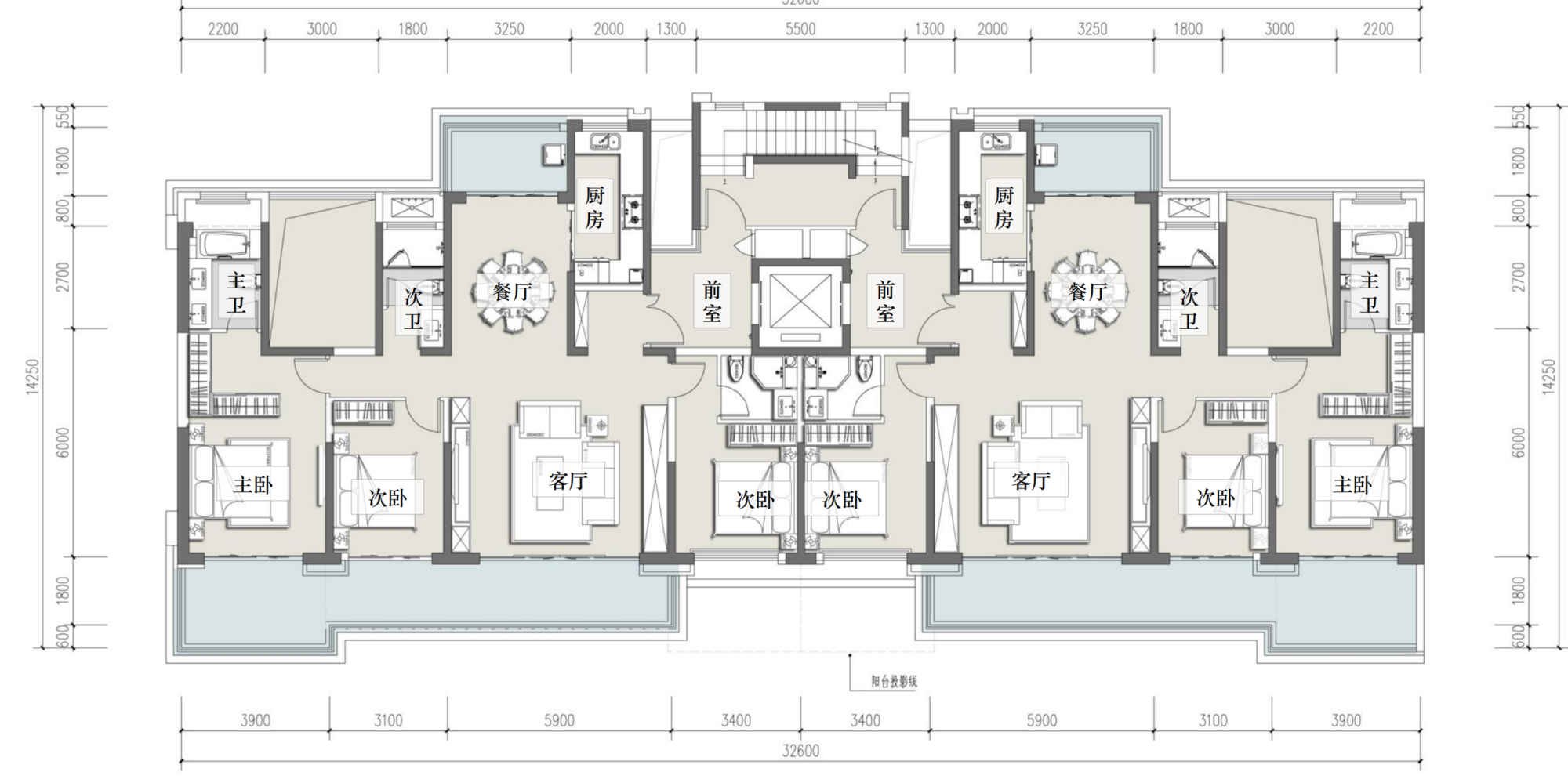 住宅通过建筑形体的变化、结合线脚、材质等来塑造清晰明确建筑形象,对称构图、刚柔并济的横竖线条则体现了建筑挺拔稳重的建筑个性,以形成协调怡人的居住空间。
